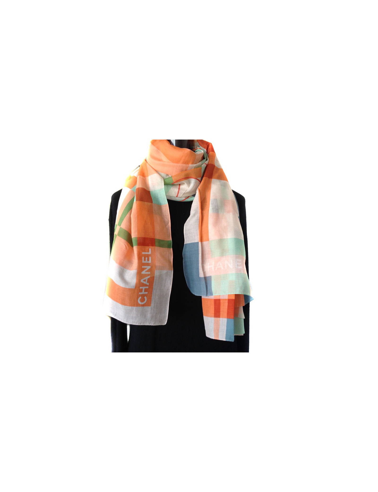 Foulard CHANEL en coton, motifs géométriques multicolores, tons pastels avec un grand CC au centre.