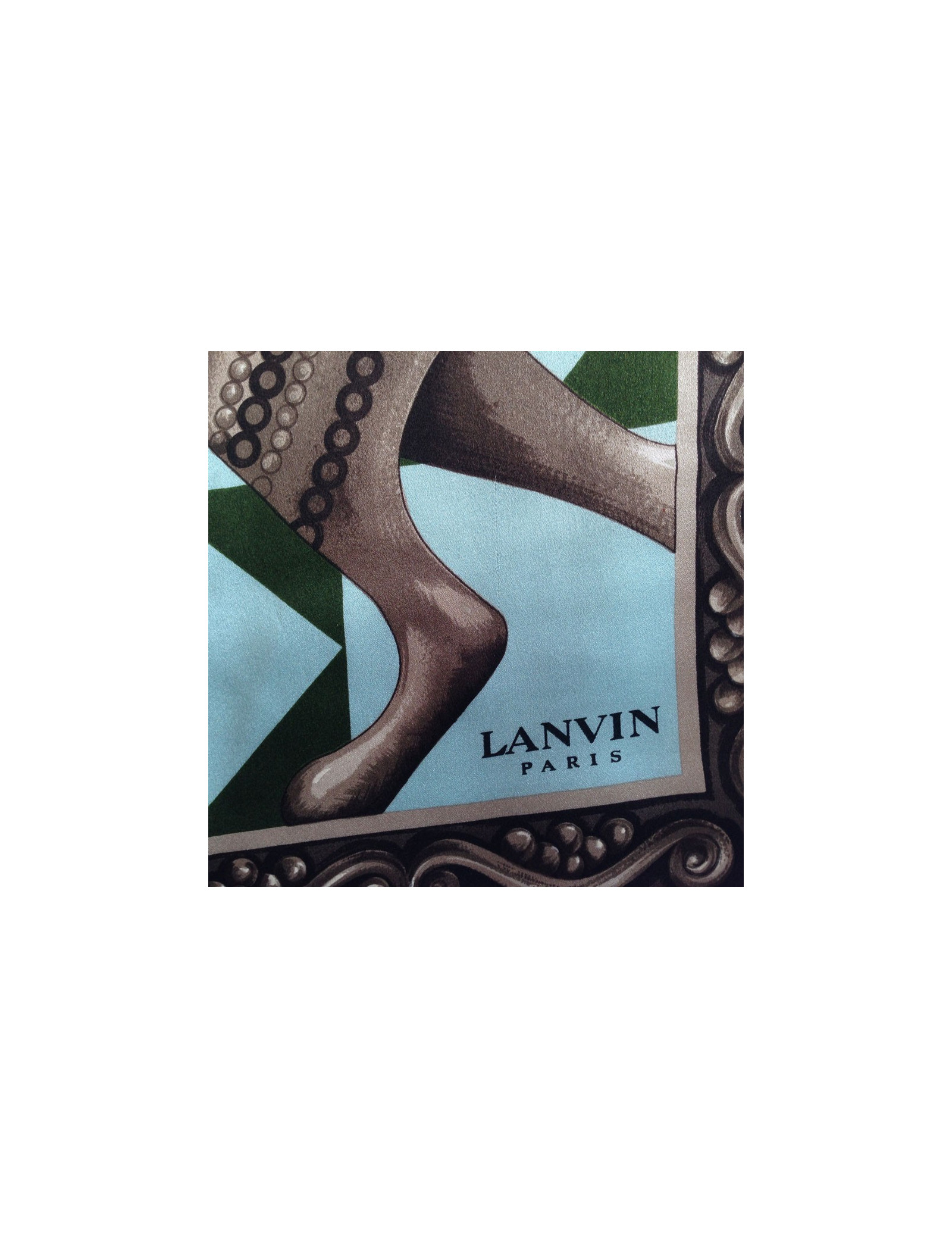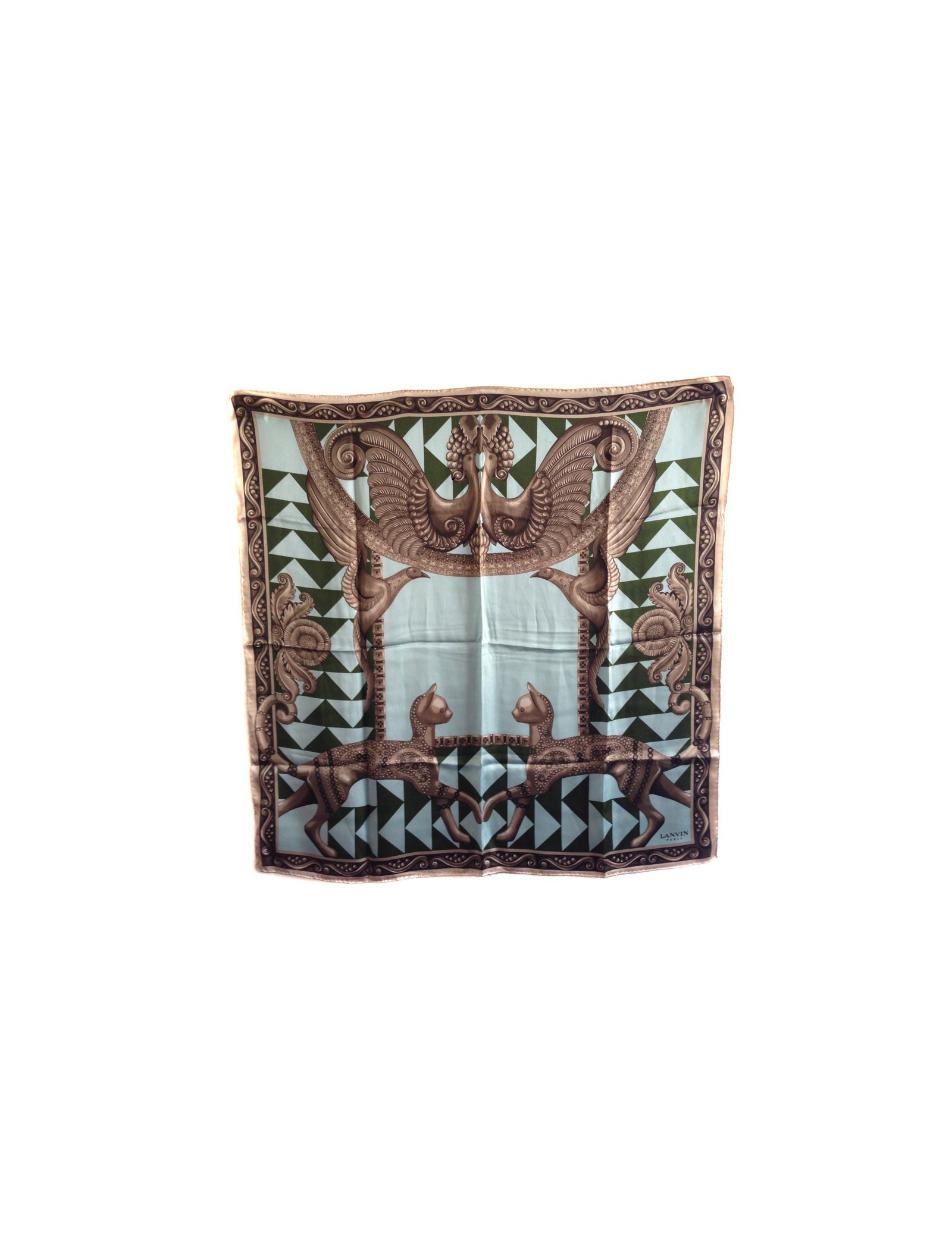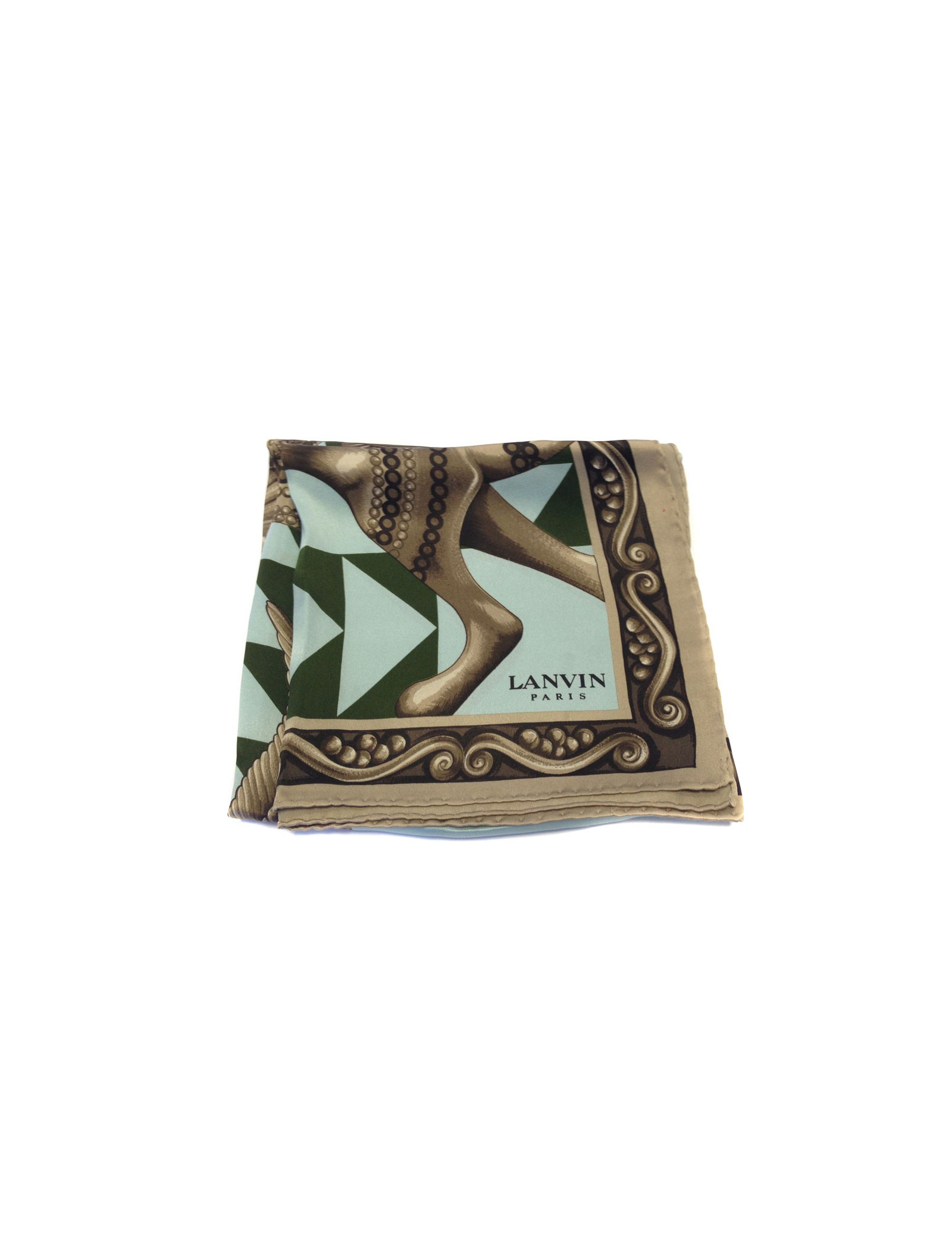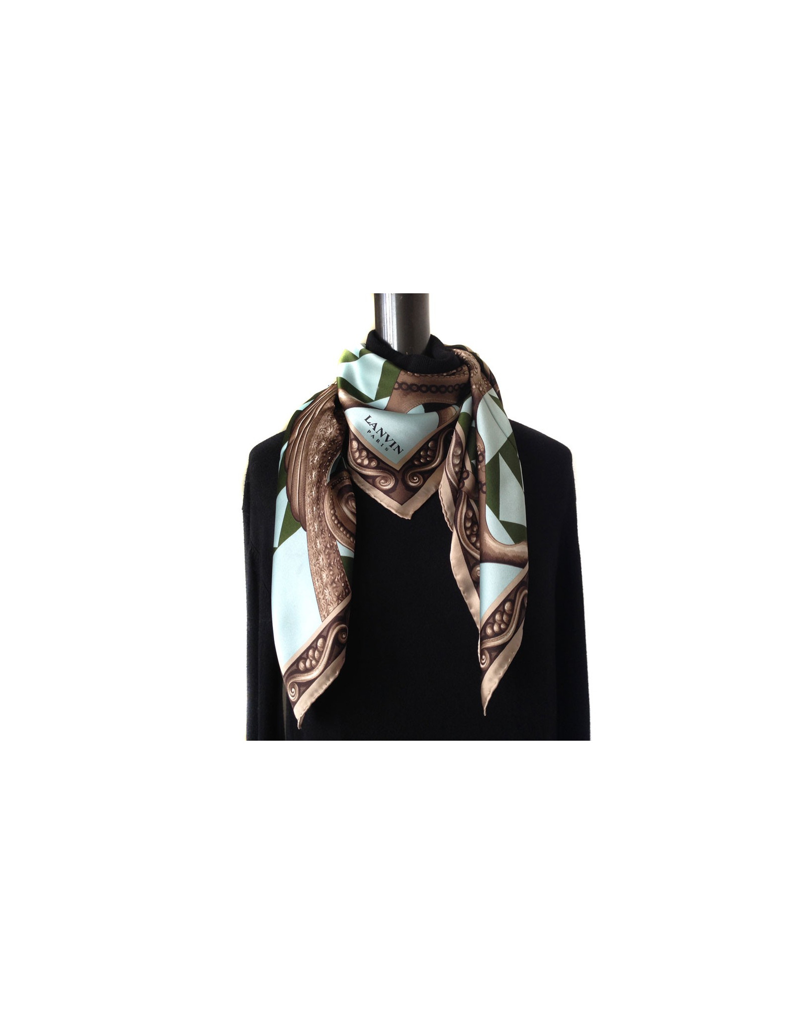 Foulard LANVIN en soie bronze et bleu. Le roulotté est en bon état, légèrement décousu sur un coin.