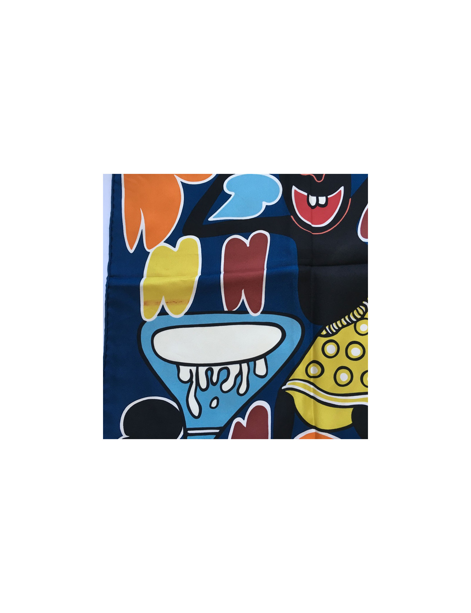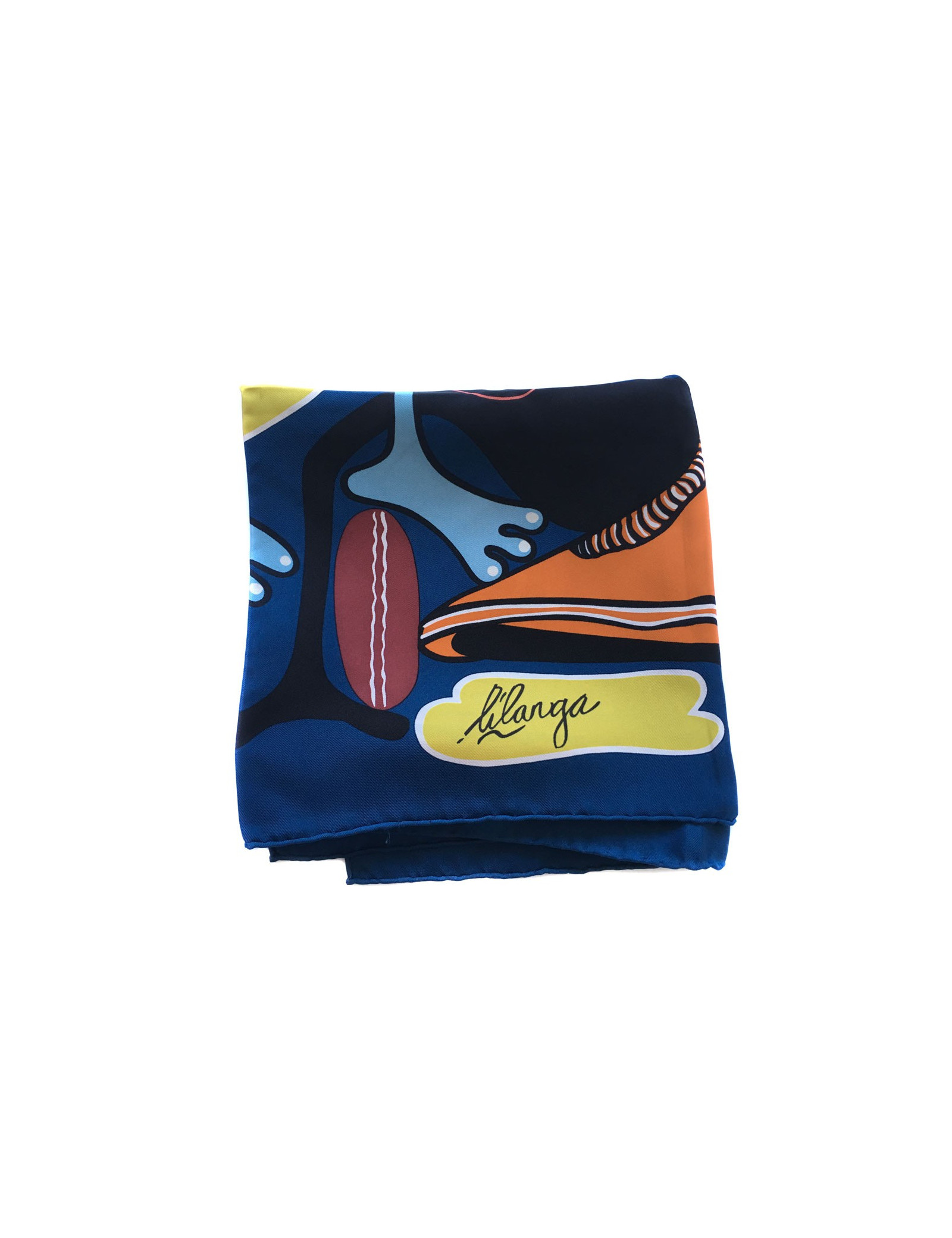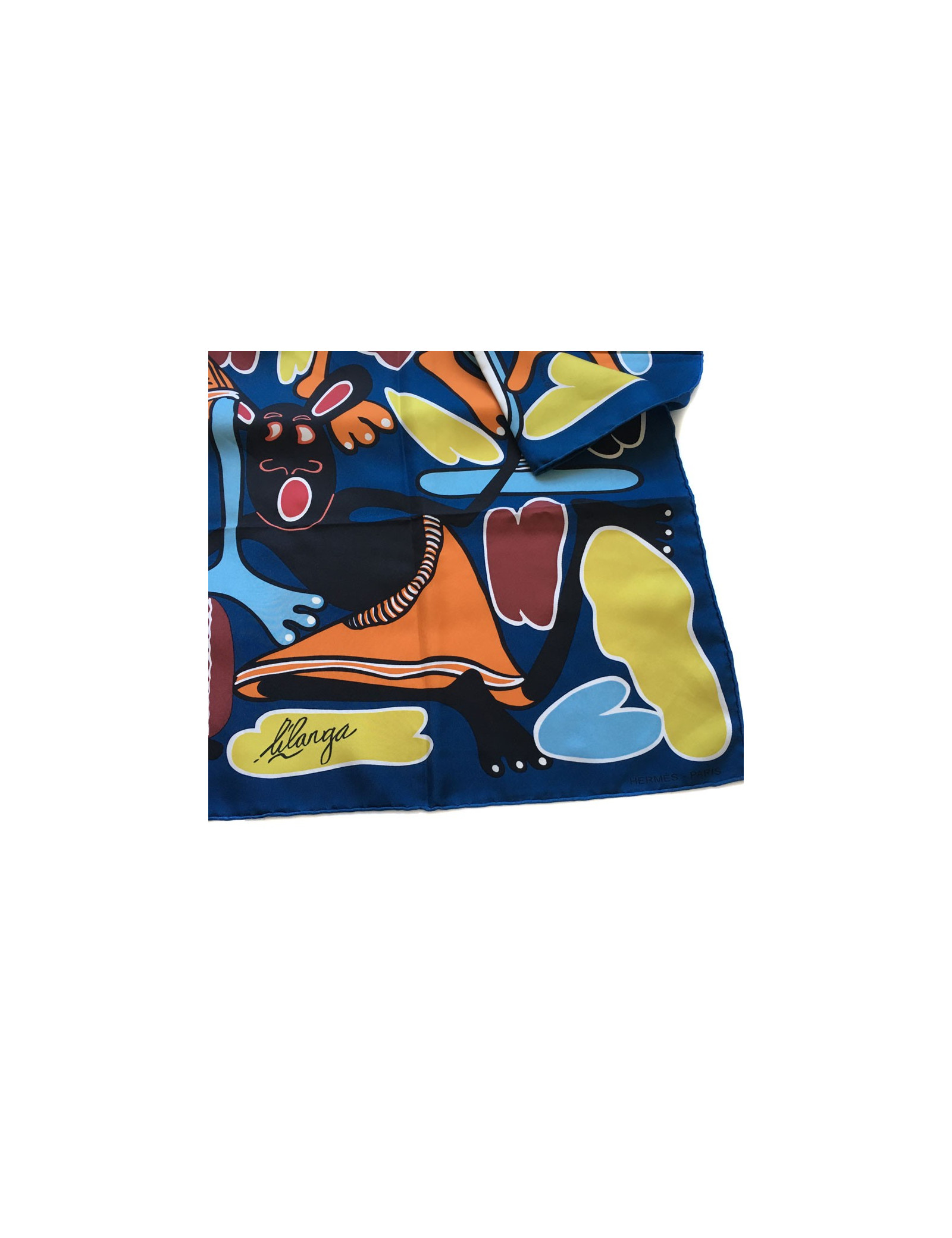 Carré HERMES "Lilanga" en soie bleu. En très bon état malgré une tâche sur le haut du carré et sur l'envers (sur le personnage bleu). Le roulotté est impeccable.