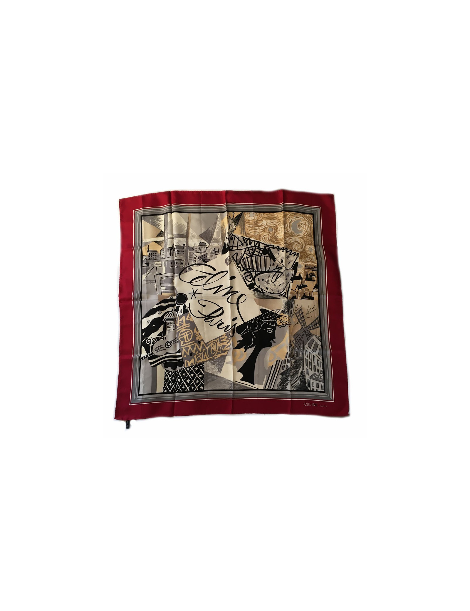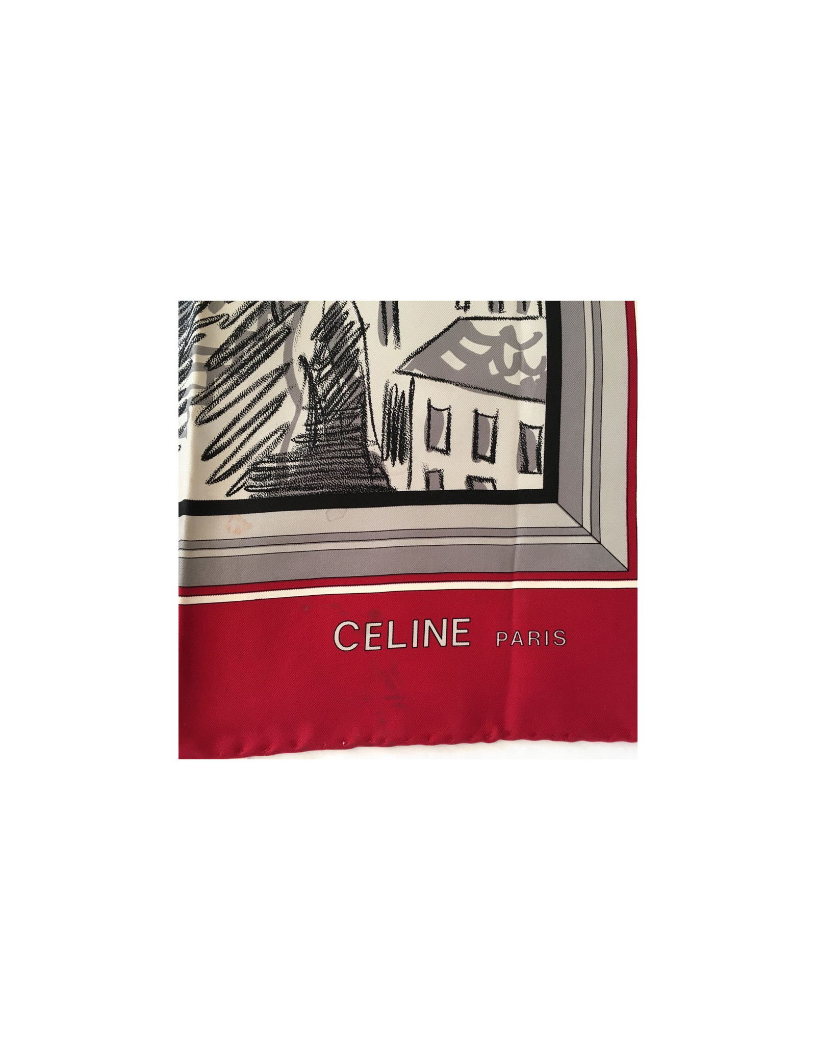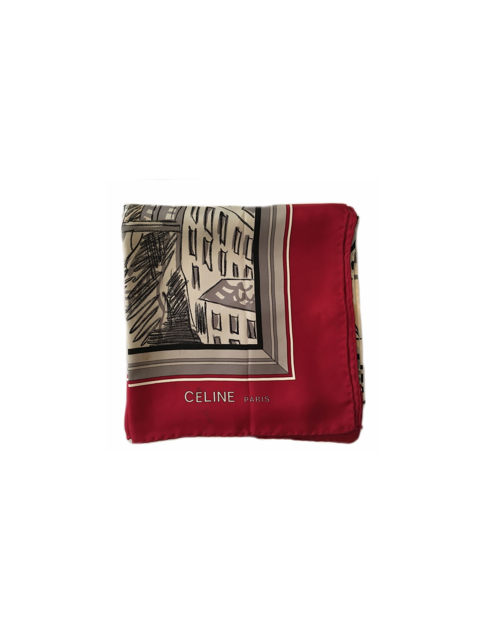 Carré de soie CELINE "Paris" dans les tons rouges, gris, noir. Foulard vintage.