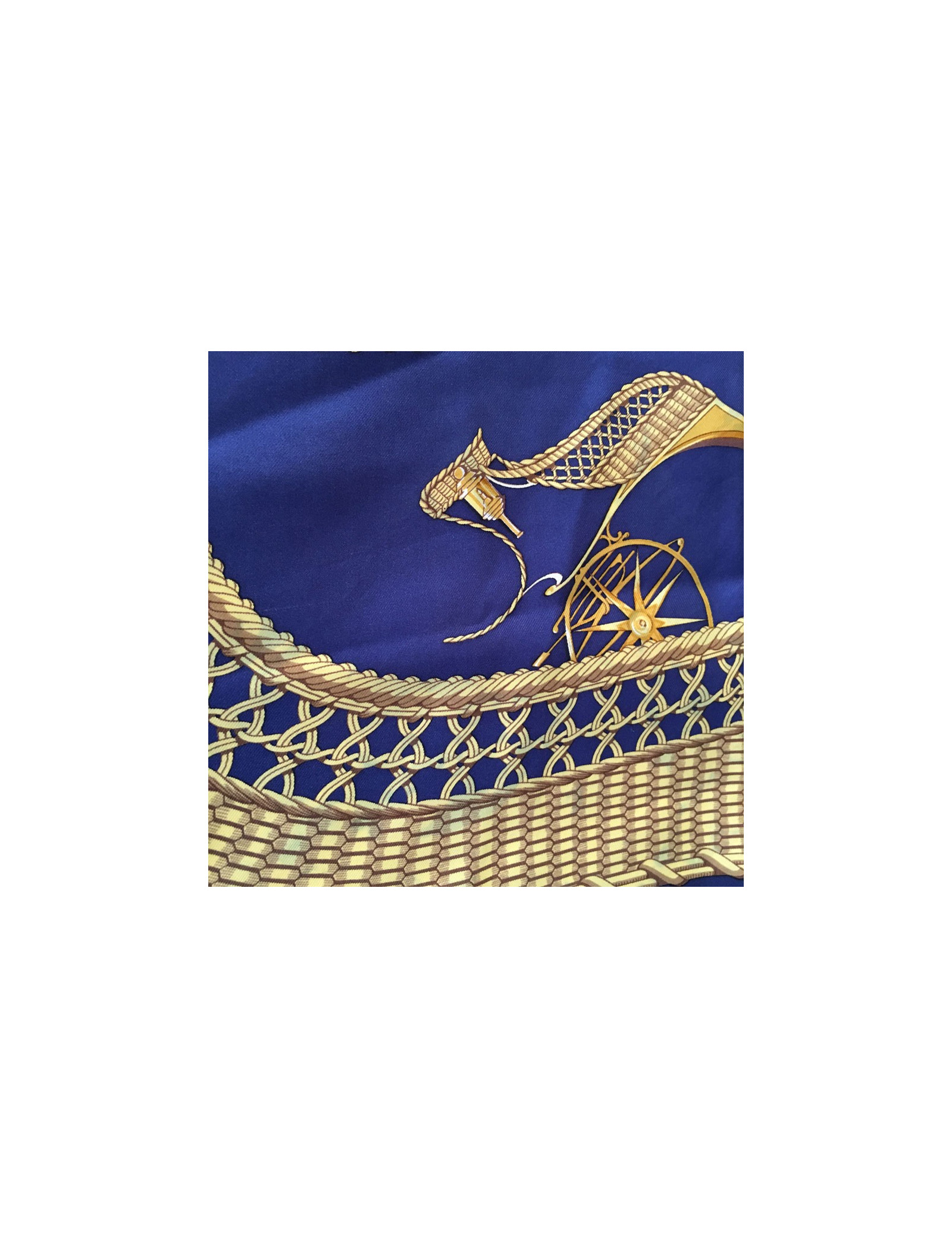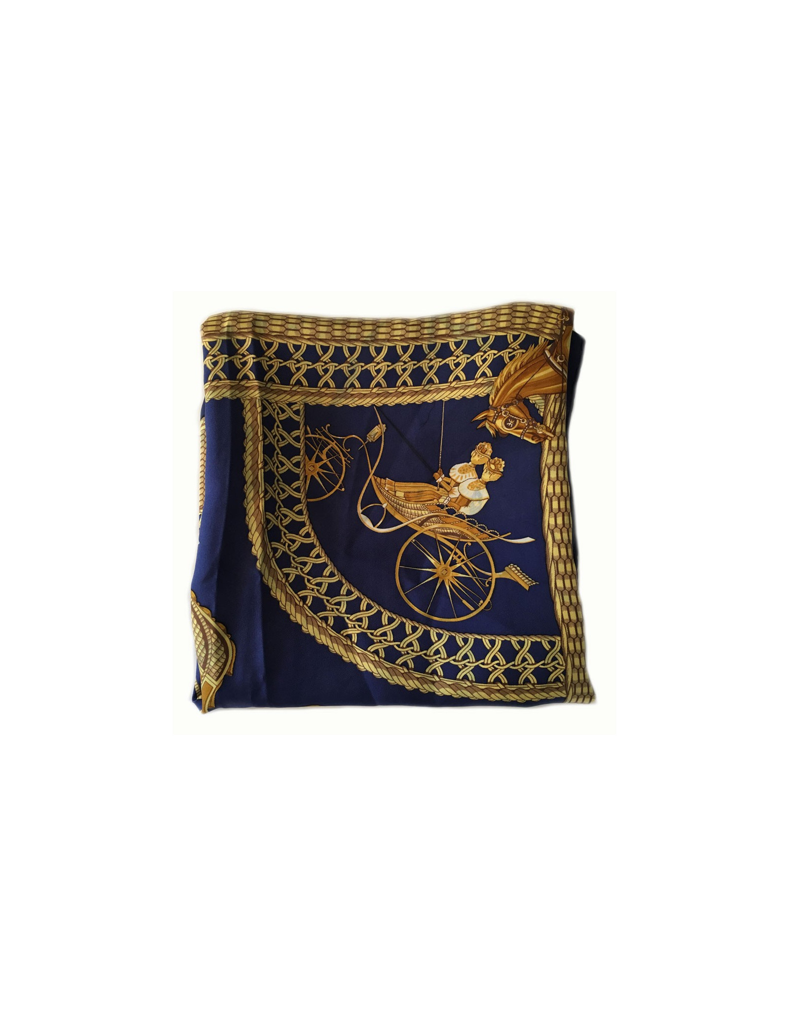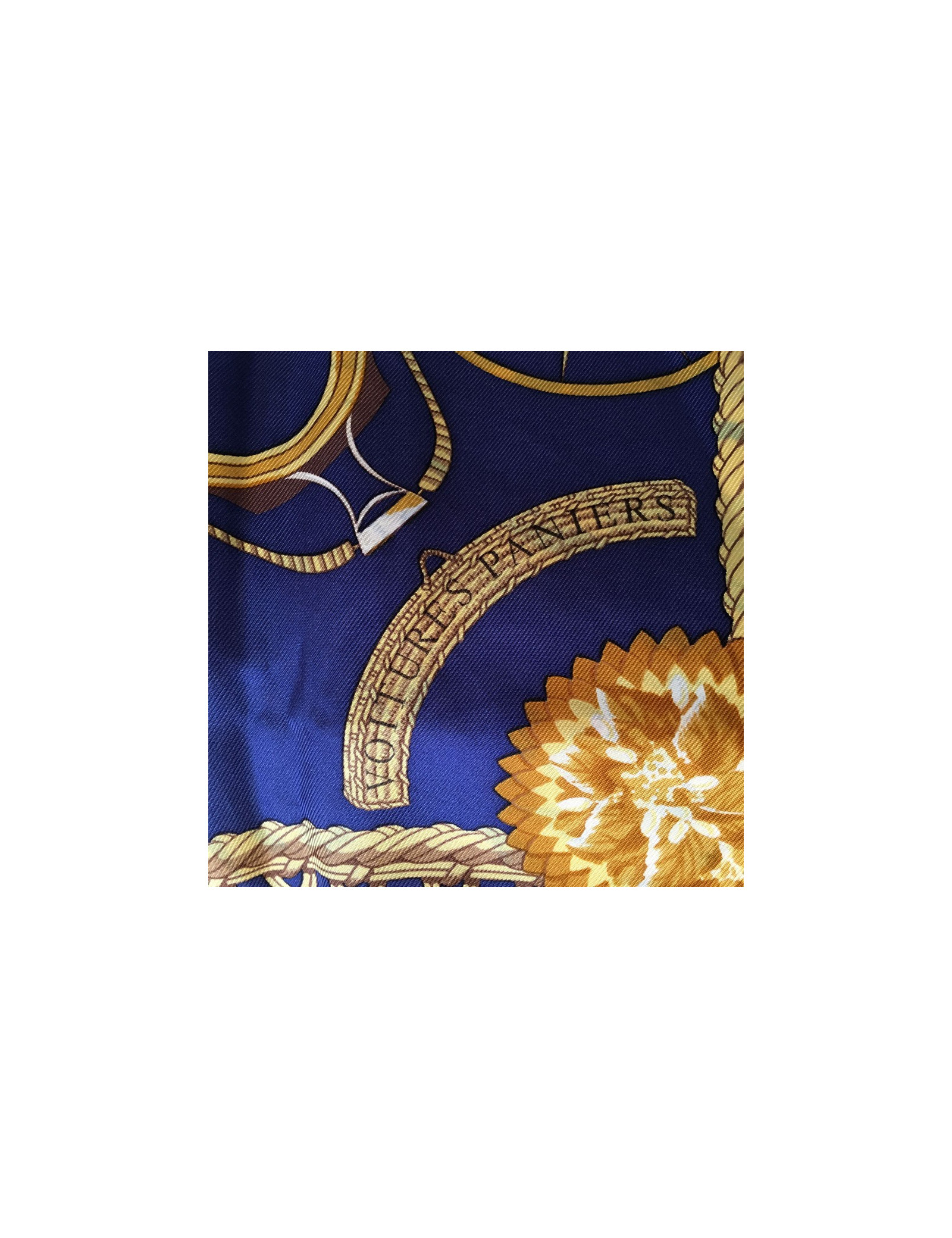 Carré de soie HERMES "Voitures Paniers" bleu foncé et or. De petites décolorations de bleu sur l'or sont présentes sur le carré (voir photos). Le roulotté est impeccable. Absence d'étiquette matière. En très bon état.