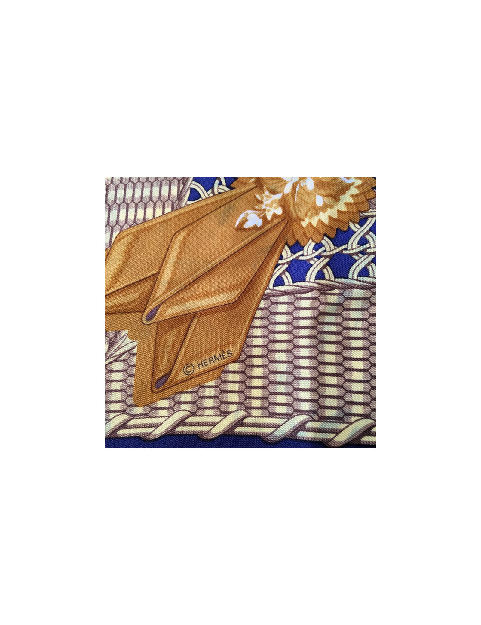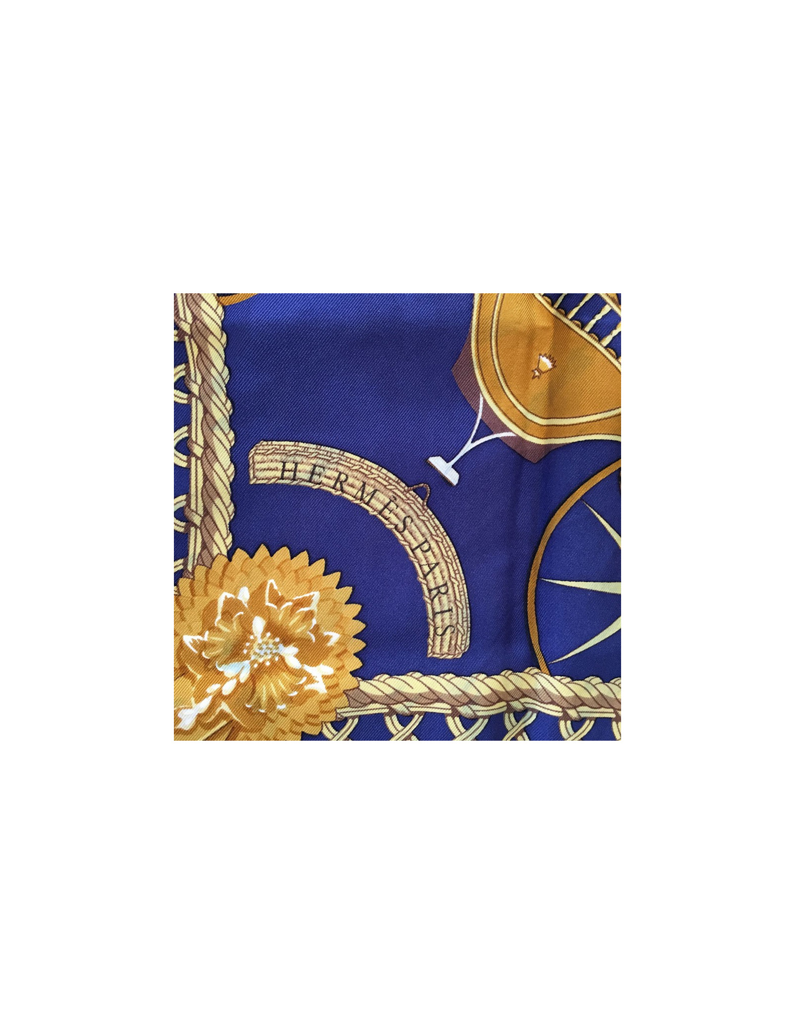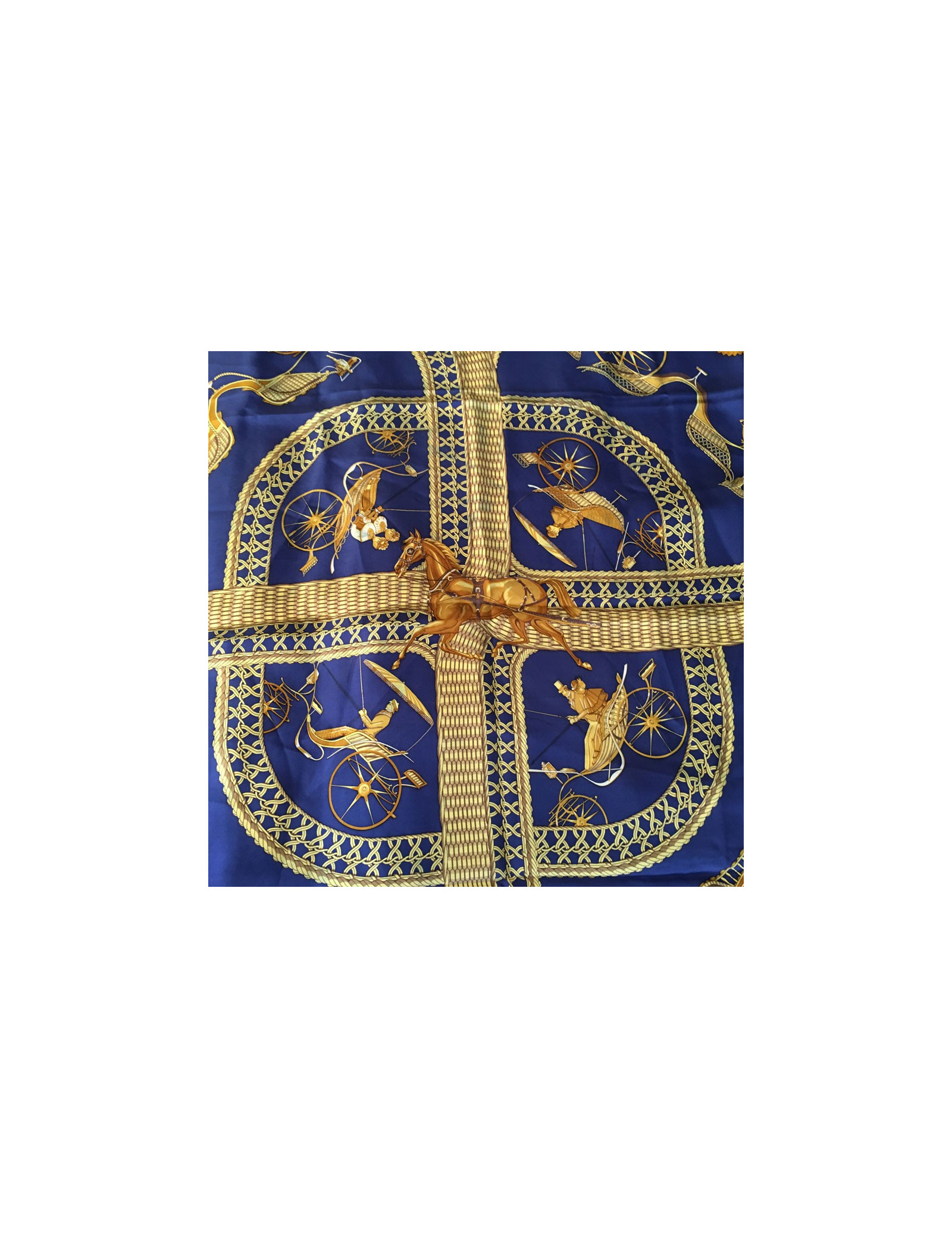 Carré de soie HERMES "Voitures Paniers" bleu foncé et or. De petites décolorations de bleu sur l'or sont présentes sur le carré (voir photos). Le roulotté est impeccable. Absence d'étiquette matière. En très bon état.