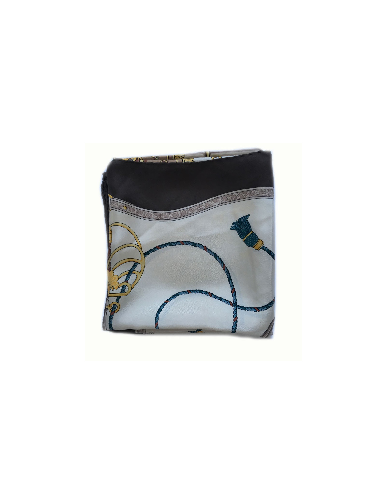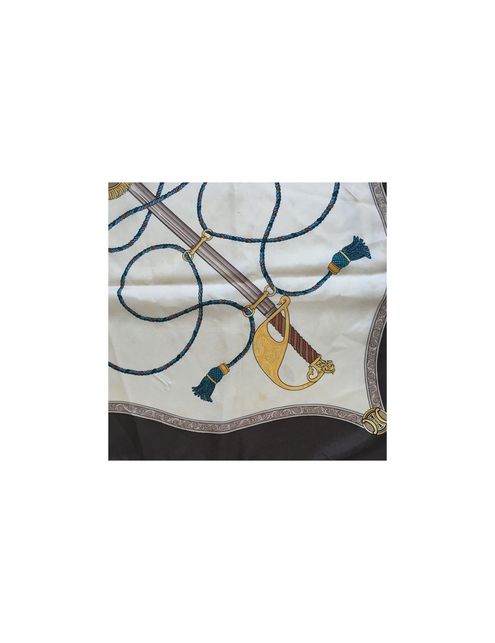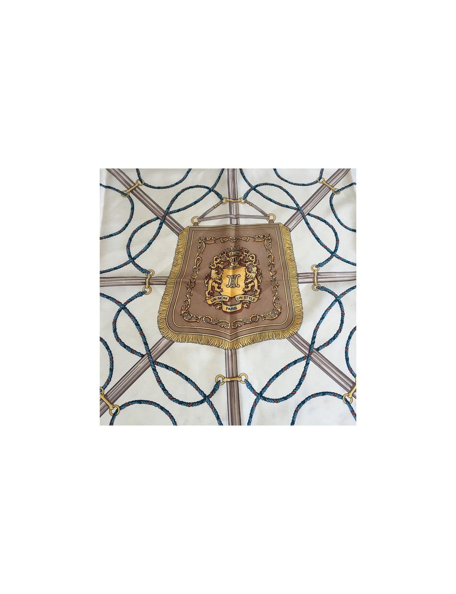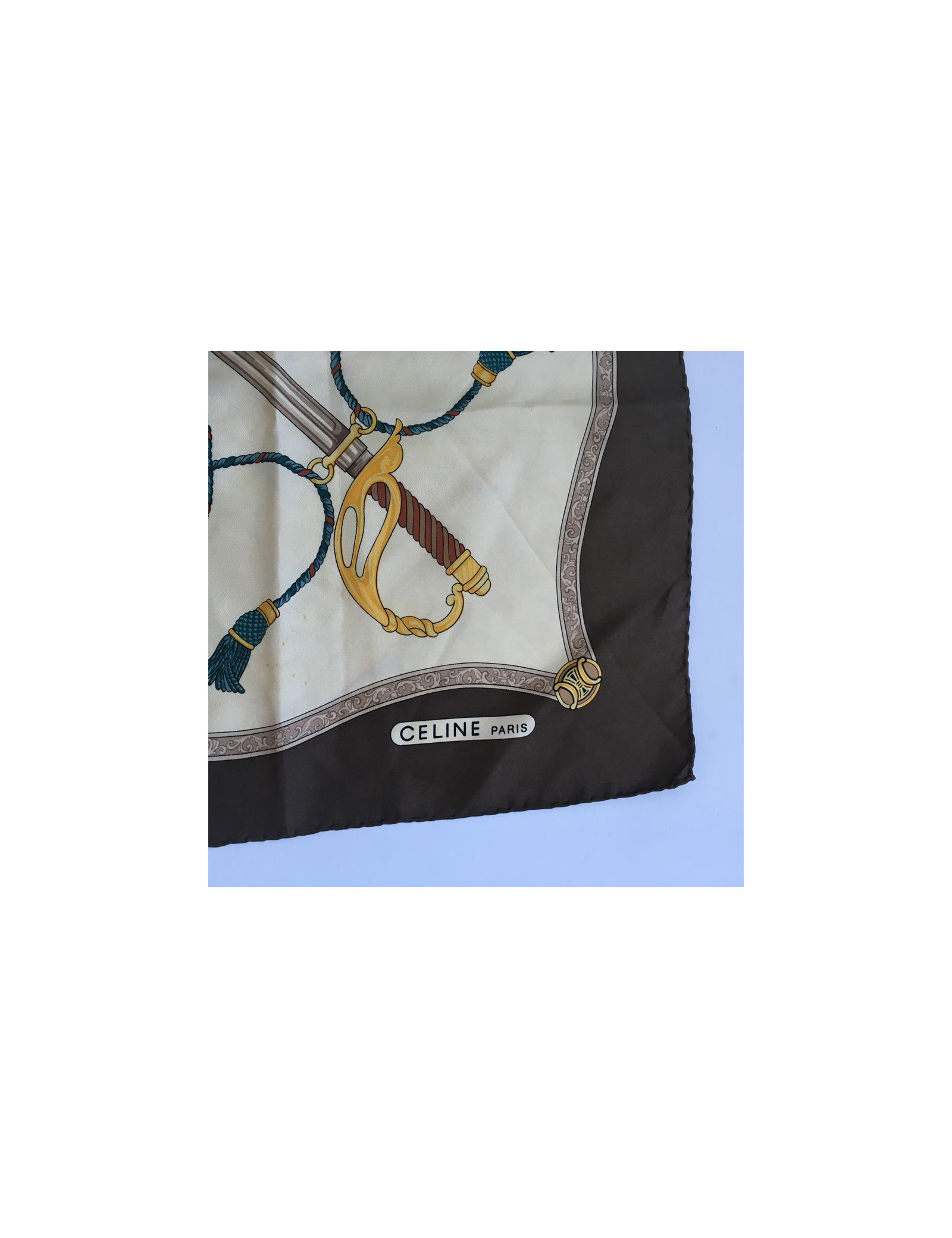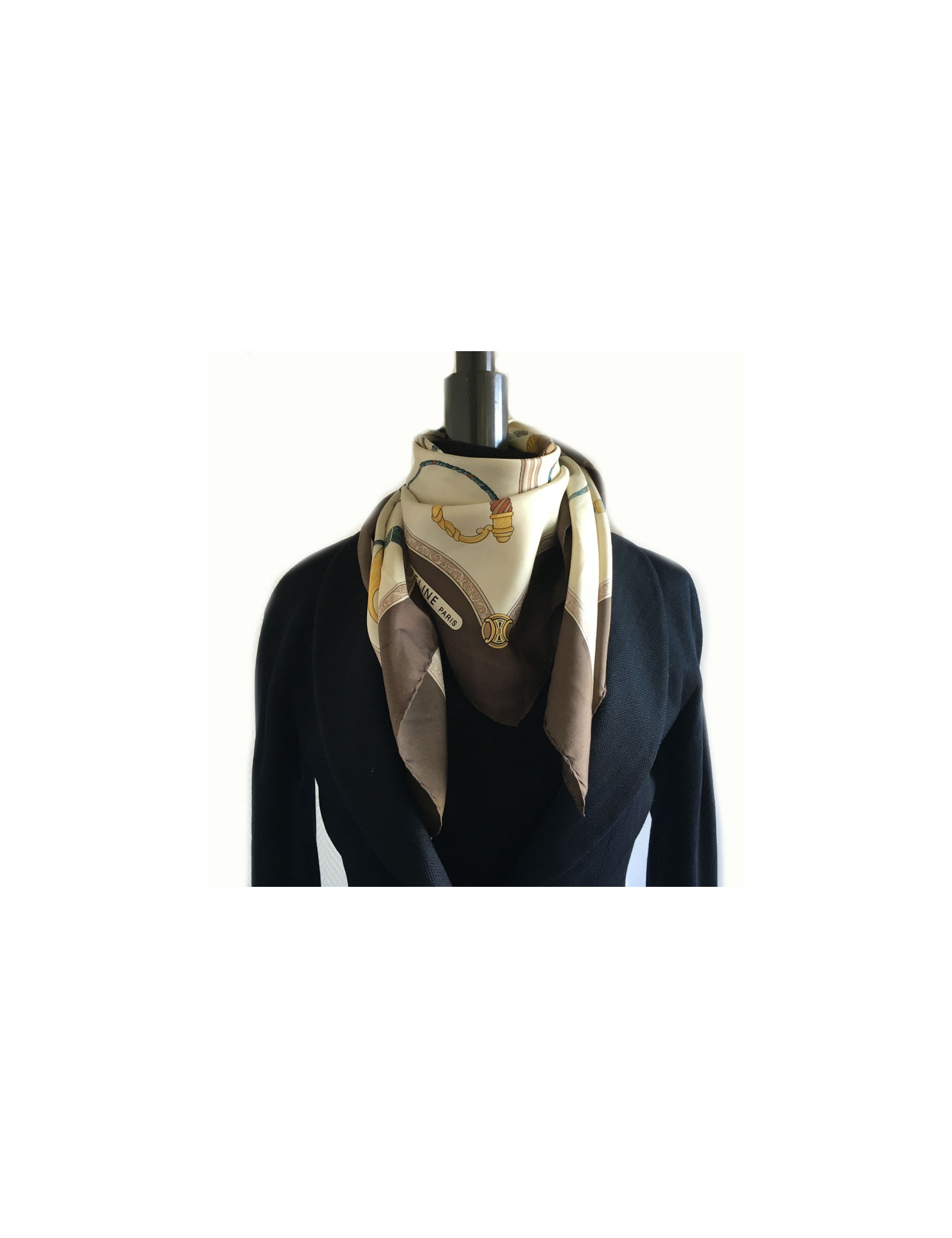 Foulard CELINE "Un nom, un style" en soie. Bordure chocolat, fond écru à motifs multicolores.