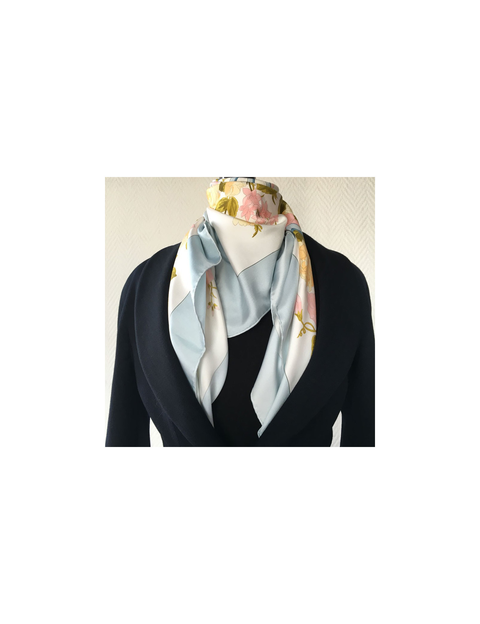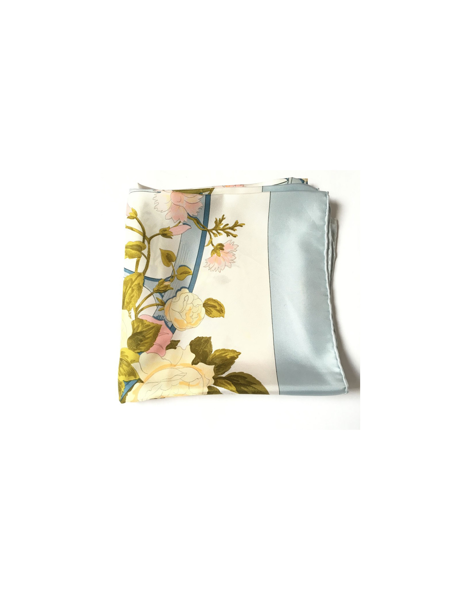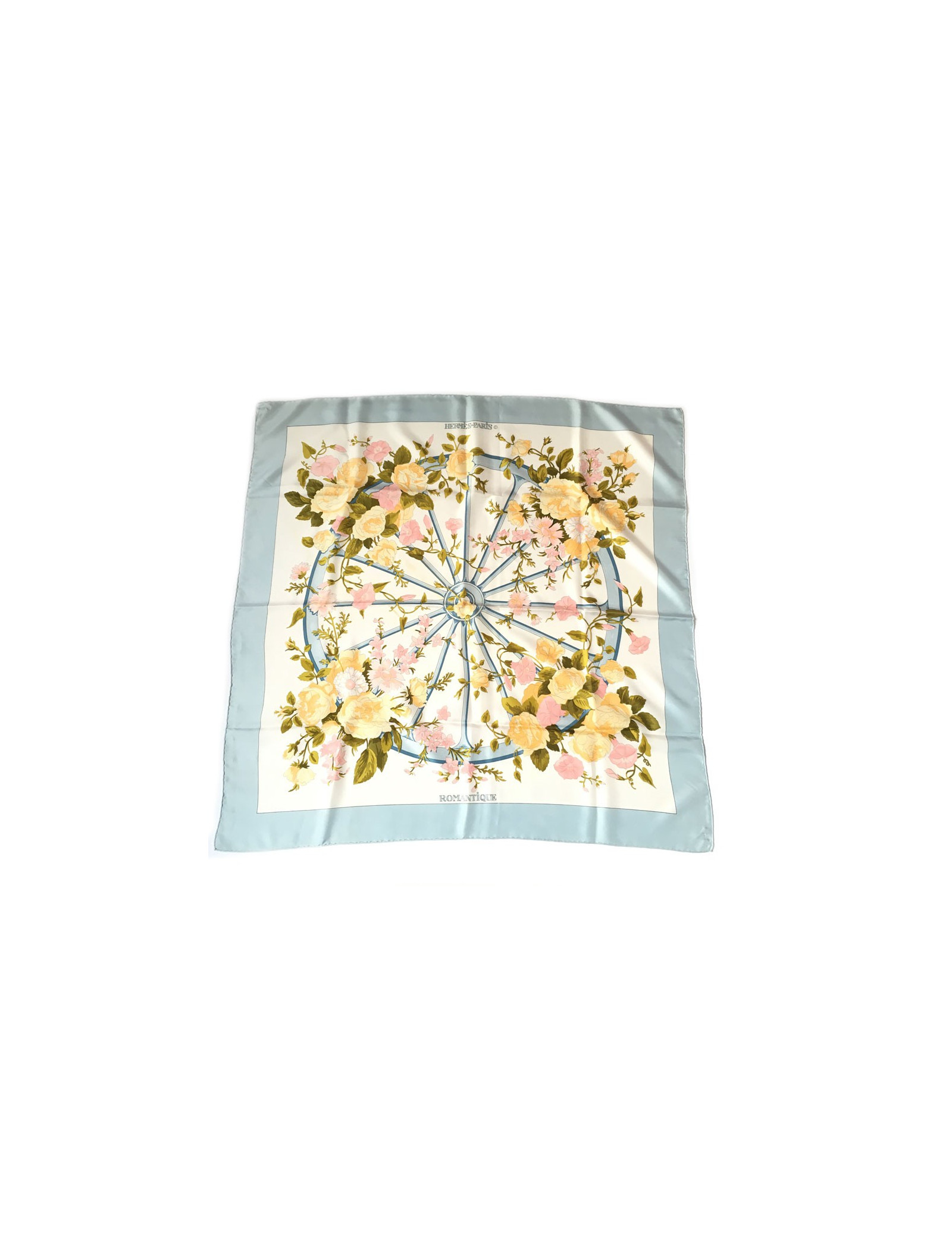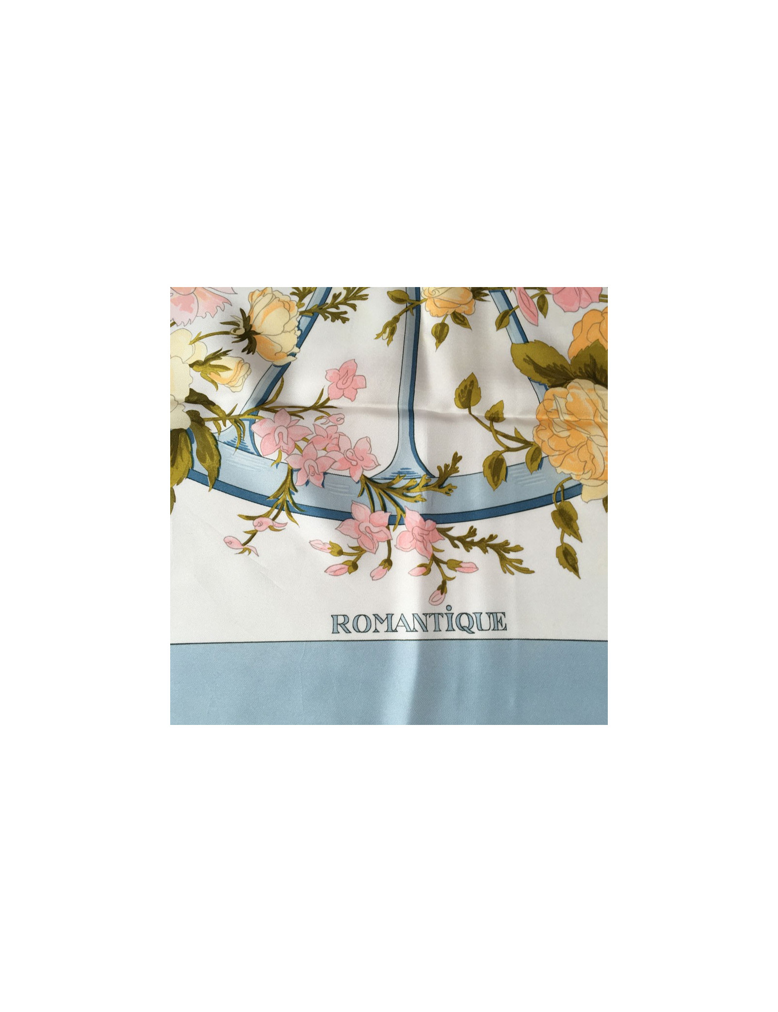 Carré HERMES "Romantique" en soie. Bordure bleue ciel et fond floral dans les tons roses, verts et jaune clair.