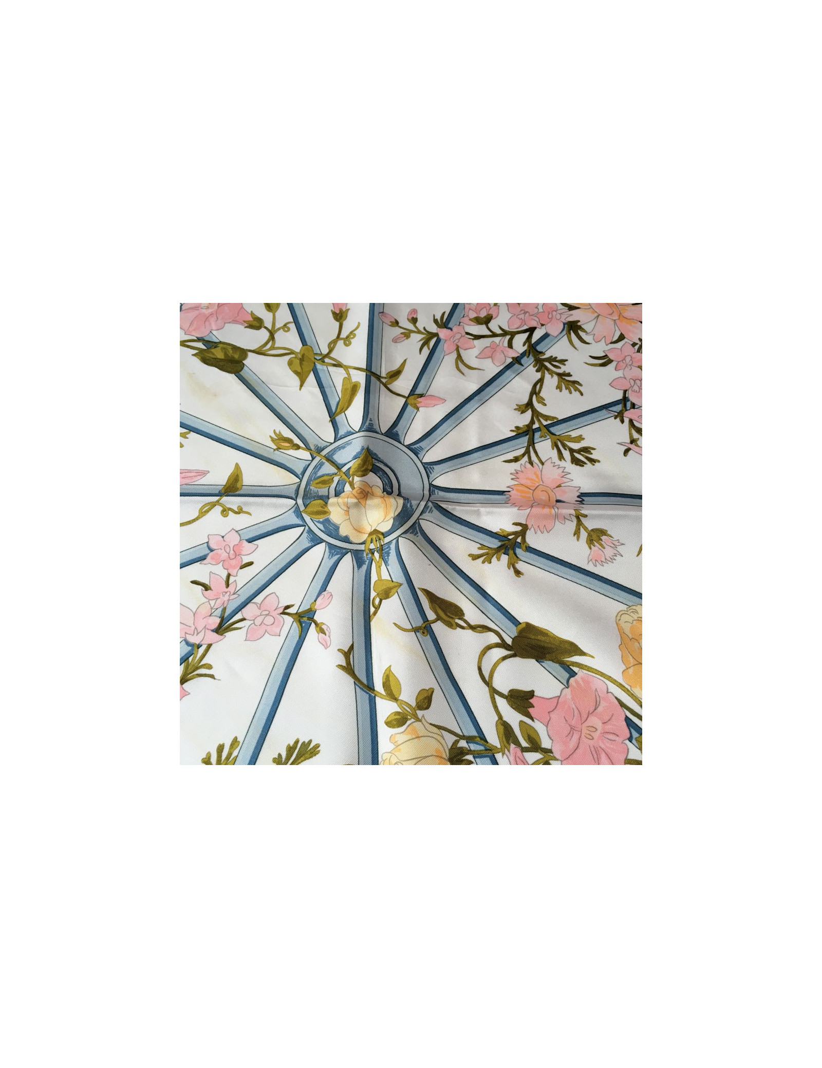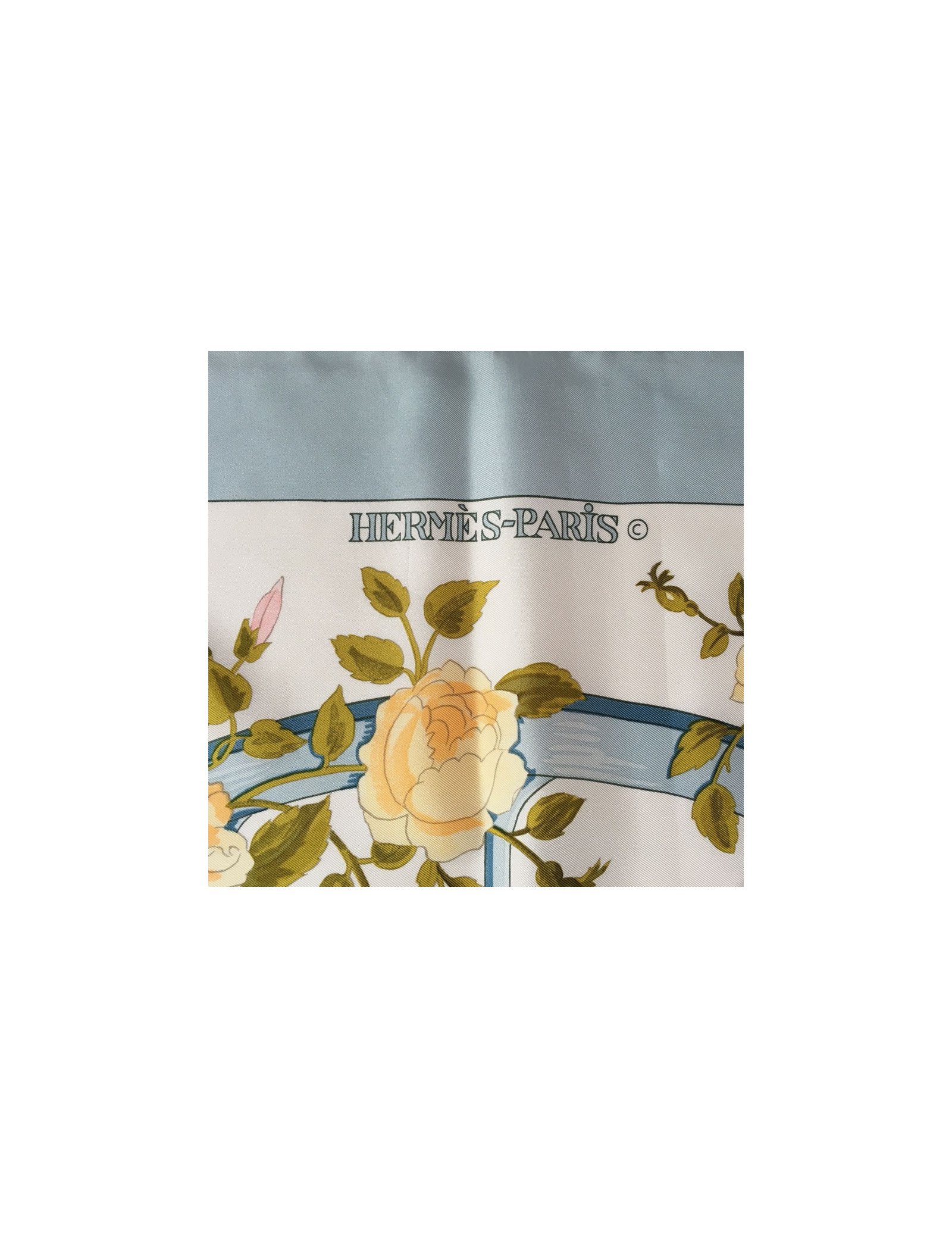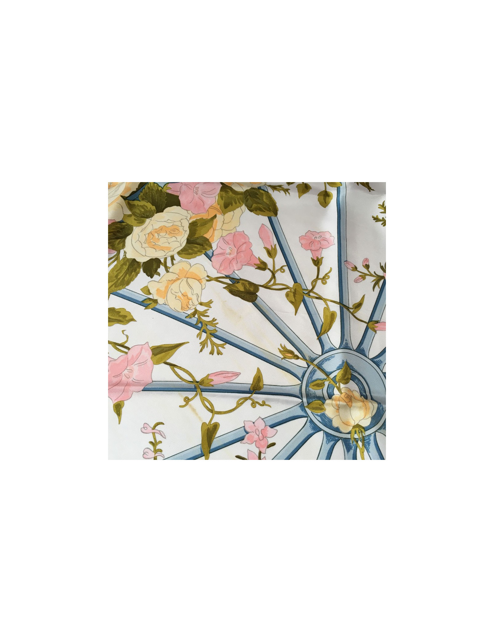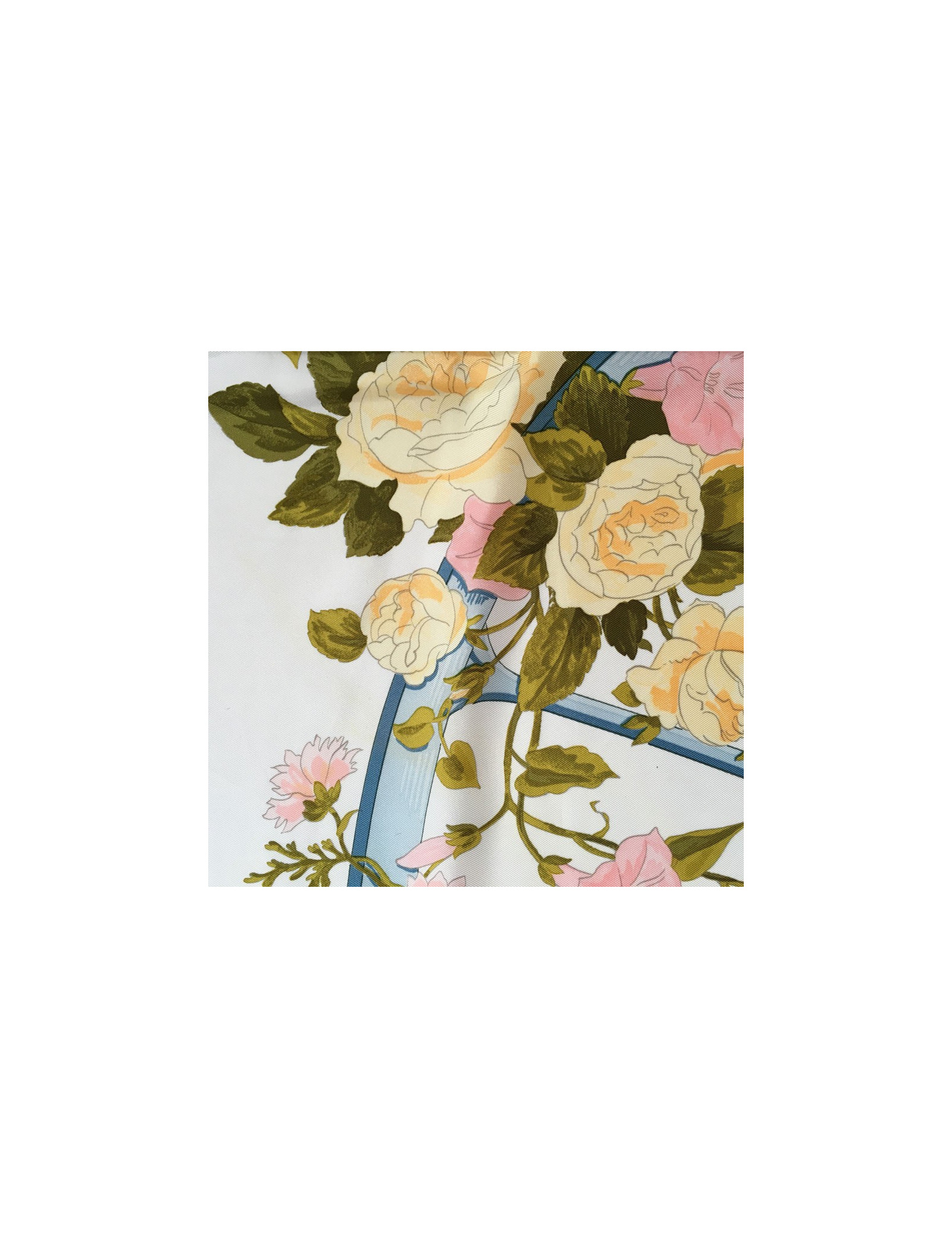 Carré HERMES "Romantique" en soie. Bordure bleue ciel et fond floral dans les tons roses, verts et jaune clair.