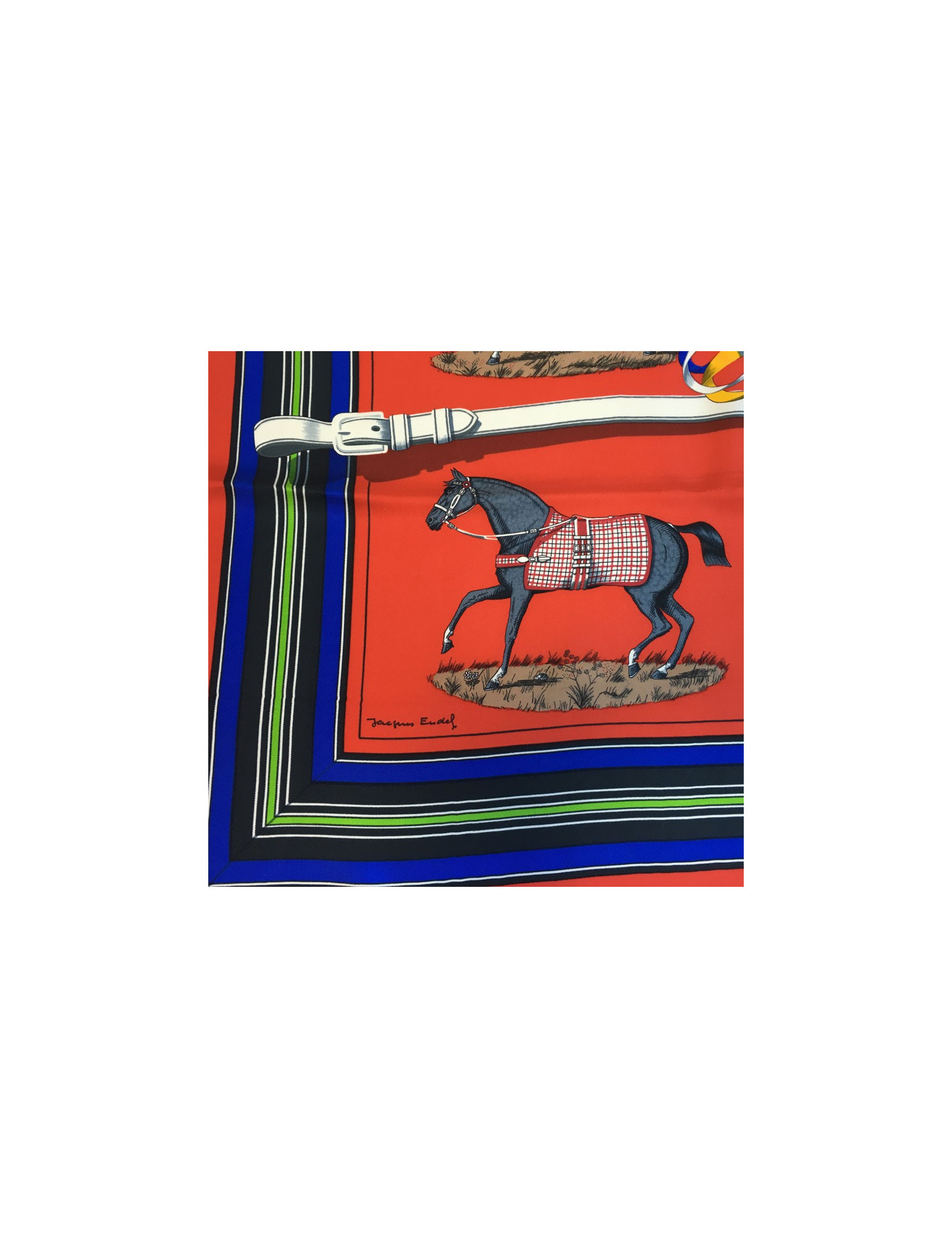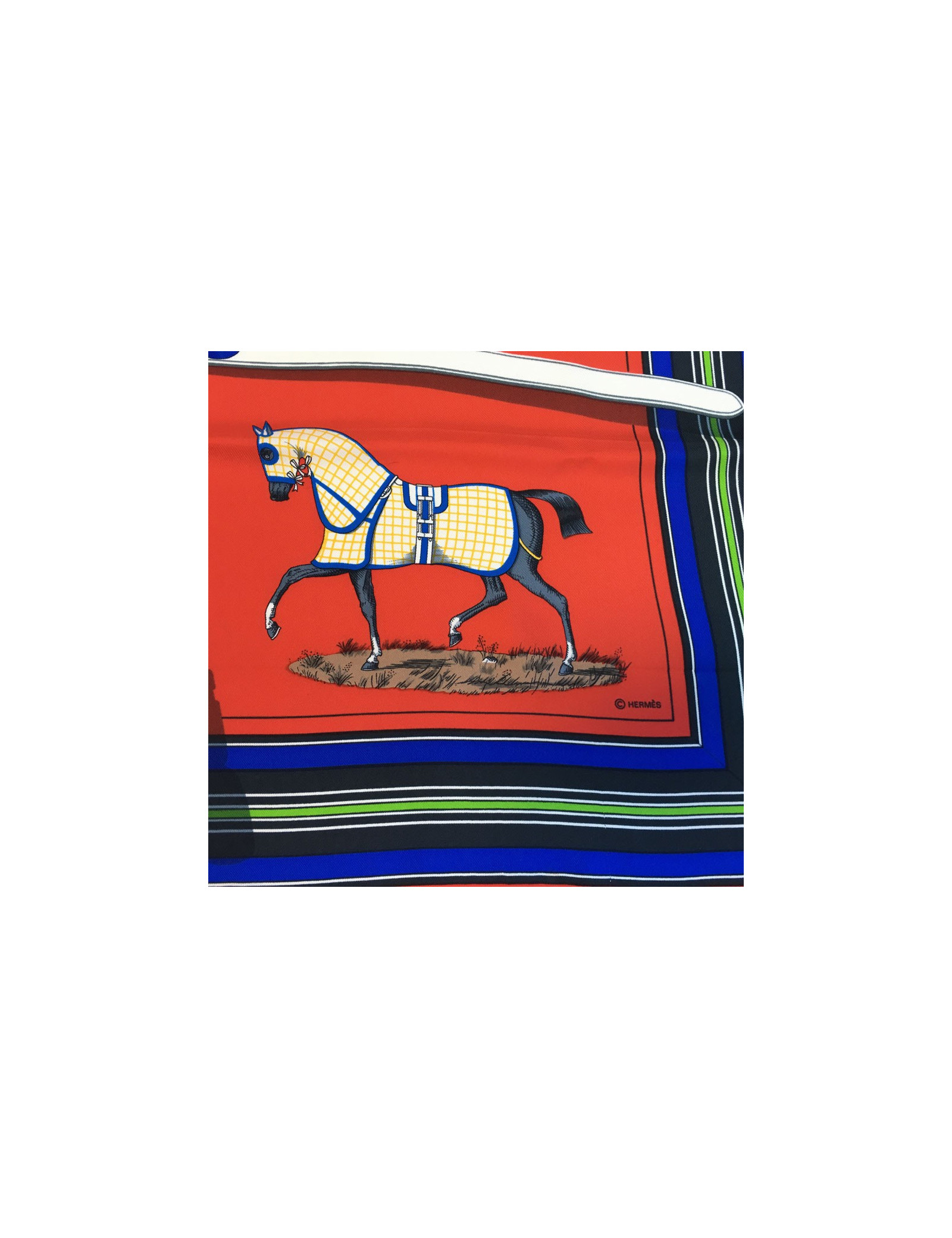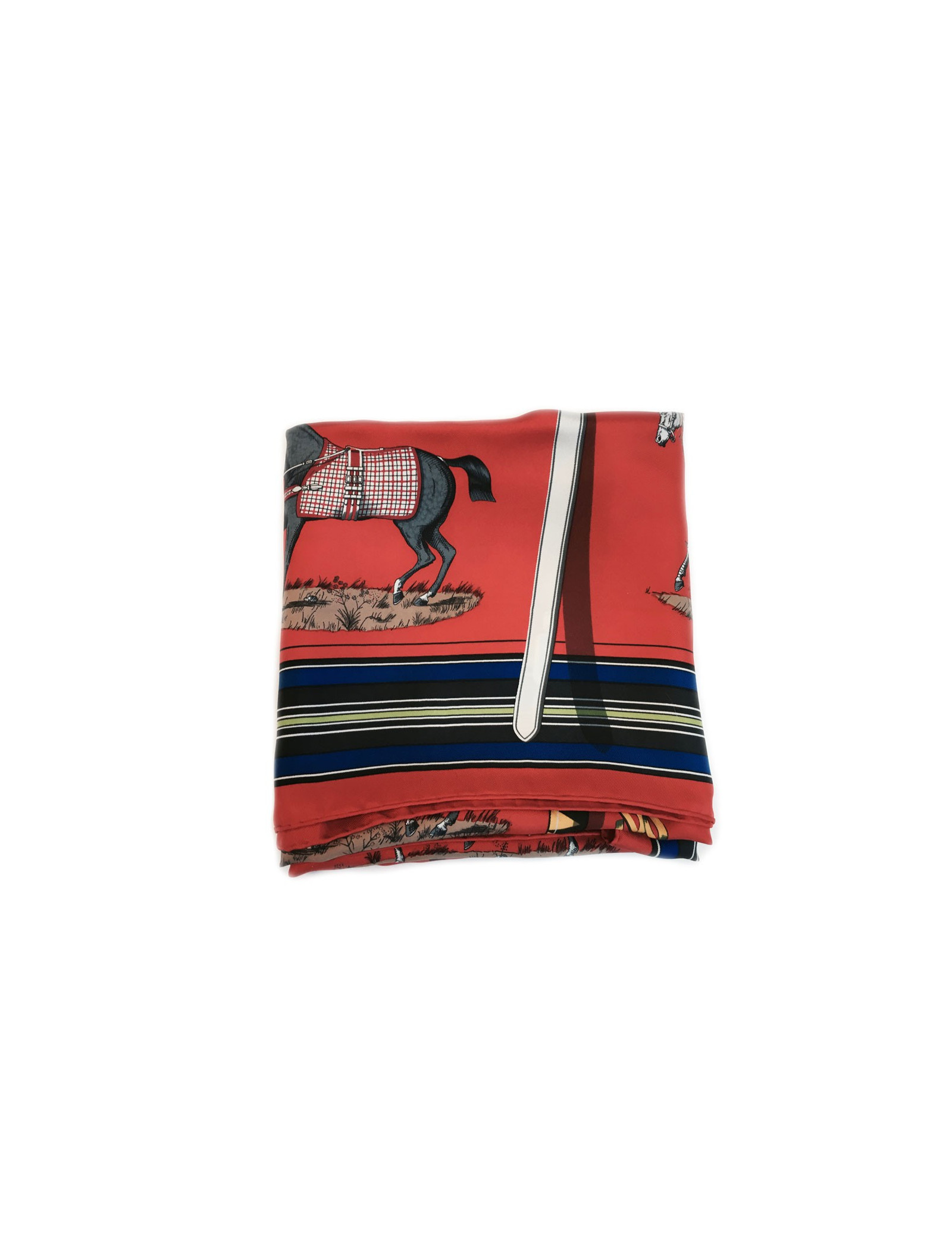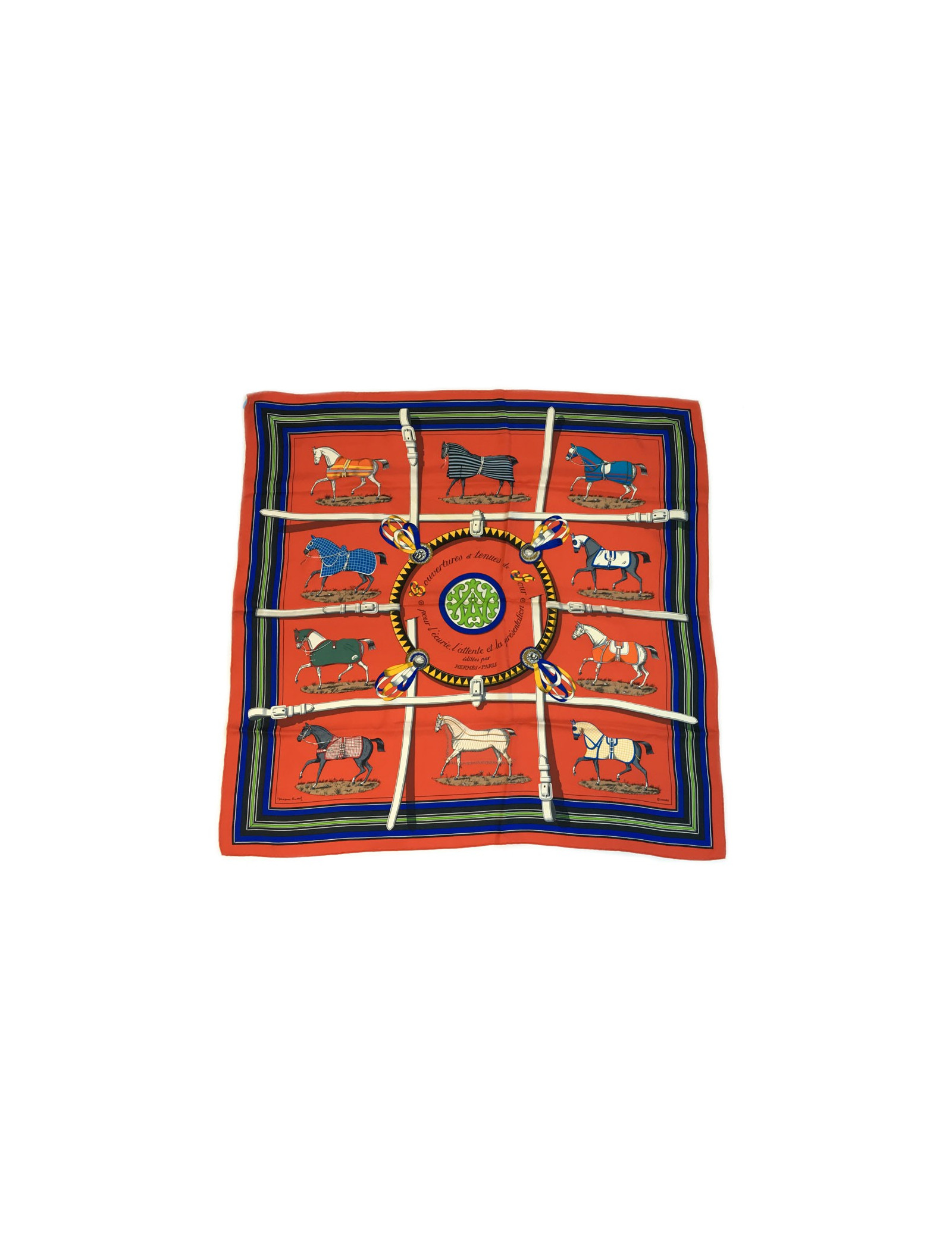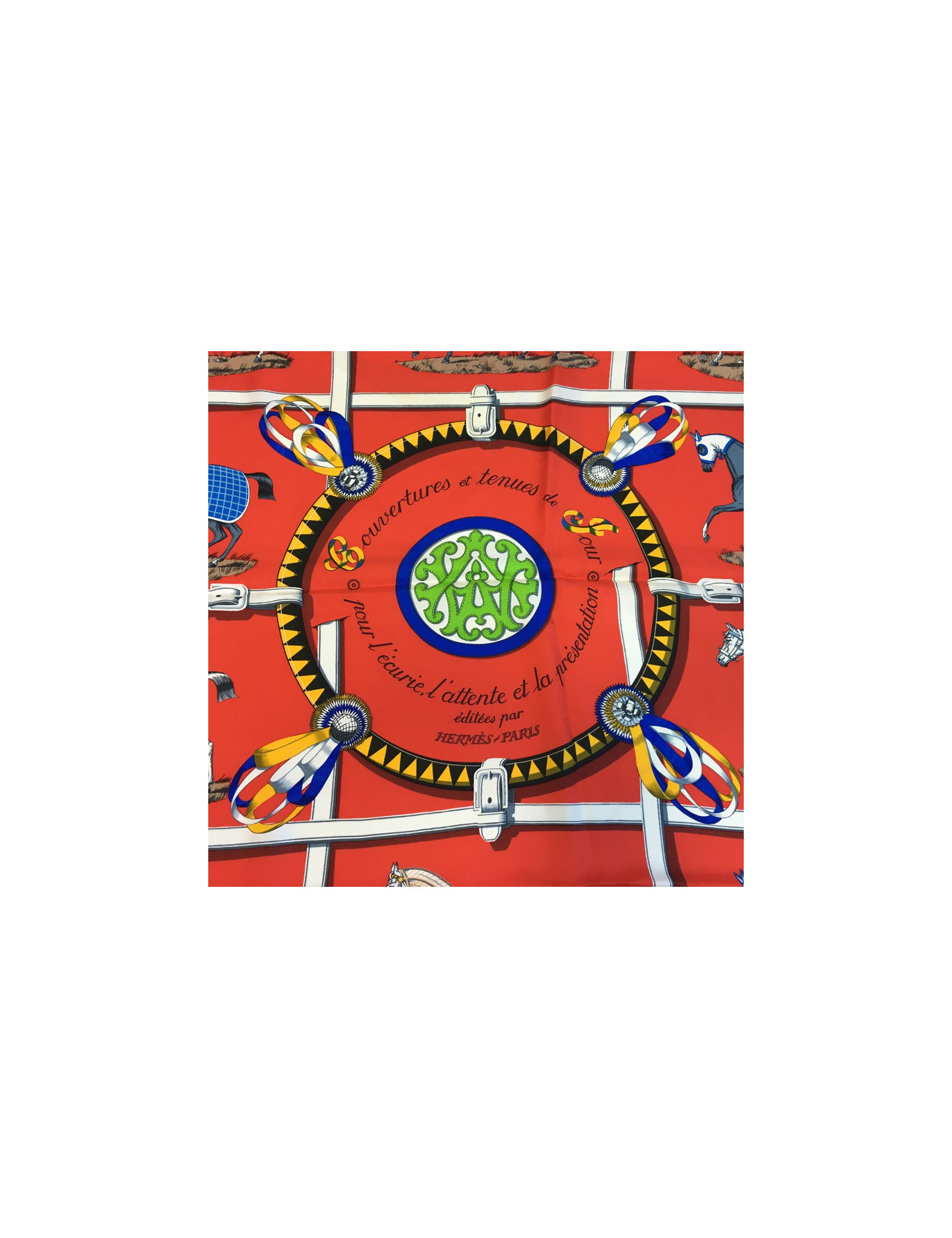 Carré HERMES "Couvertures et tenues de jour pour l'écurie, l'attente et la présentation." en soie rouge.