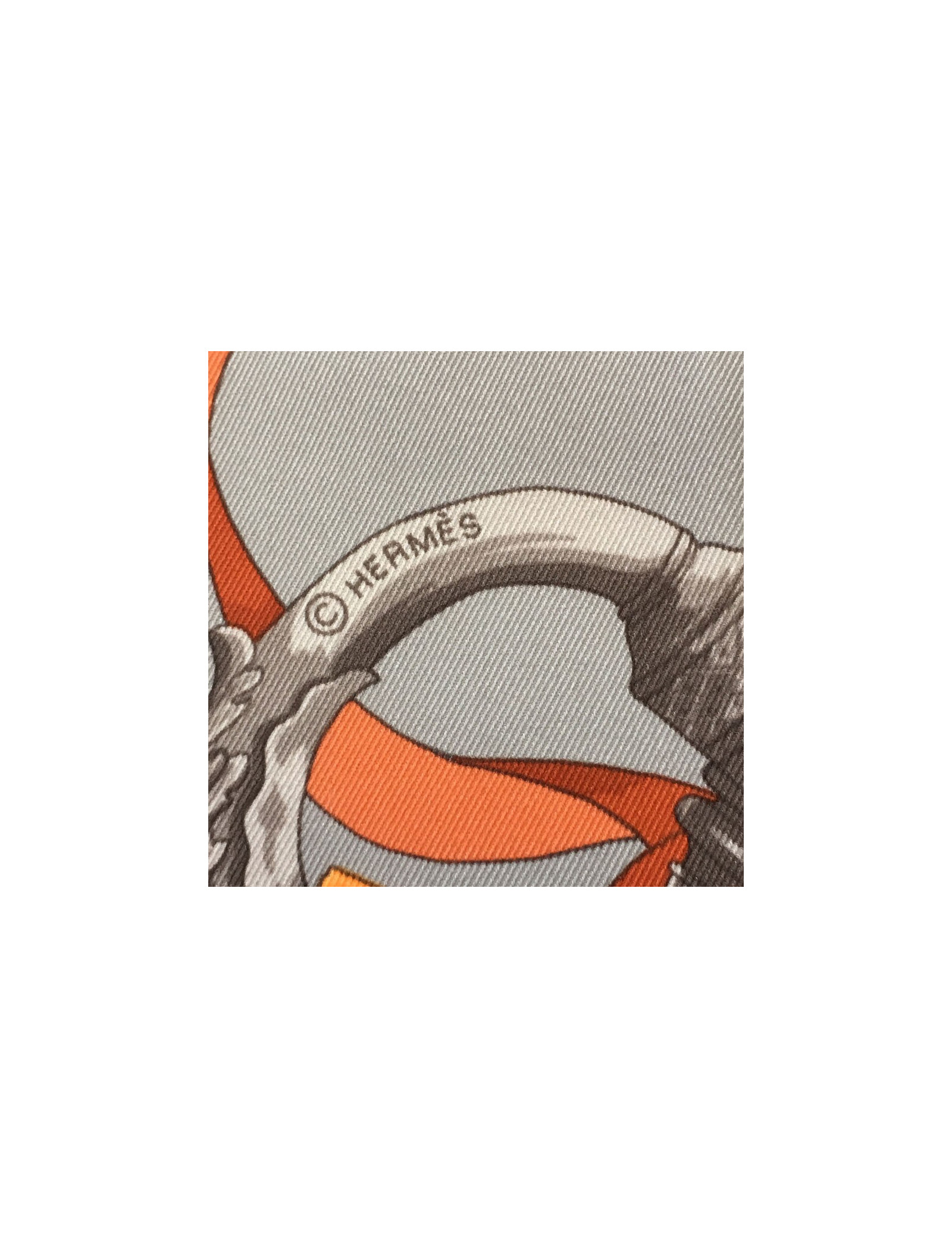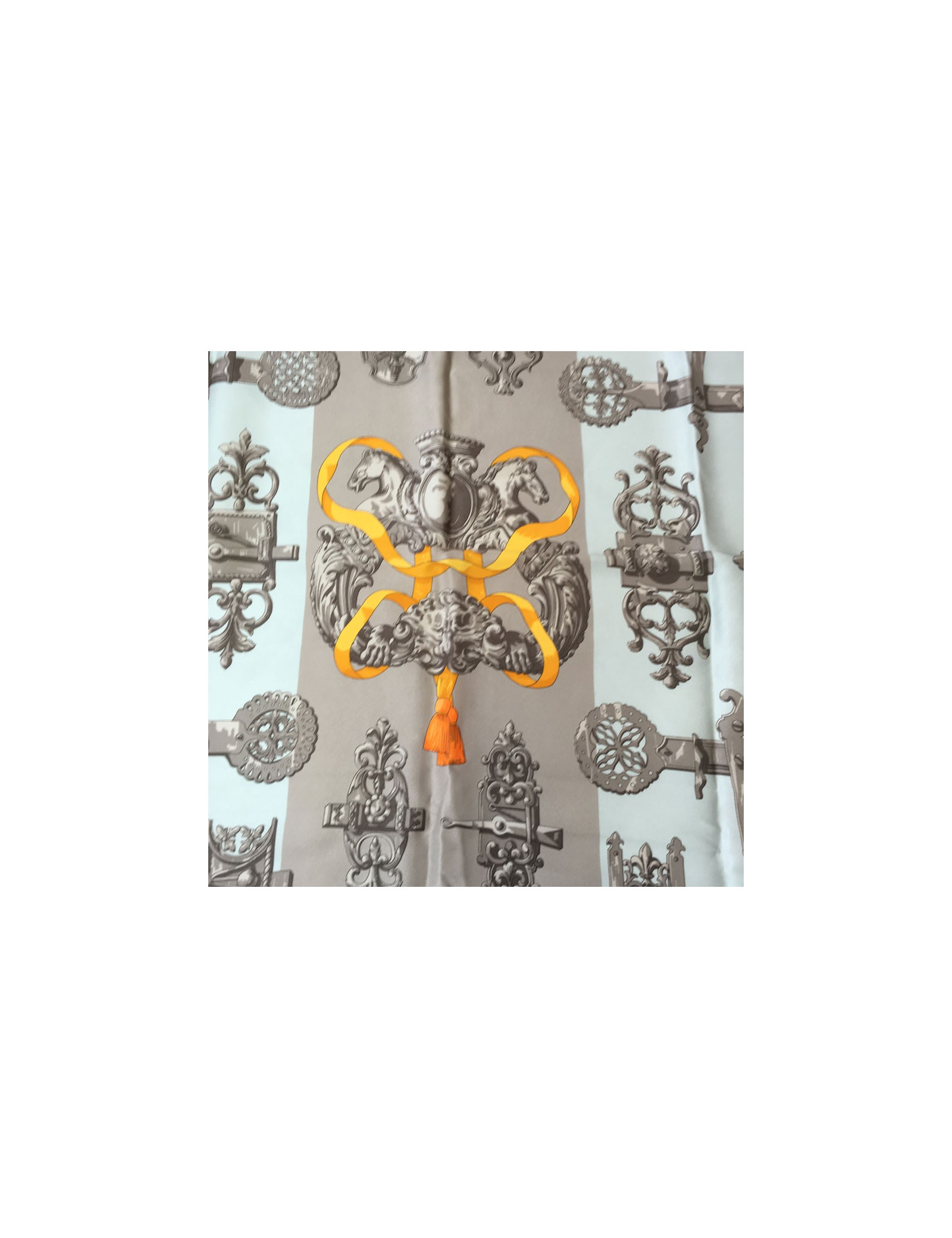 Petit carré HERMES "Ferronnerie" en soie taupe, grise, jaune et orange. En très bon état. Une petite tâche sur le fond gris. Le roulotté est impeccable.