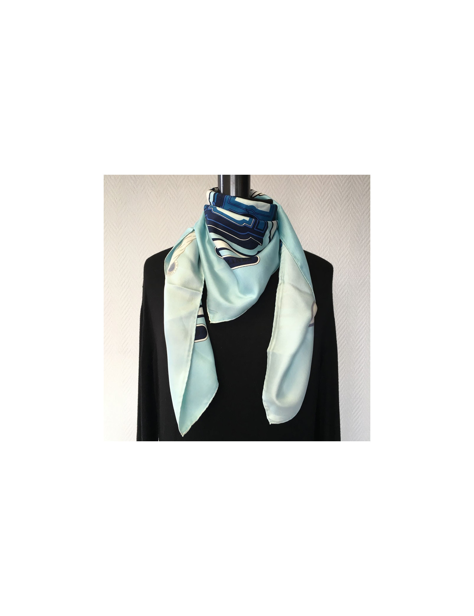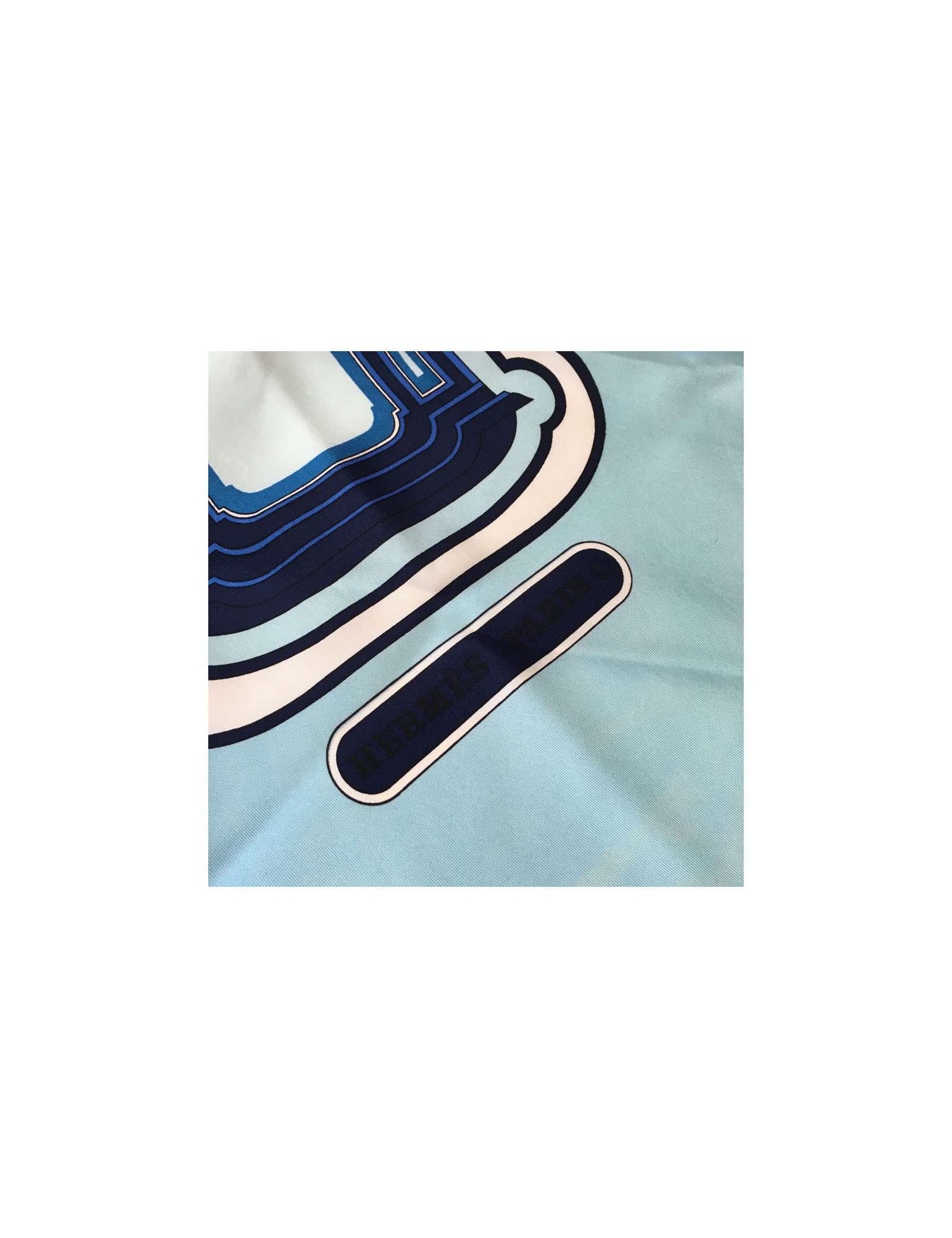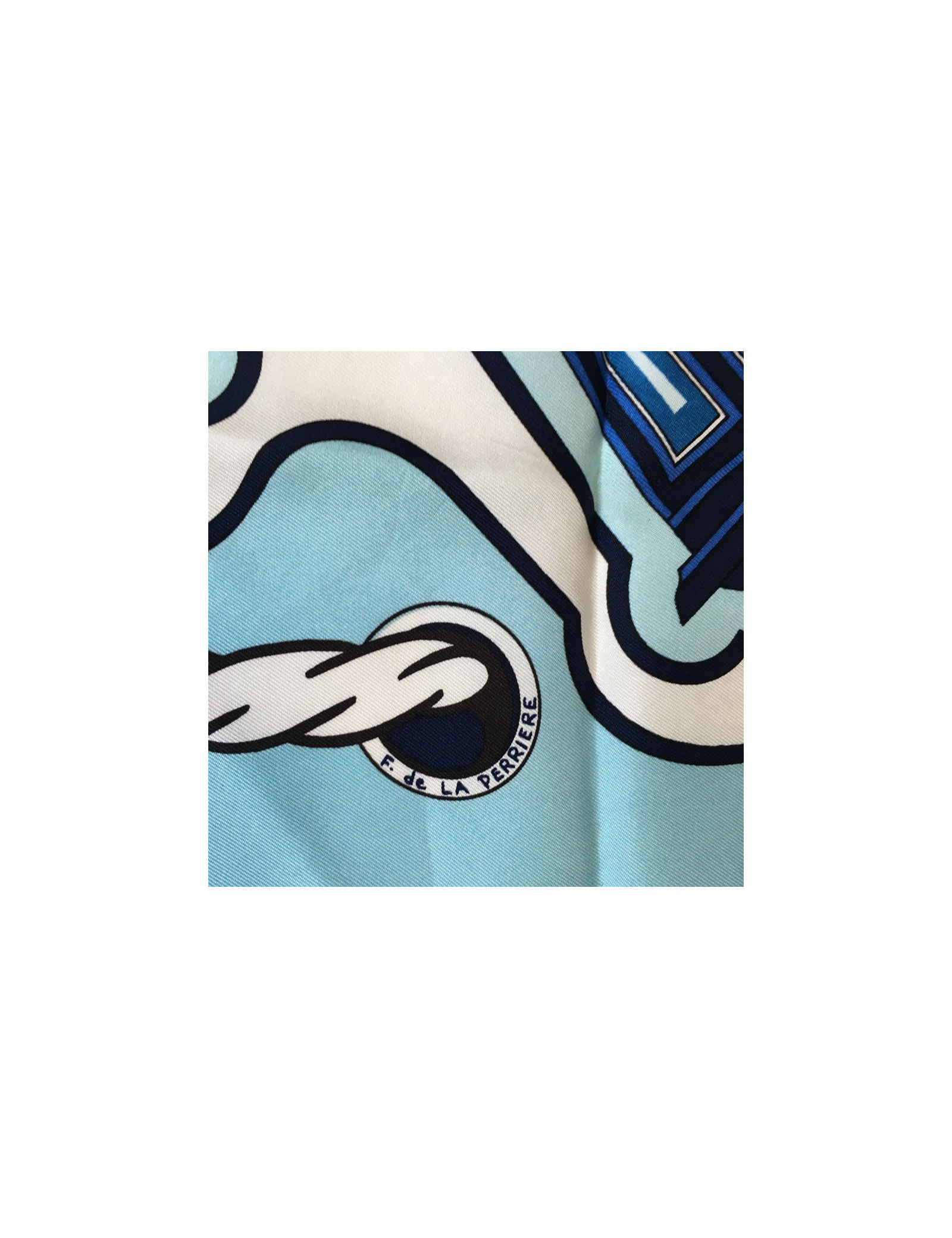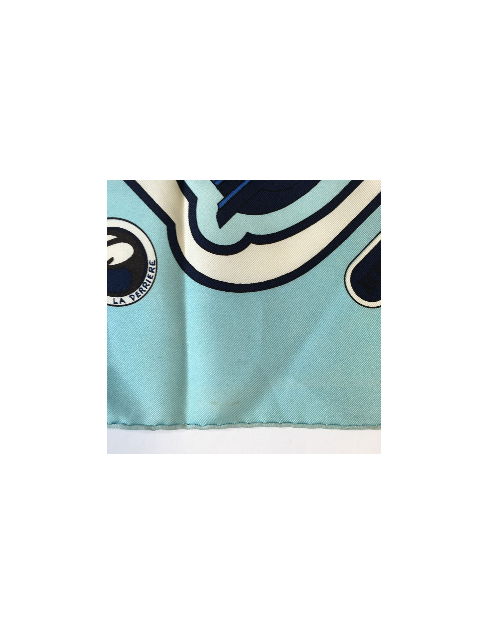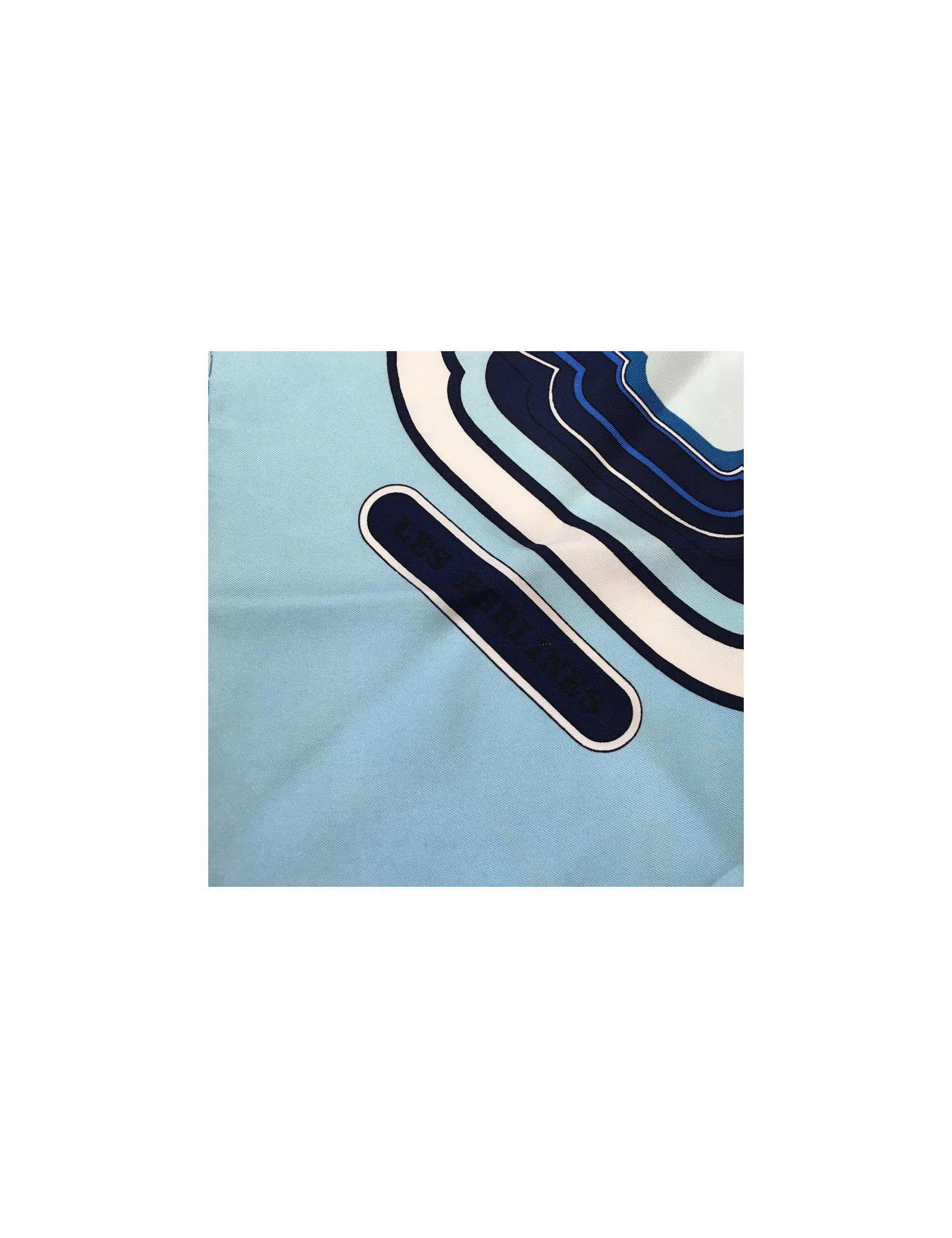 Carré HERMES "Les Berlines" en soie dans les teintes de bleu. Quelques tâches sur l'ensemble du foulard.