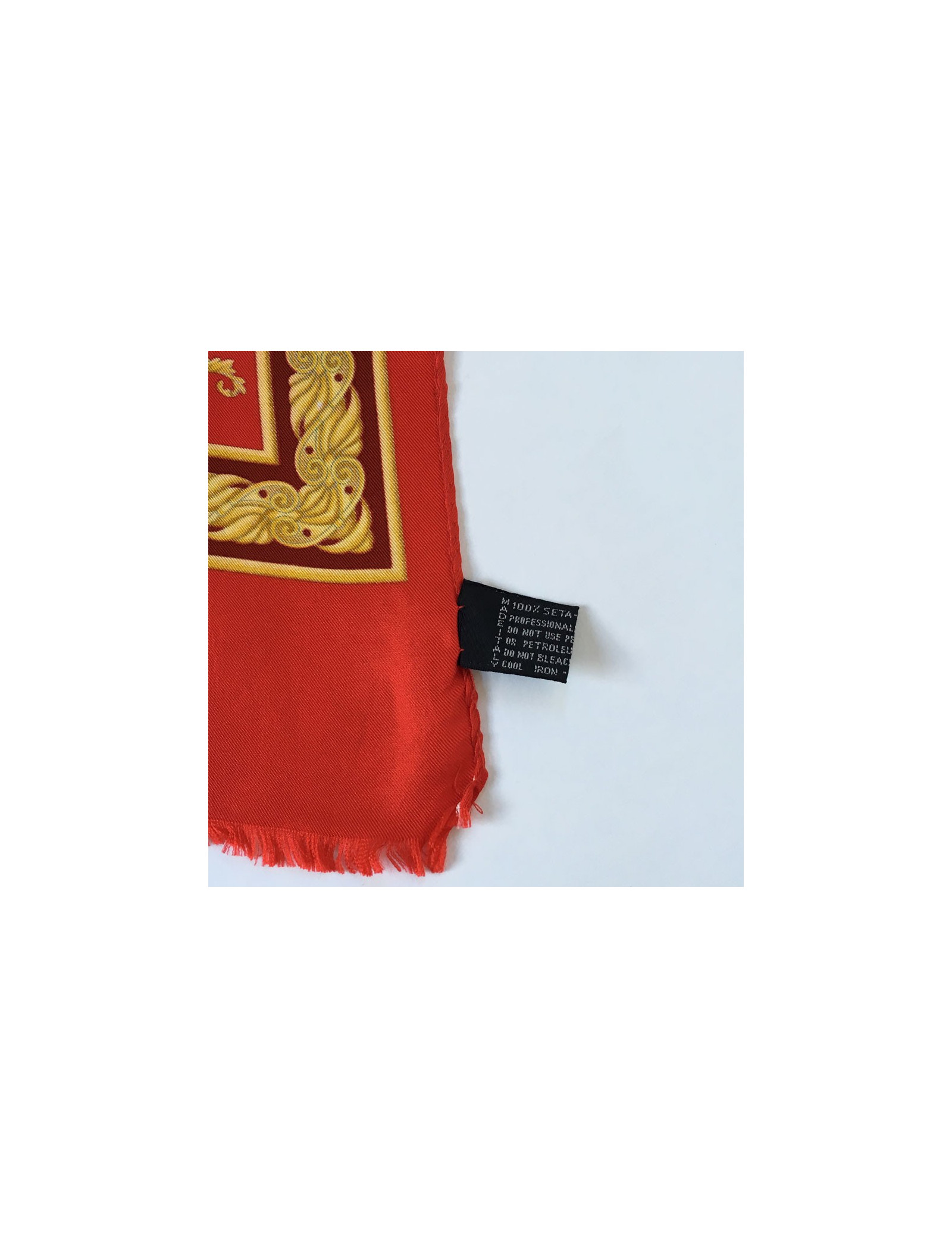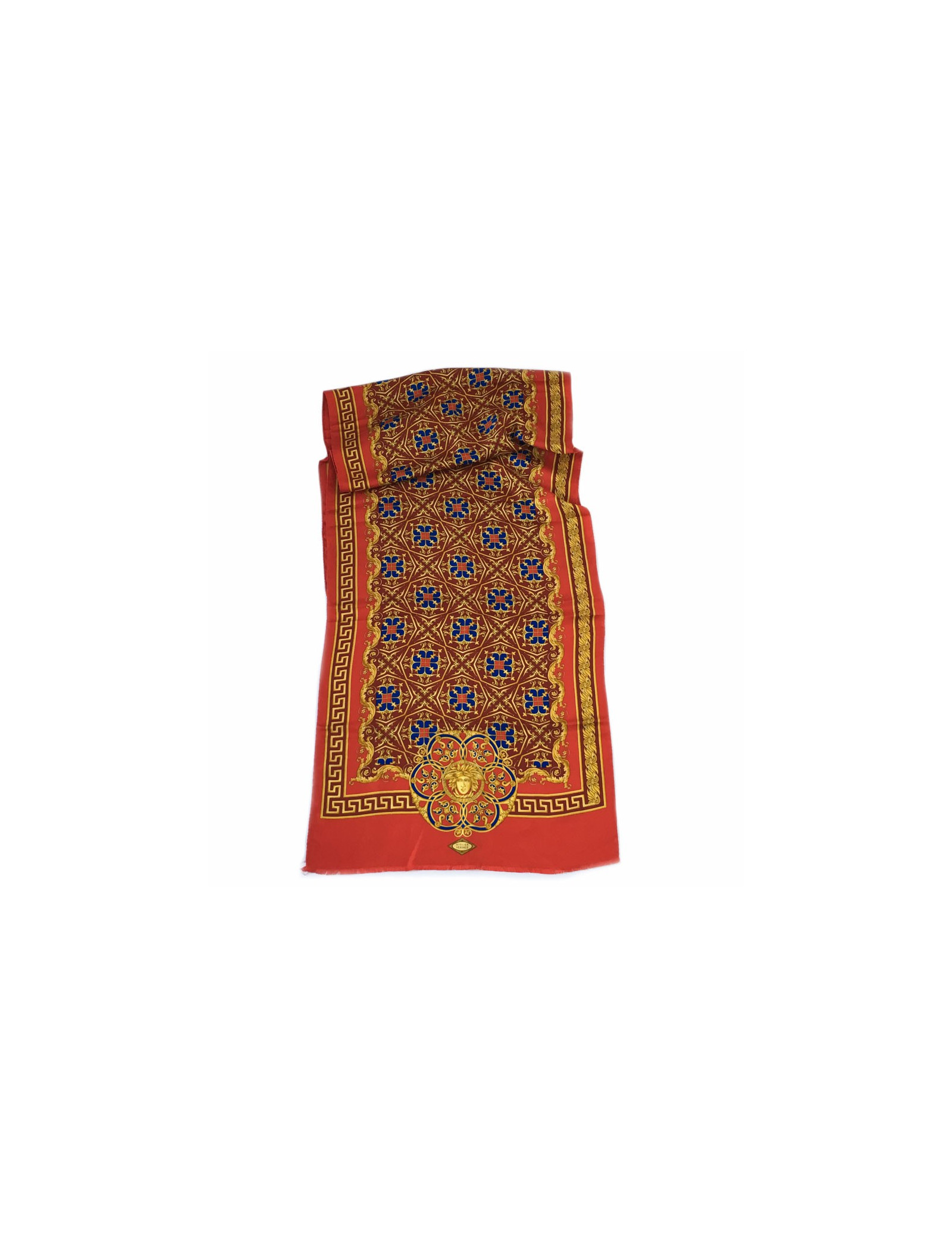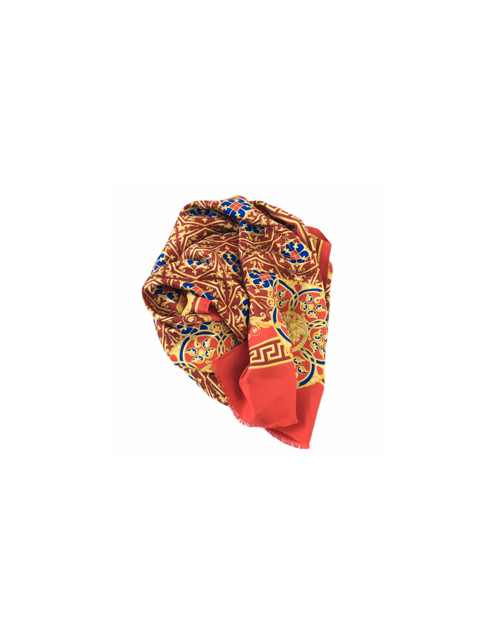 Echarpe Atelier VERSACE en soie rouge, bordeaux, or et bleu. De petites franges bordent les extrémités. Le roulotté est en très bon état.