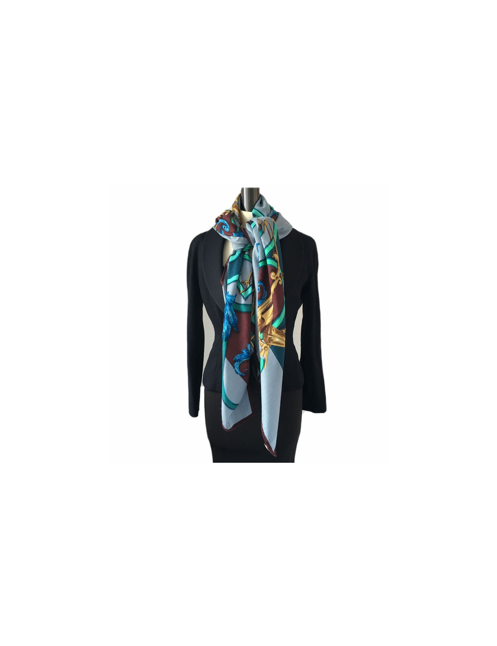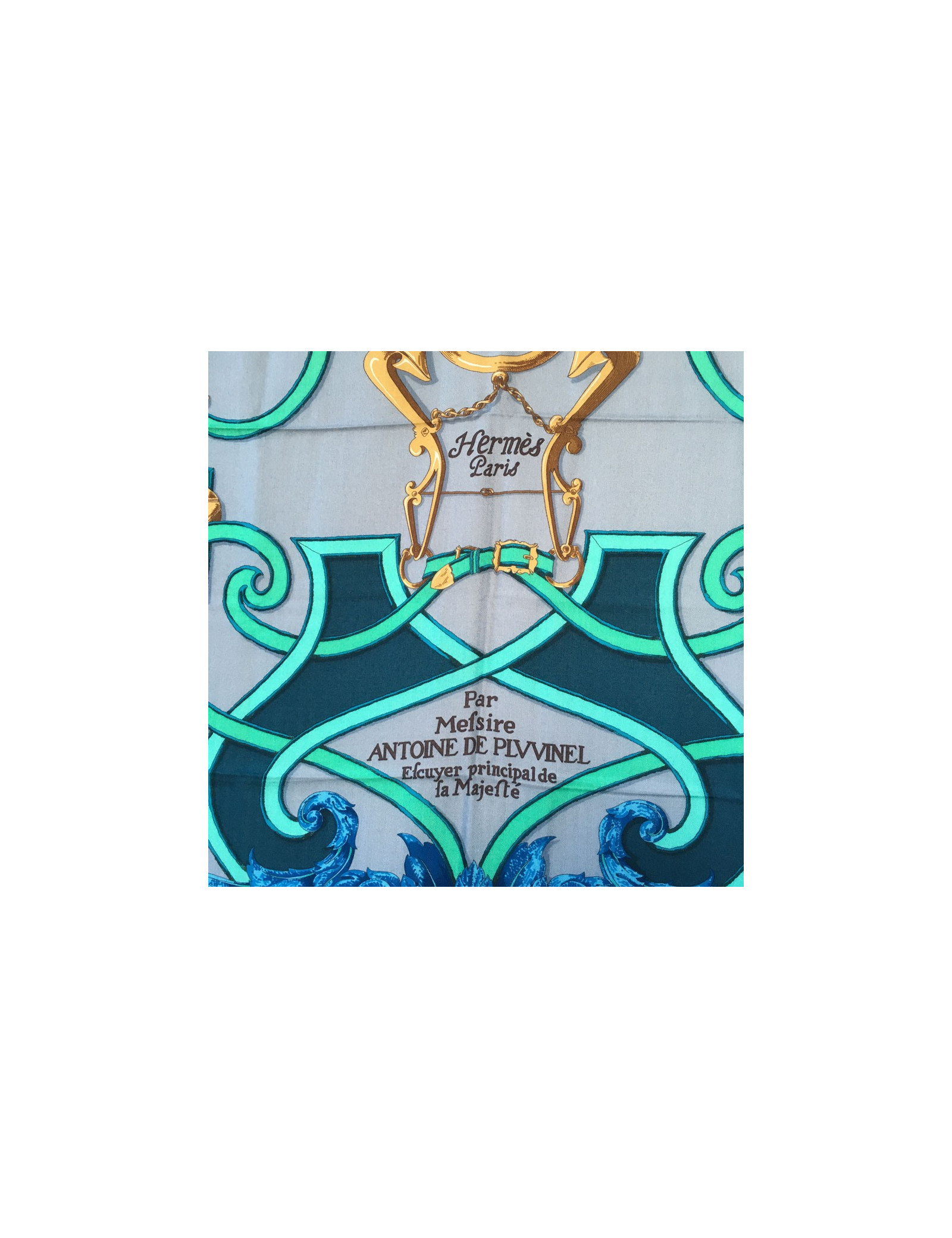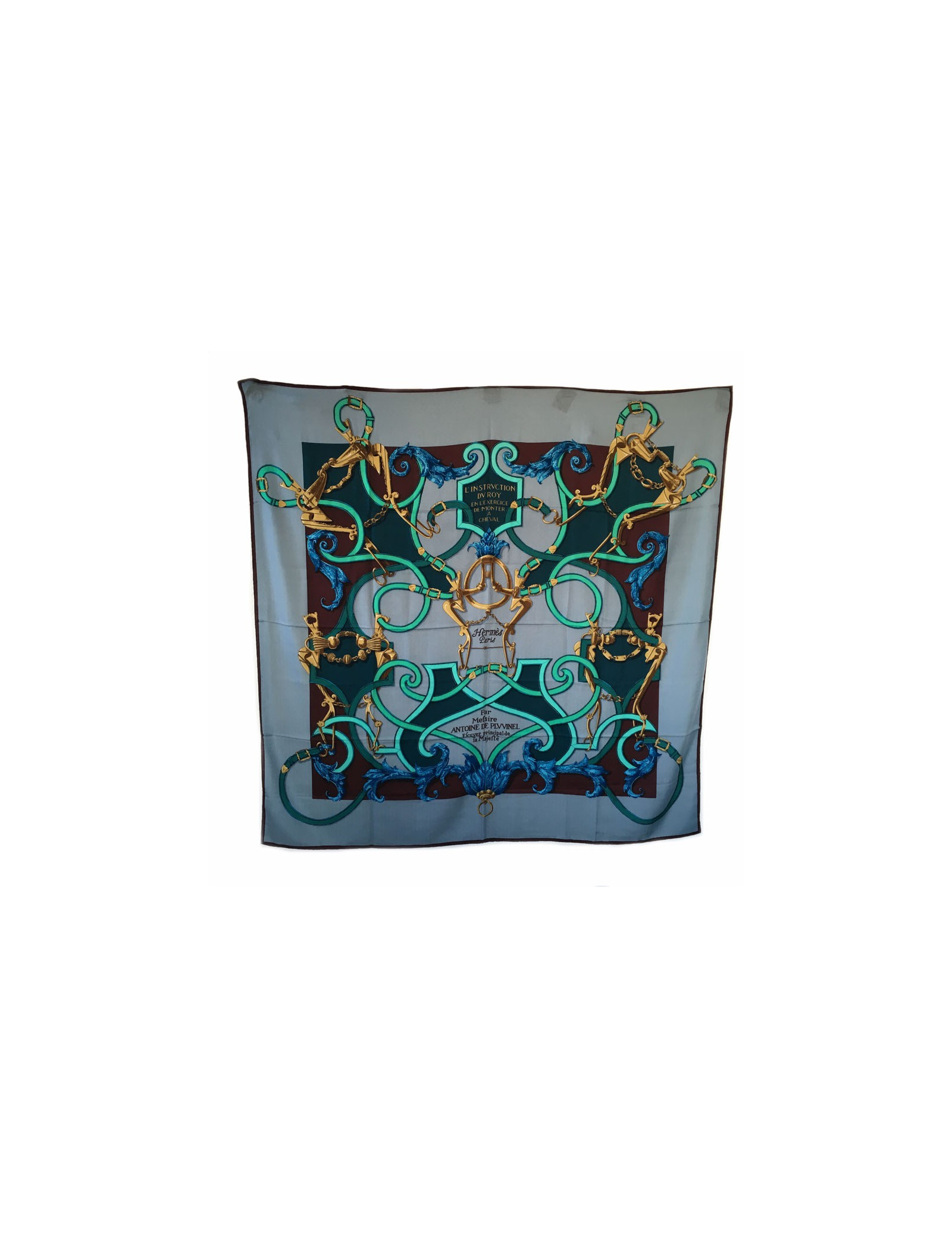 Châle HERMES "L'instruction du Roy" en soie et cachemire bordeaux, bleu et vert