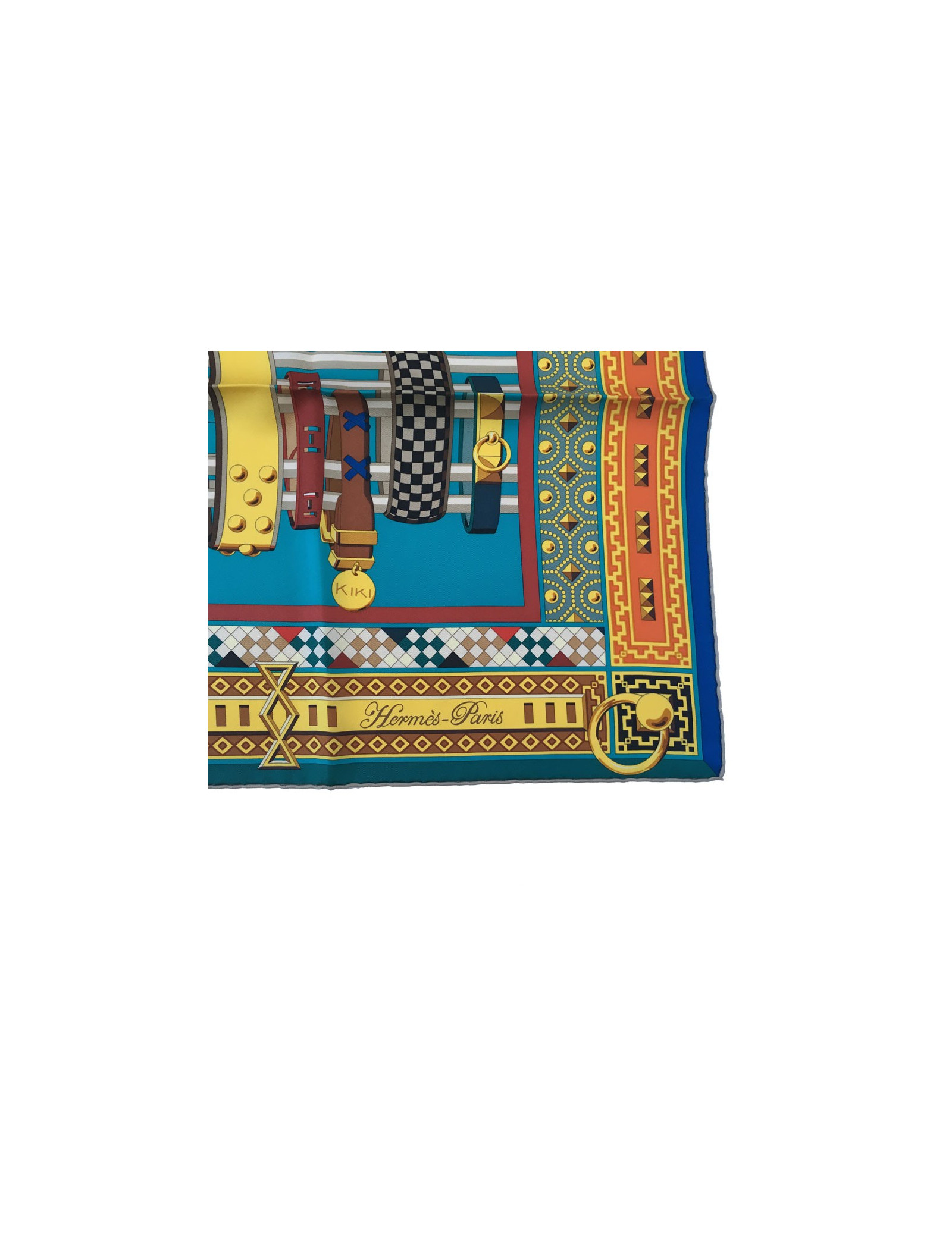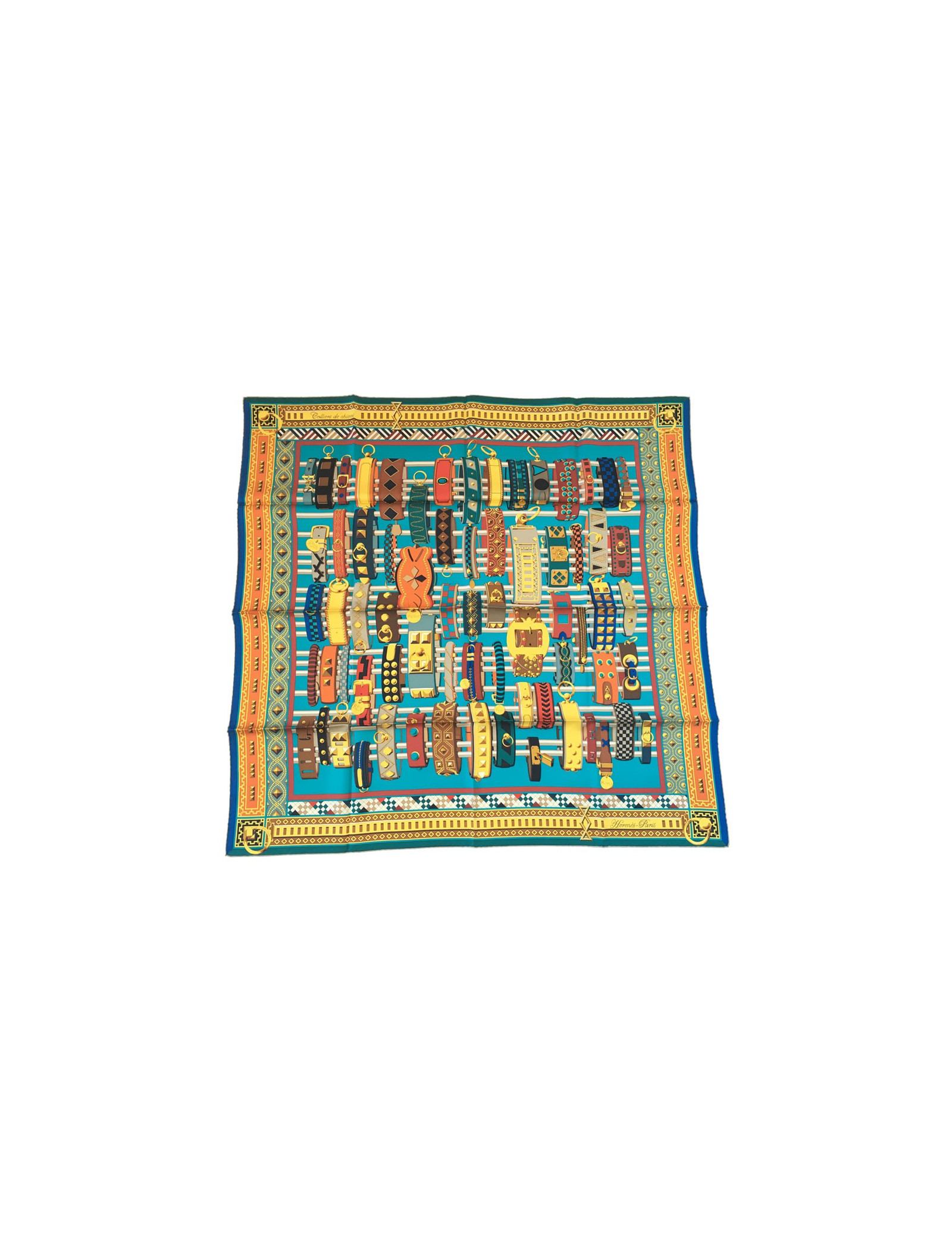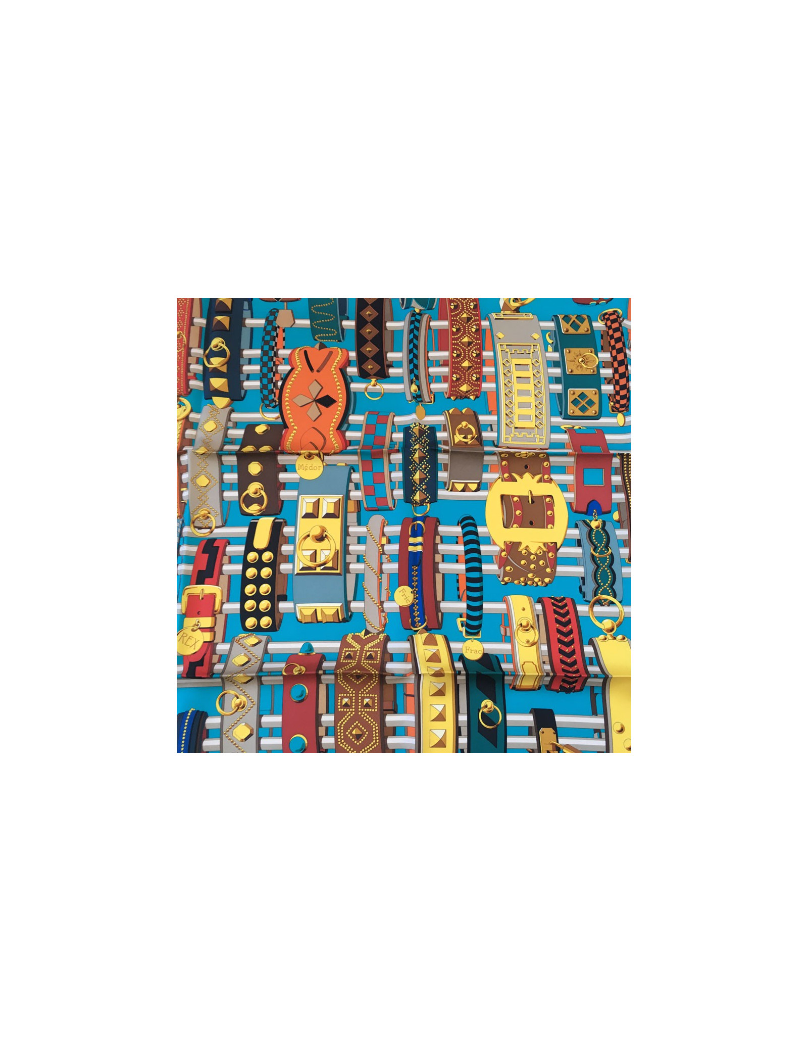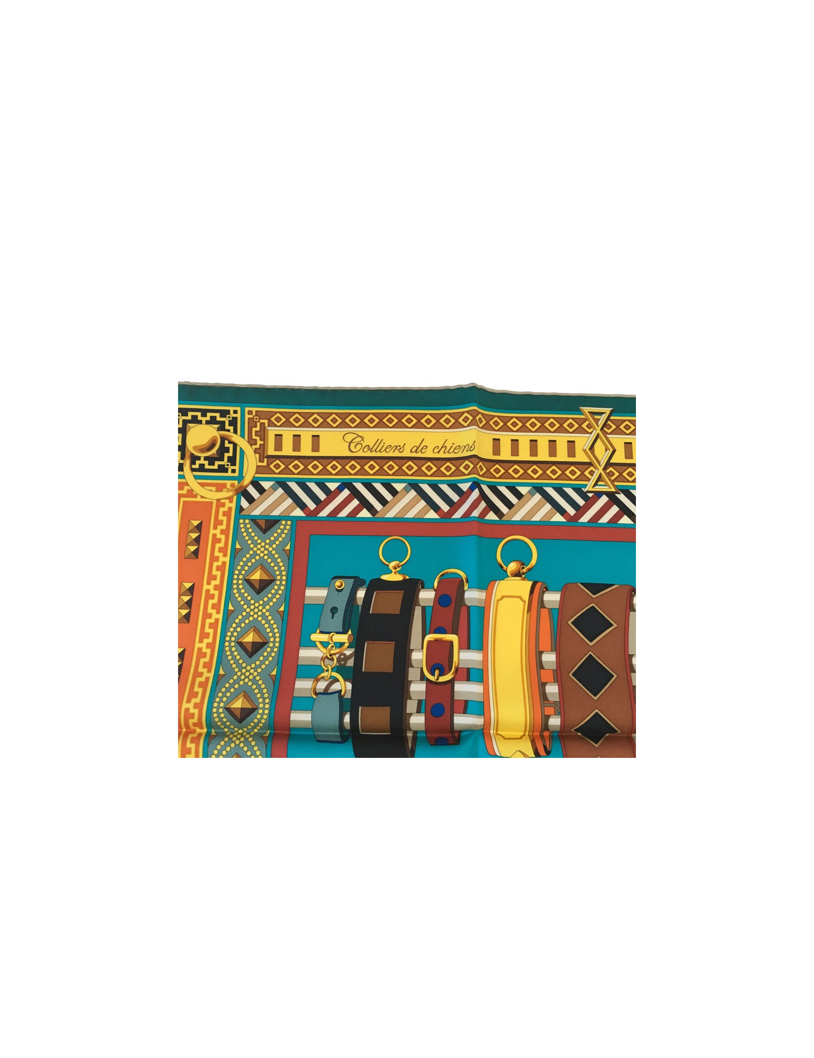 Superbe carré HERMES "Colliers de chiens" en soie multicolore à dominante de bleu. Dessiné par: Virginie Jamin.