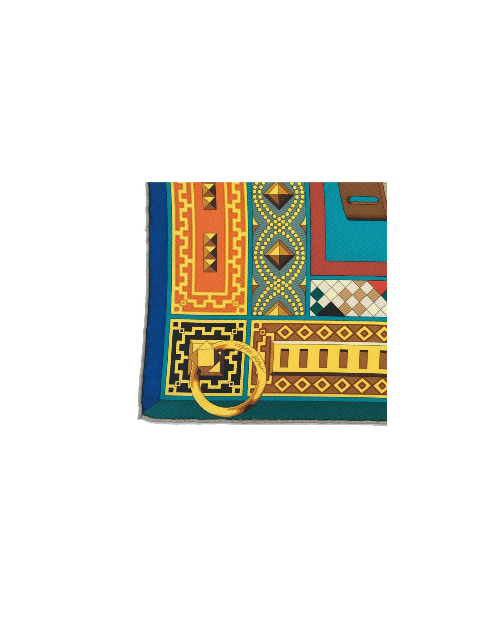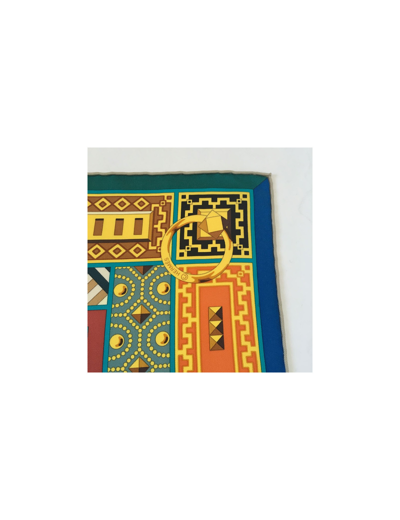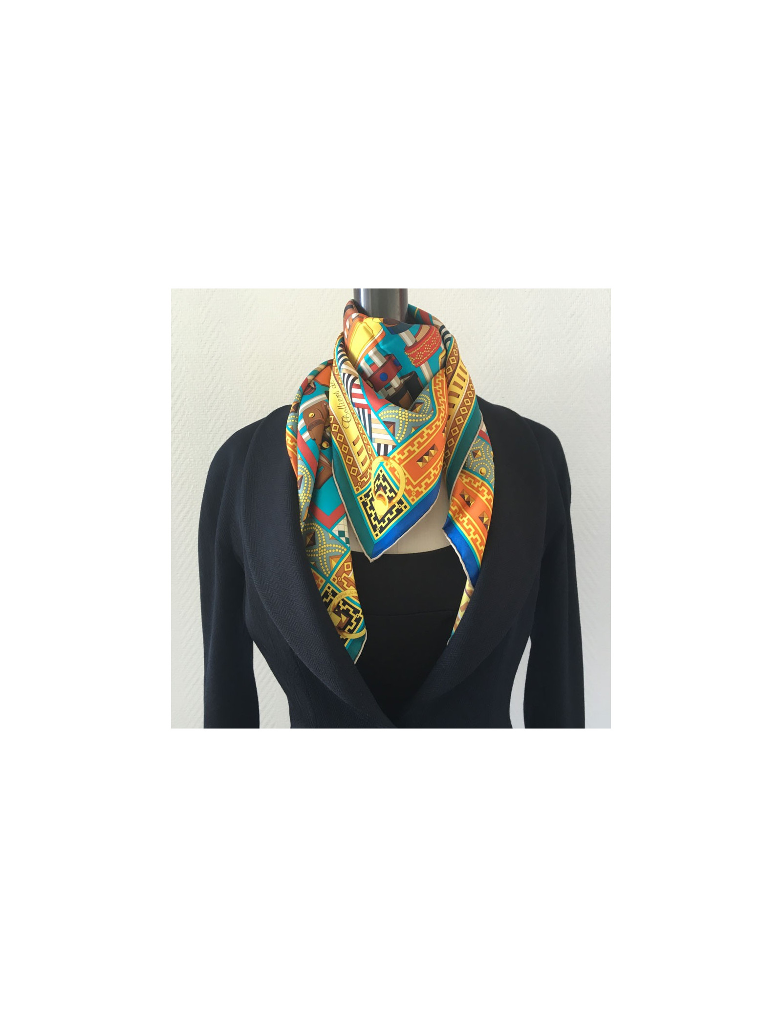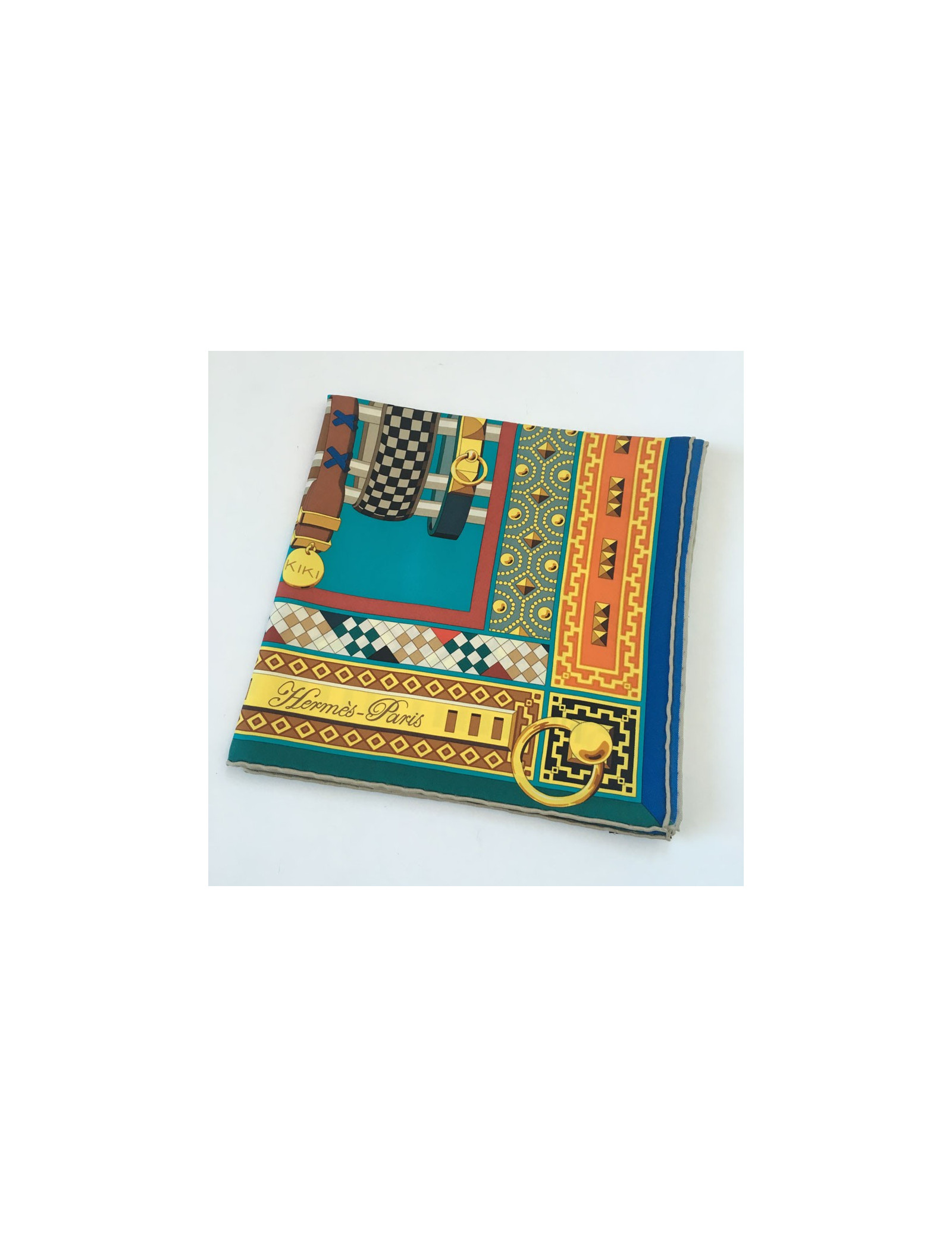 Superbe carré HERMES "Colliers de chiens" en soie multicolore à dominante de bleu. Dessiné par: Virginie Jamin.
