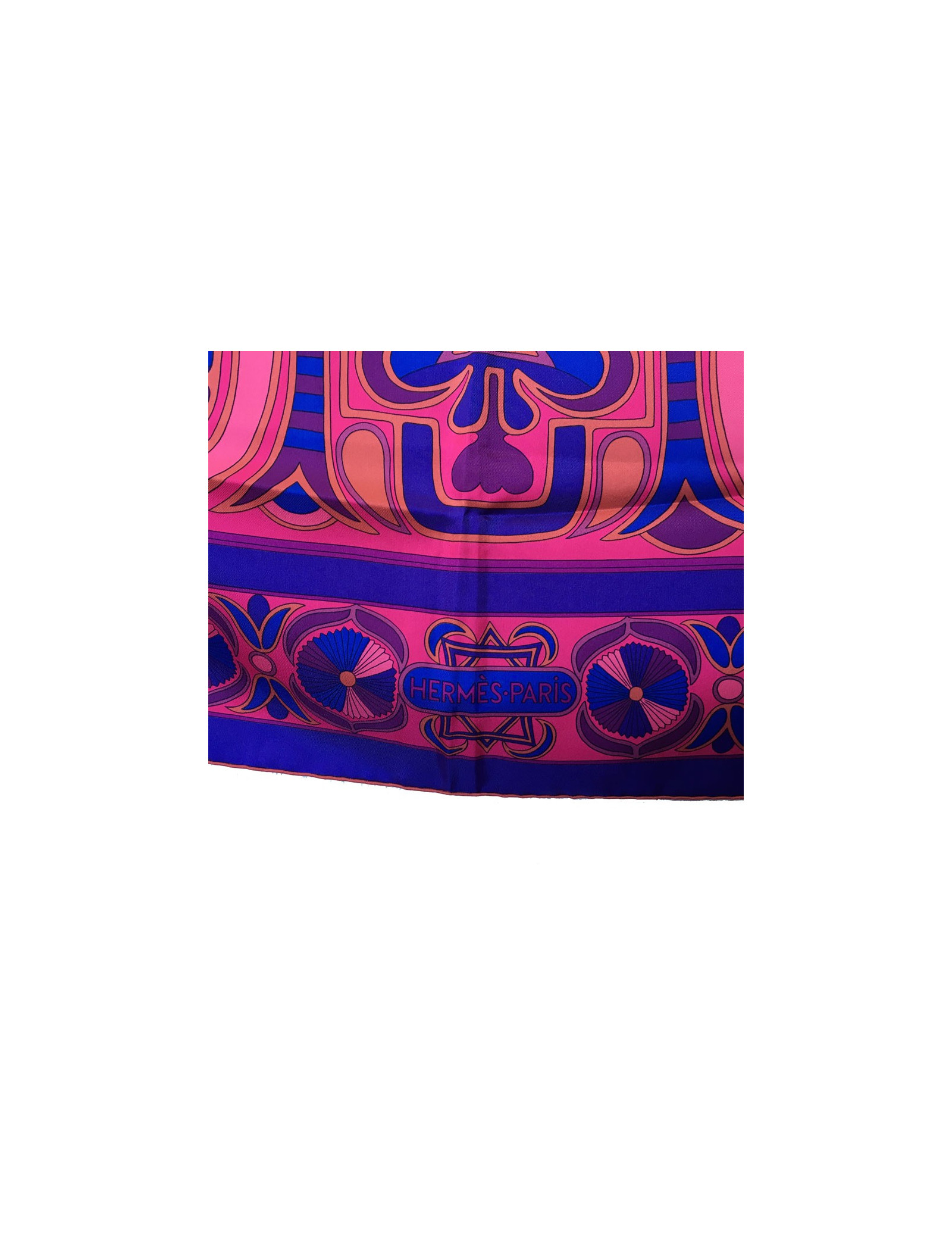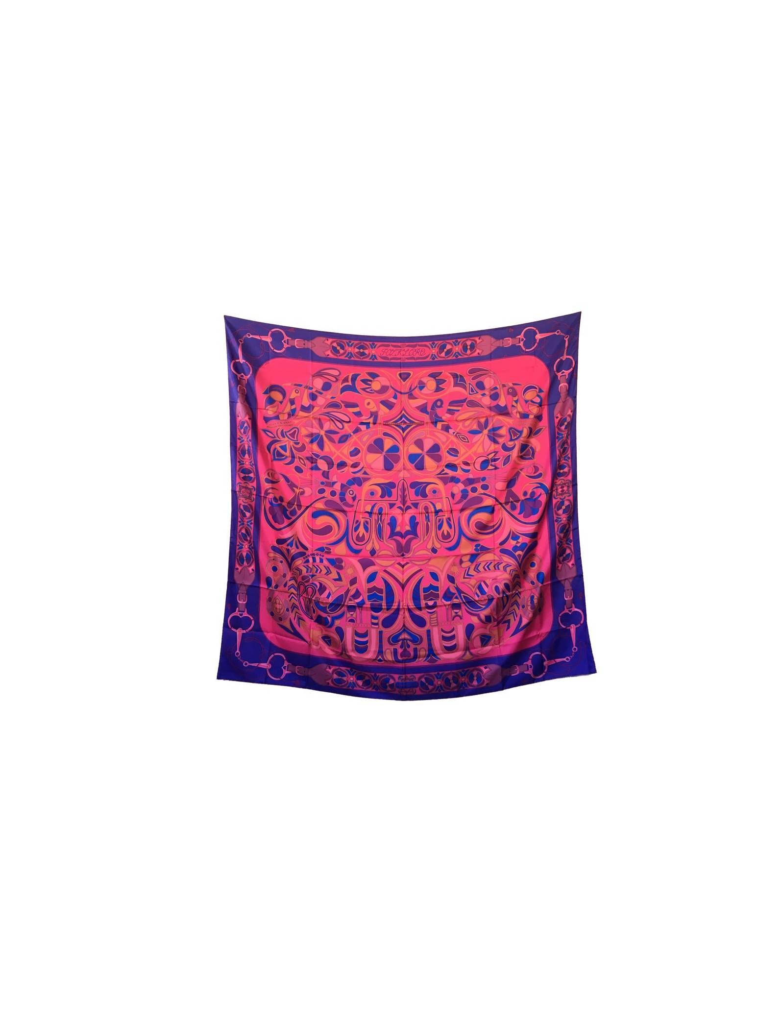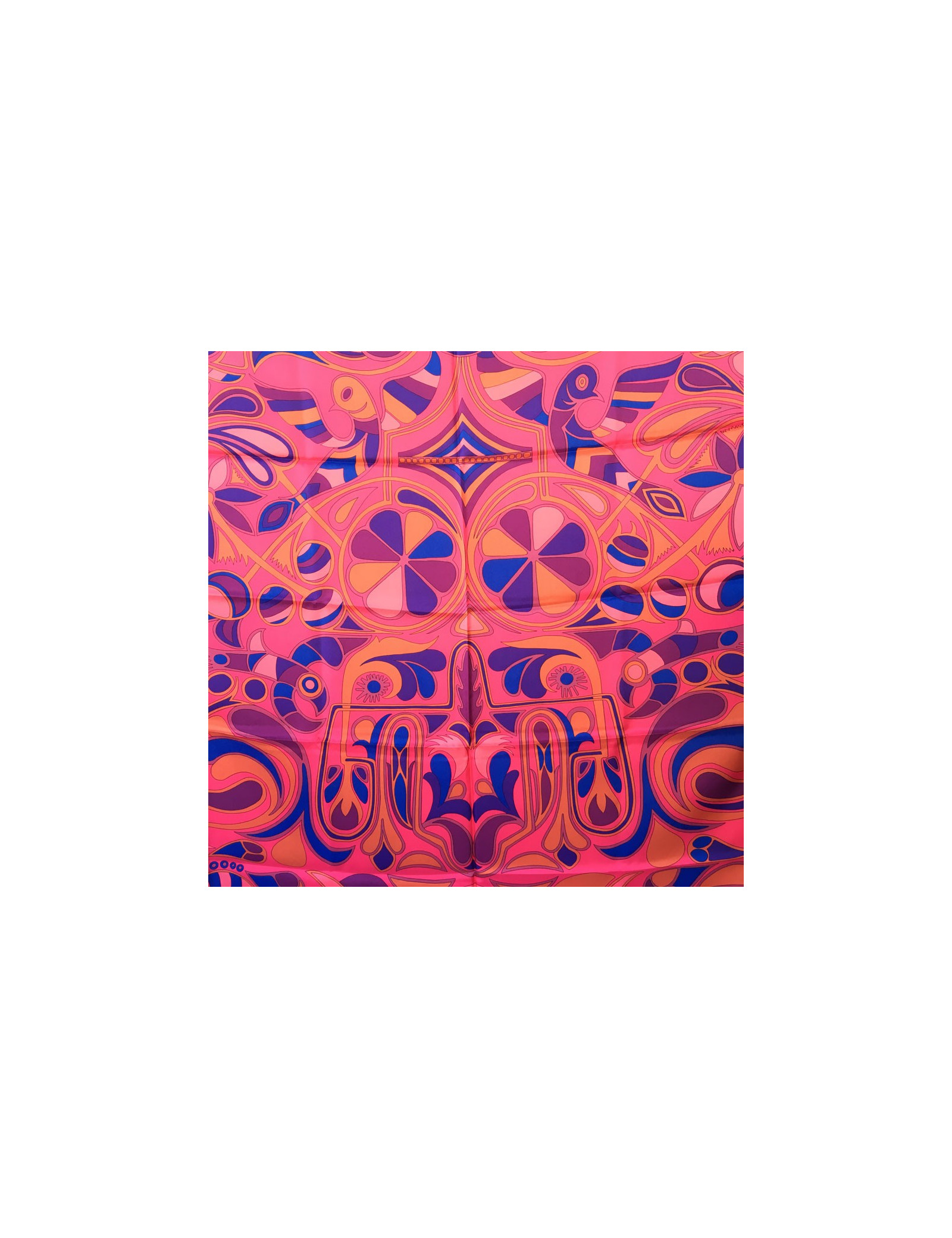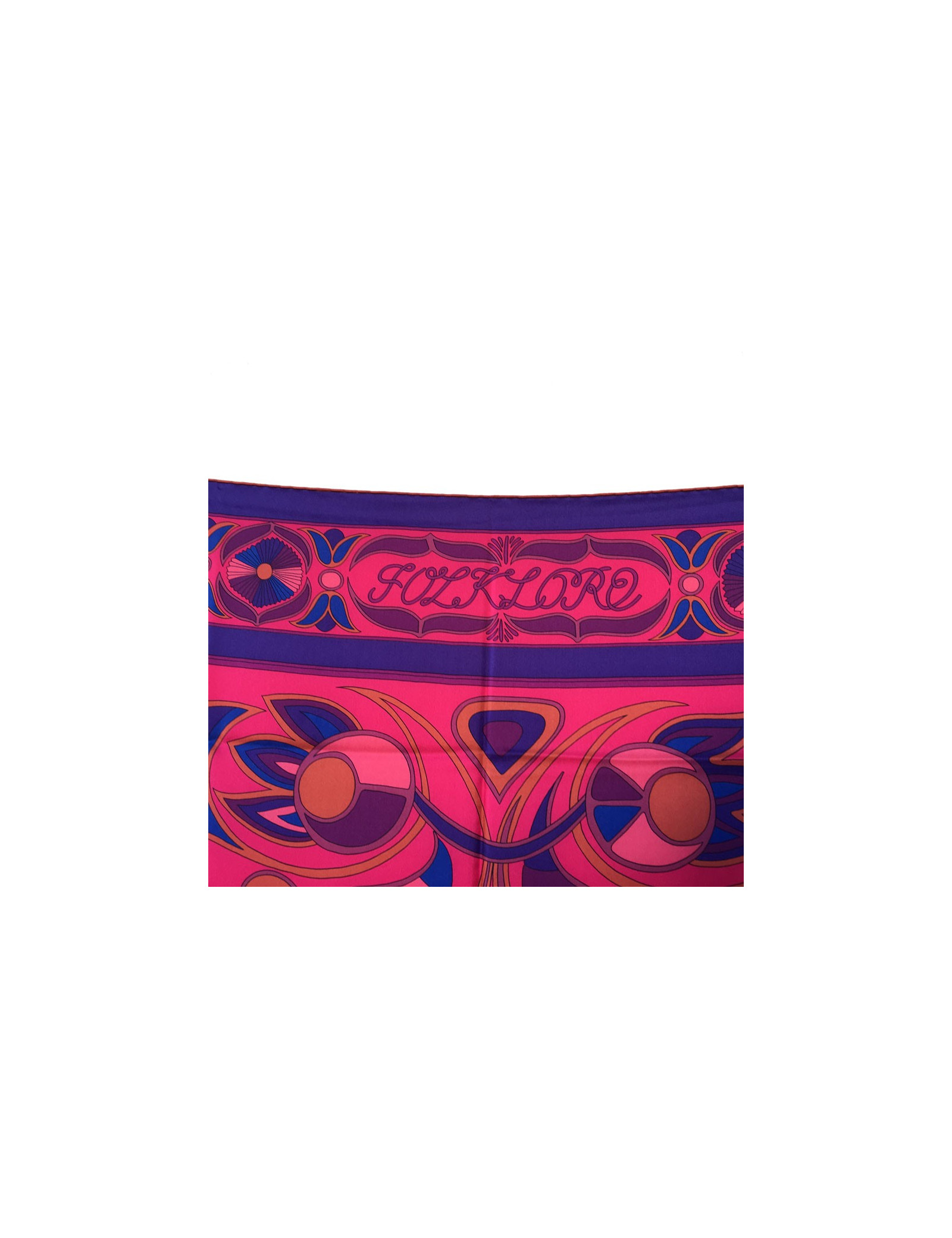 Magnifique châle HERMES "Folklore" en twill de soie rose, mauve, marron.
