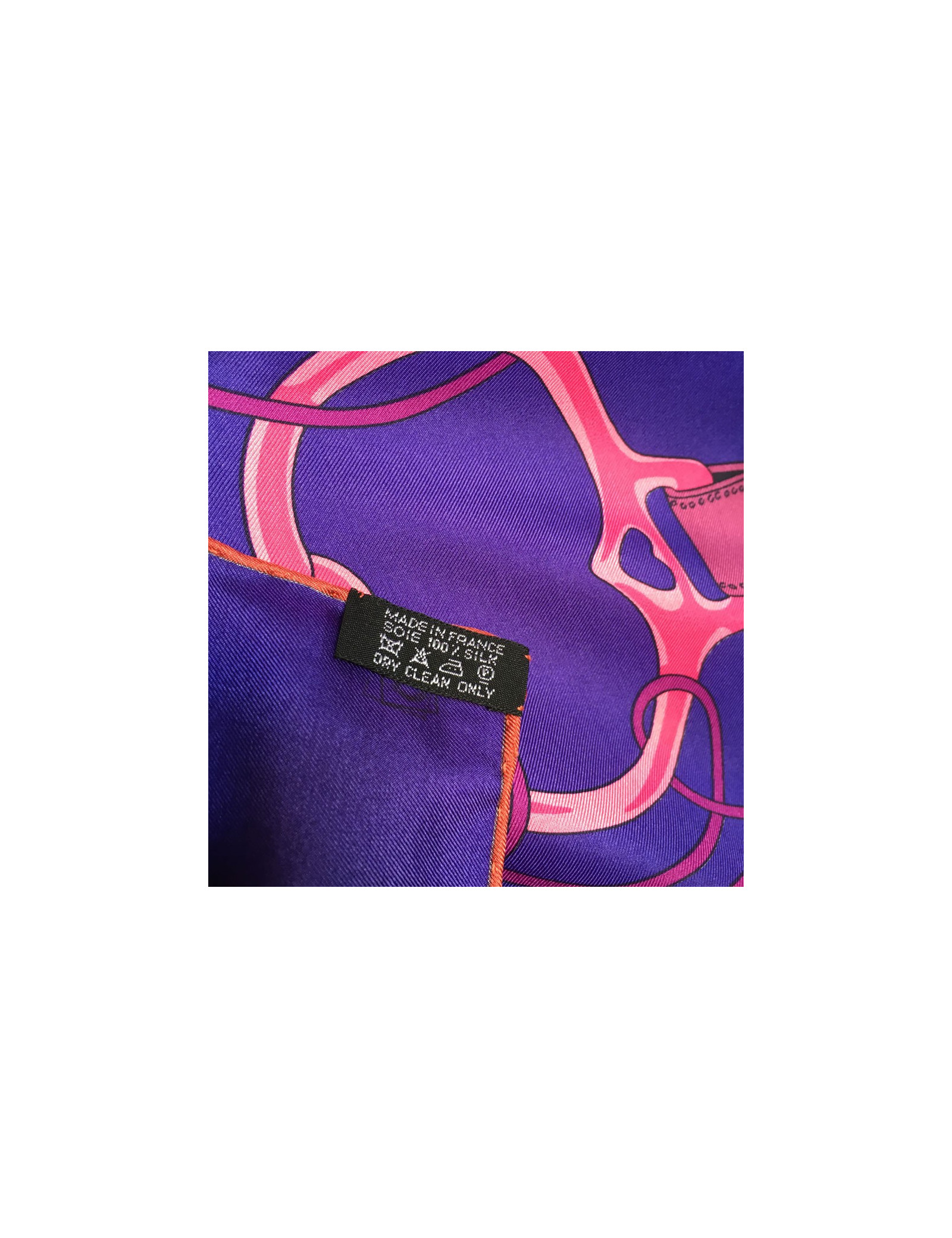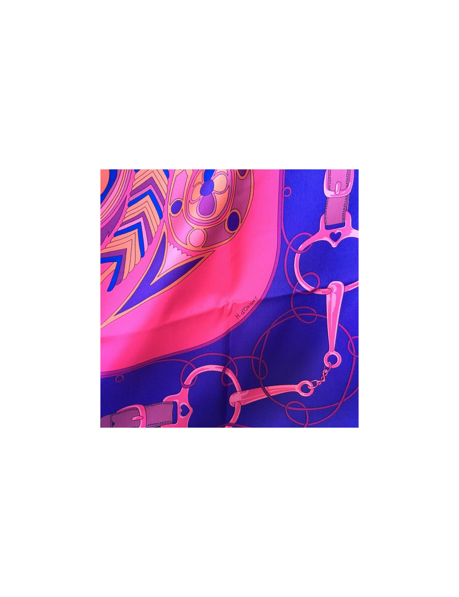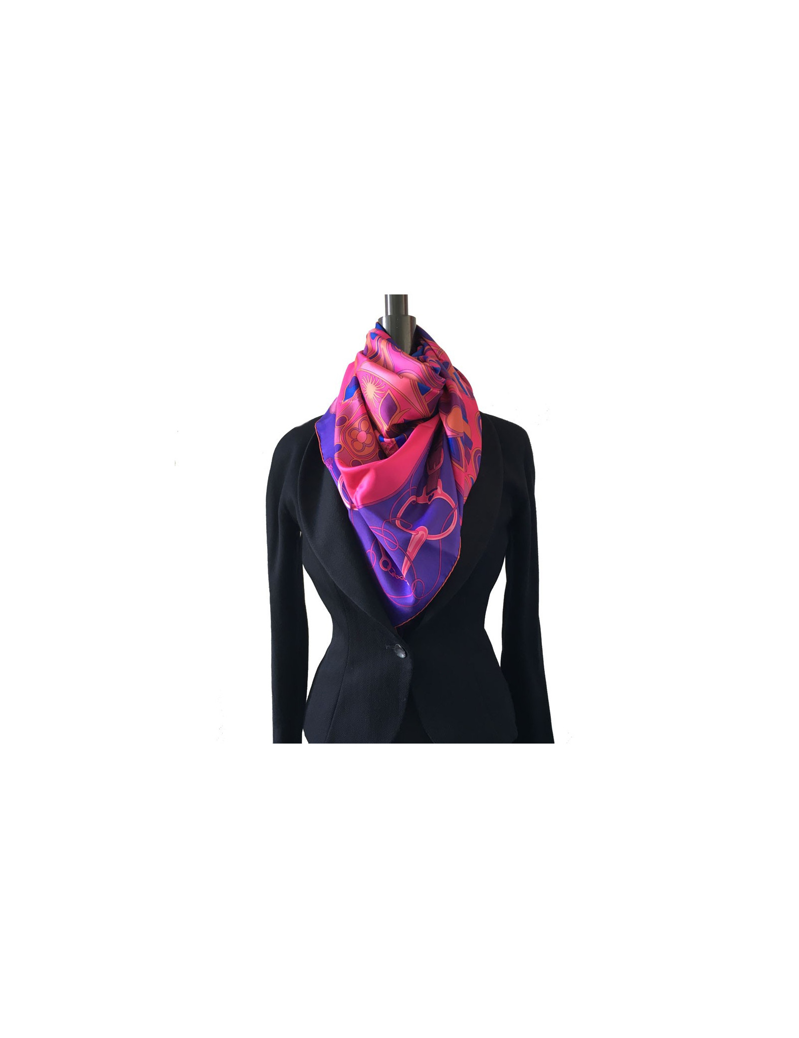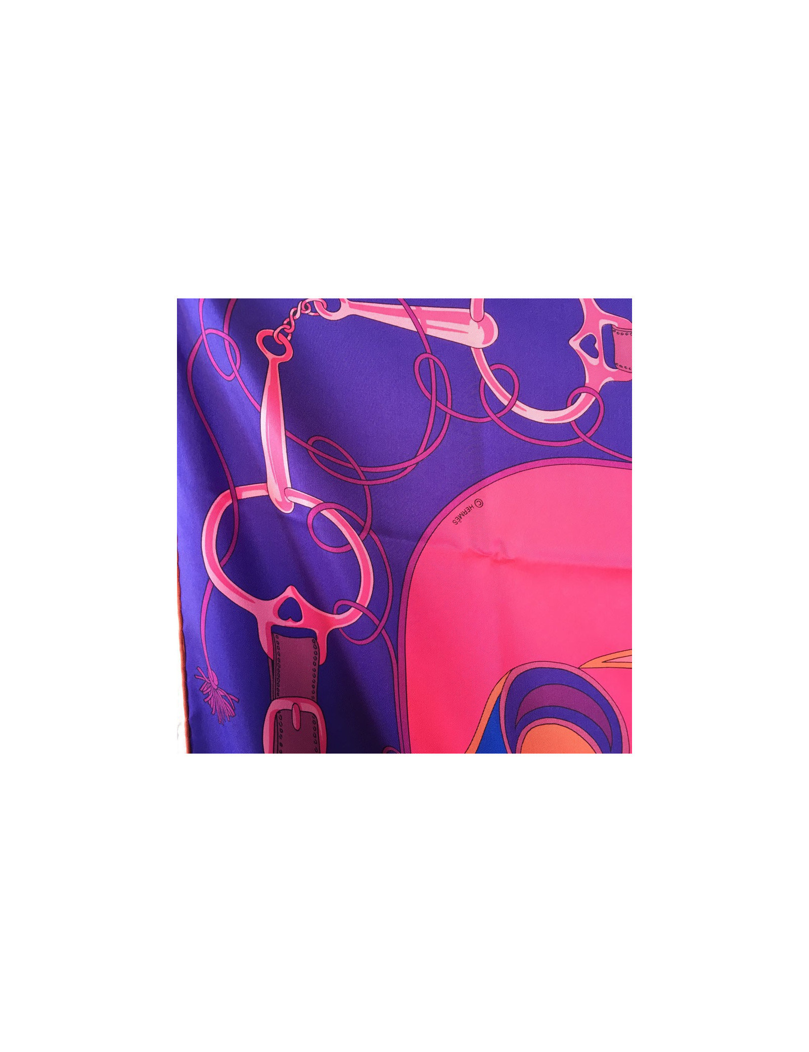 Magnifique châle HERMES "Folklore" en twill de soie rose, mauve, marron.
