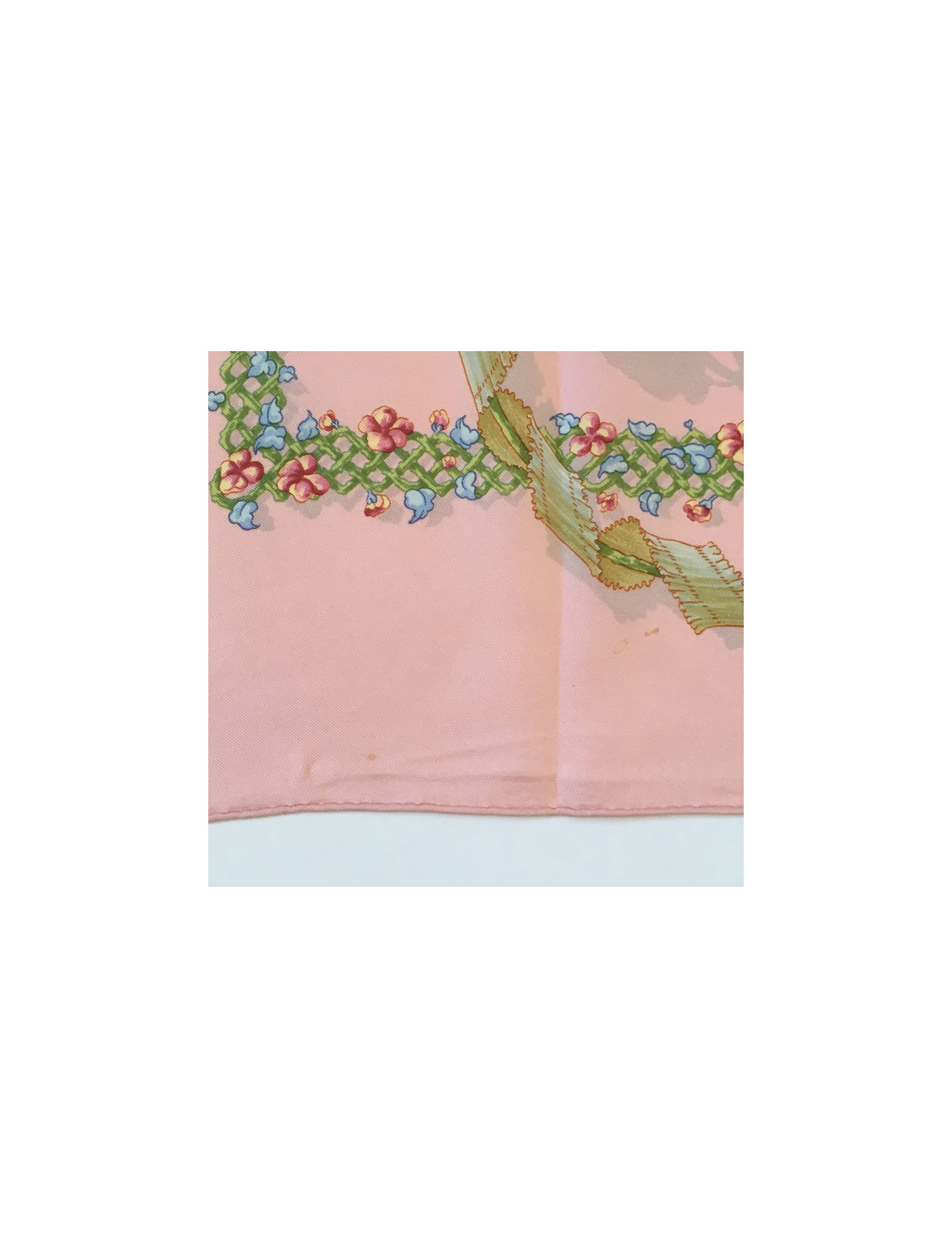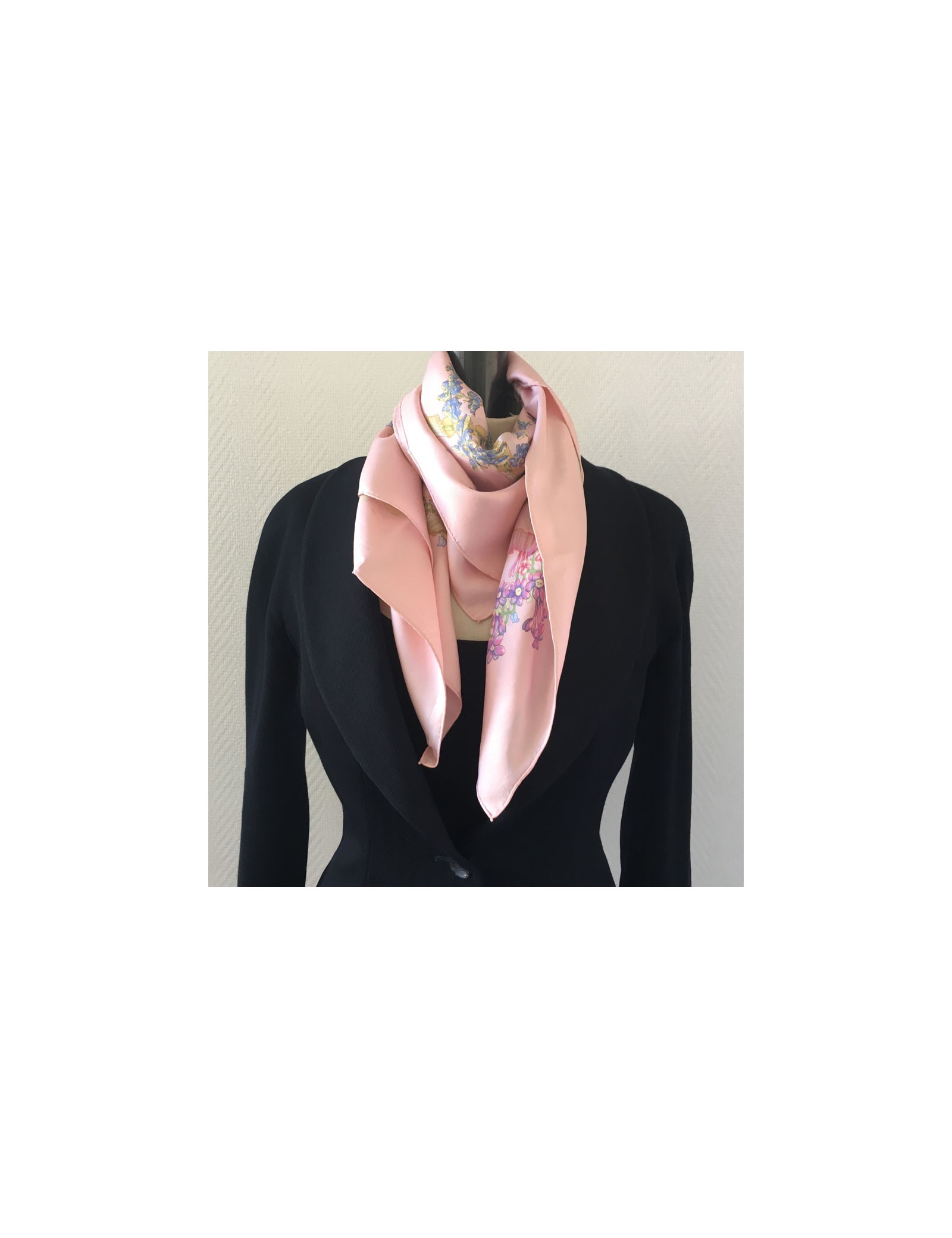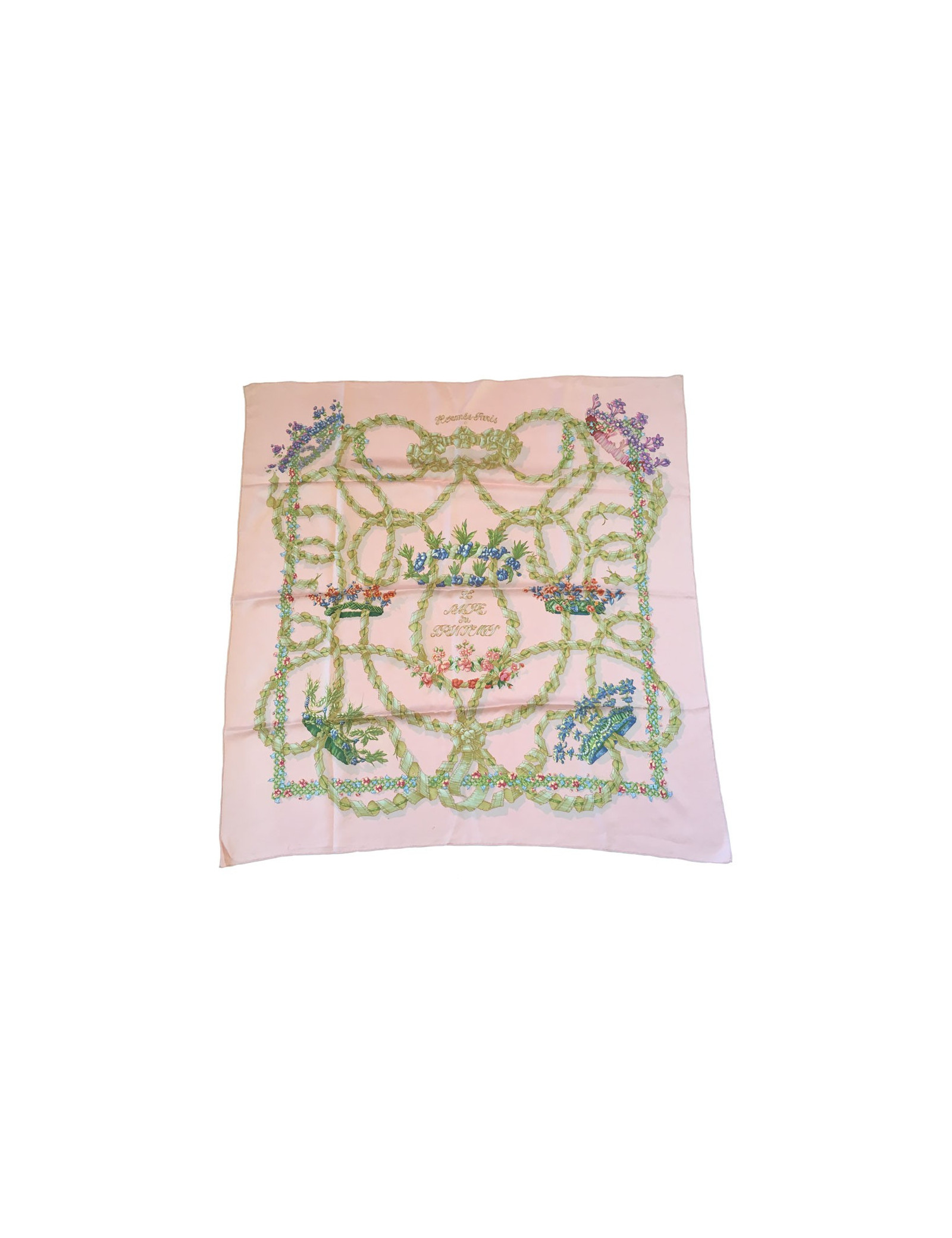Carré HERMES "Le sacre du printemps" en soie rose. En bon état. Quelques tâches persistent. Nettoyé chez un teinturier. Absence d'étiquette.