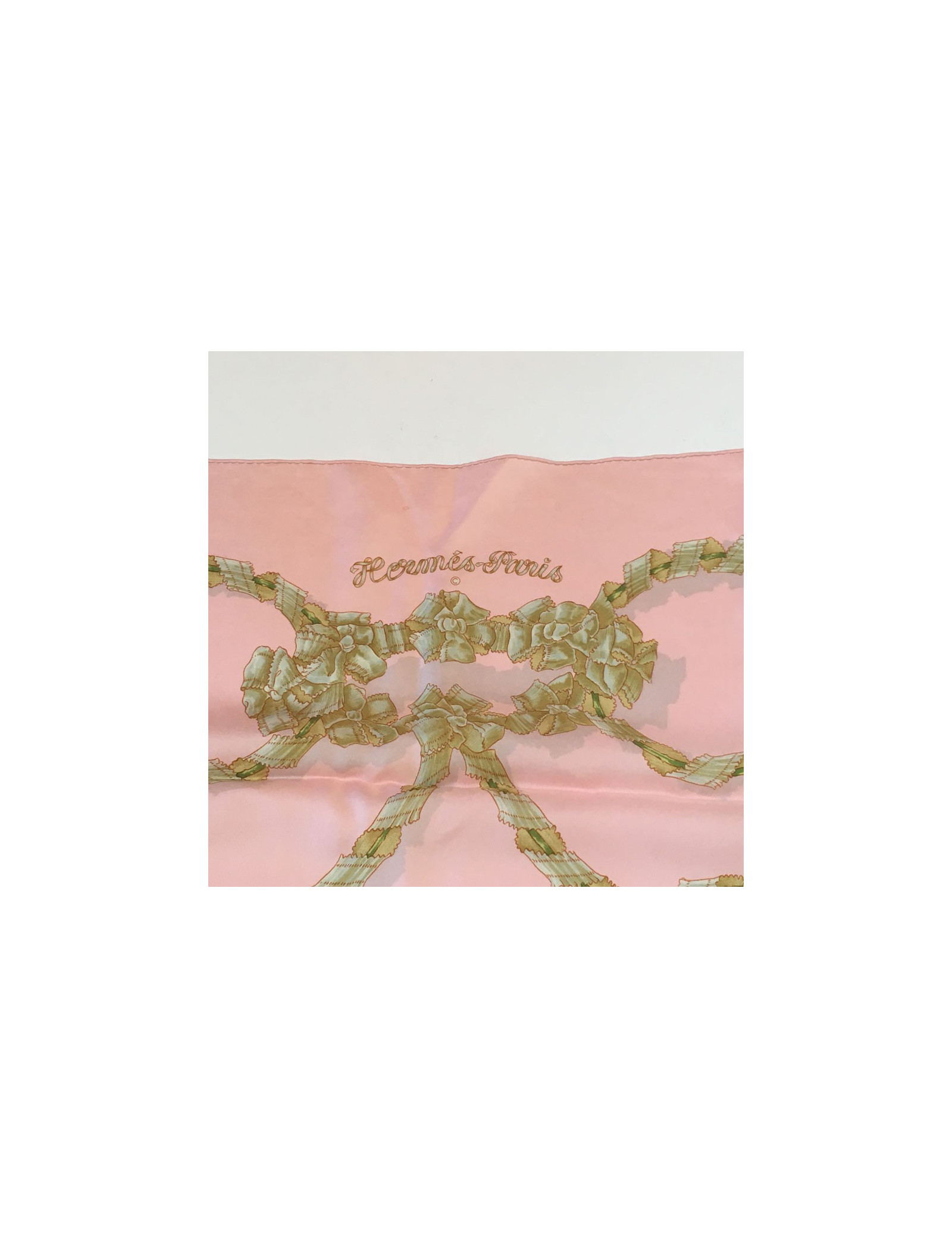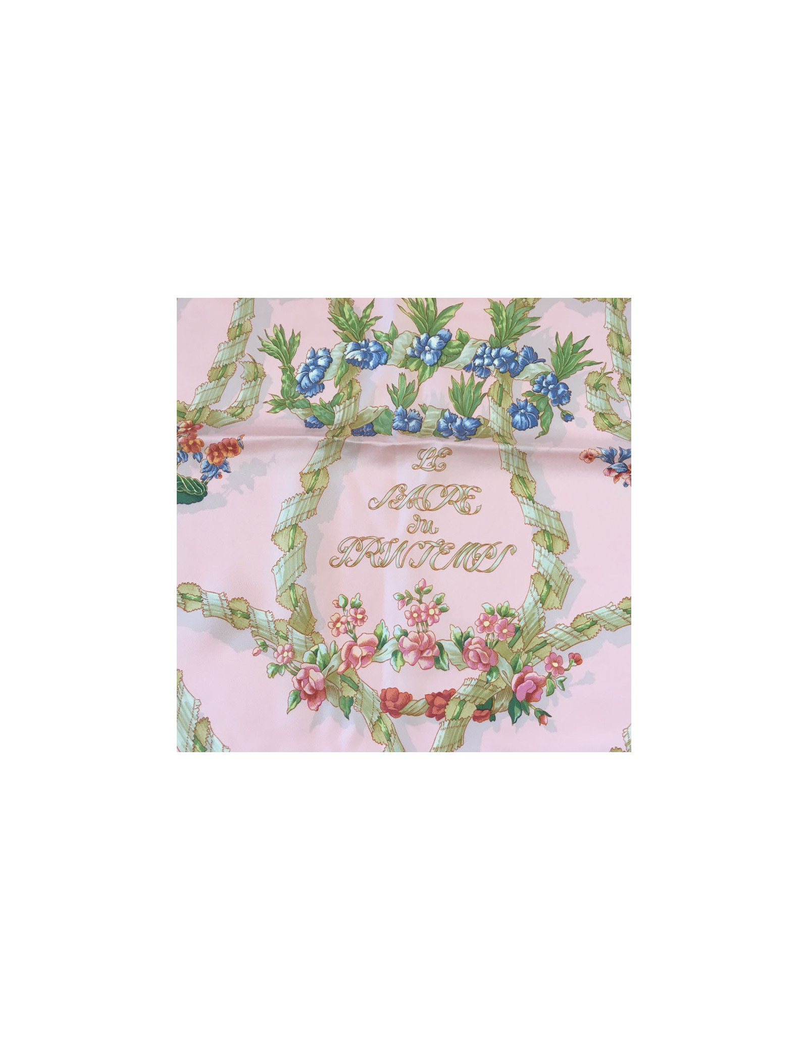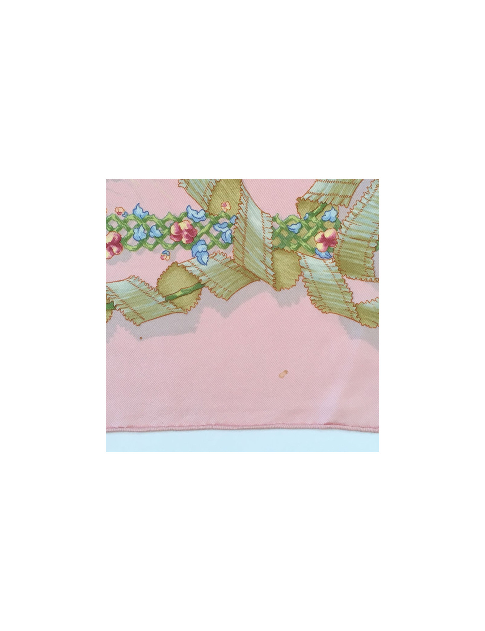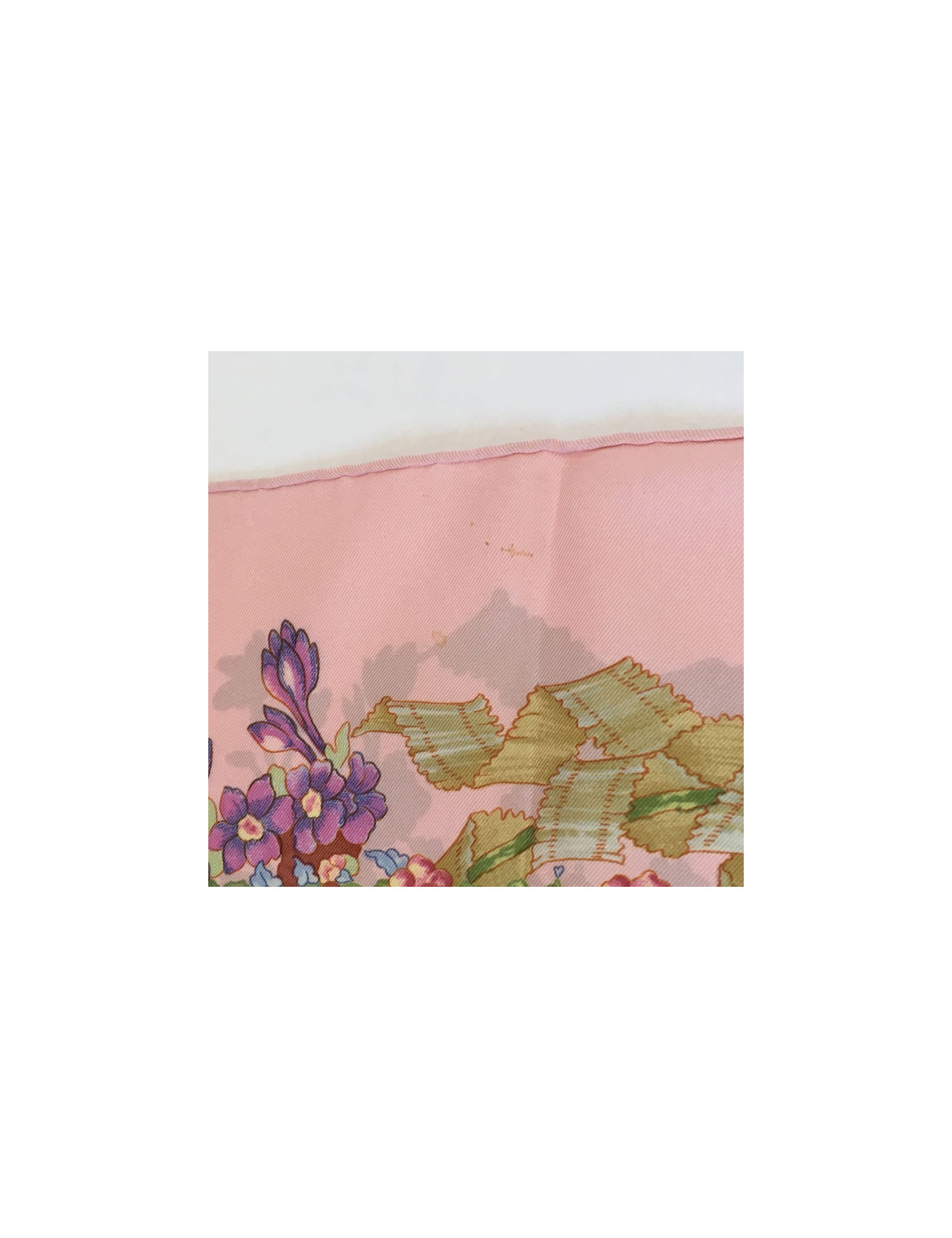 Carré HERMES "Le sacre du printemps" en soie rose. En bon état. Quelques tâches persistent. Nettoyé chez un teinturier. Absence d'étiquette.