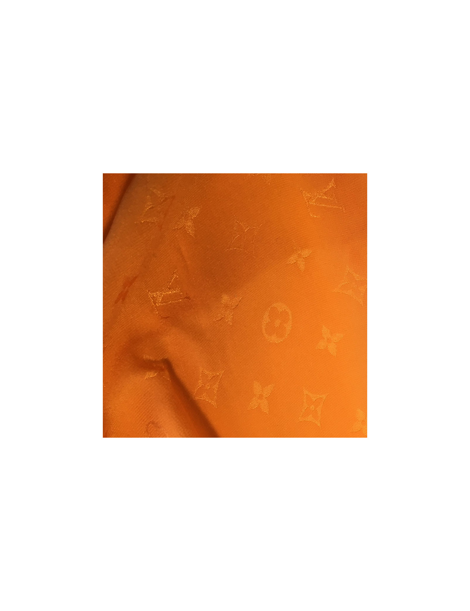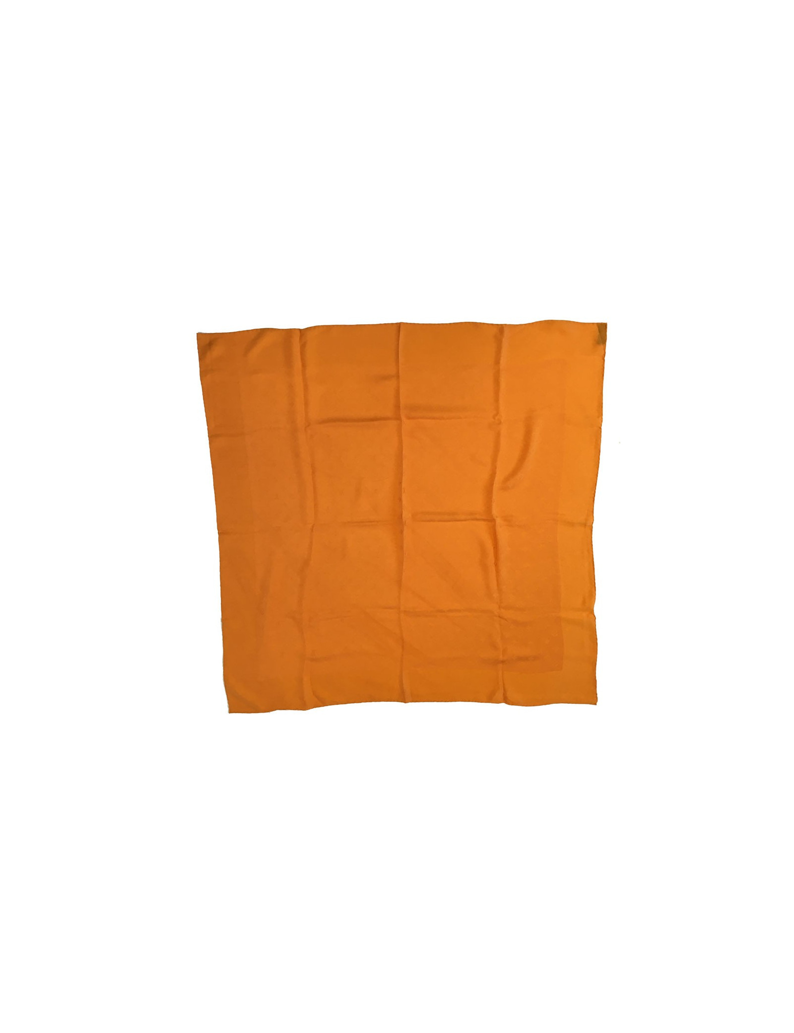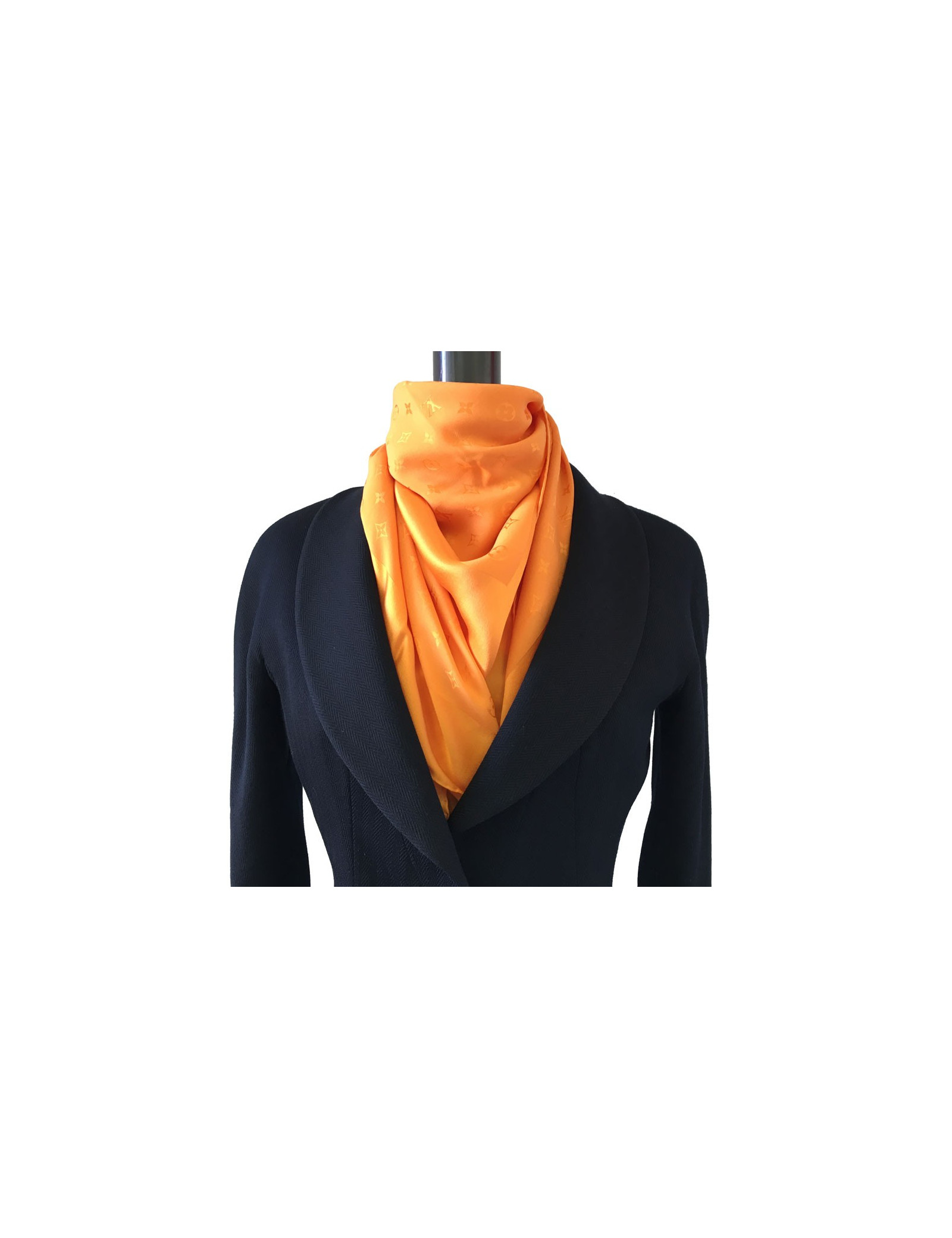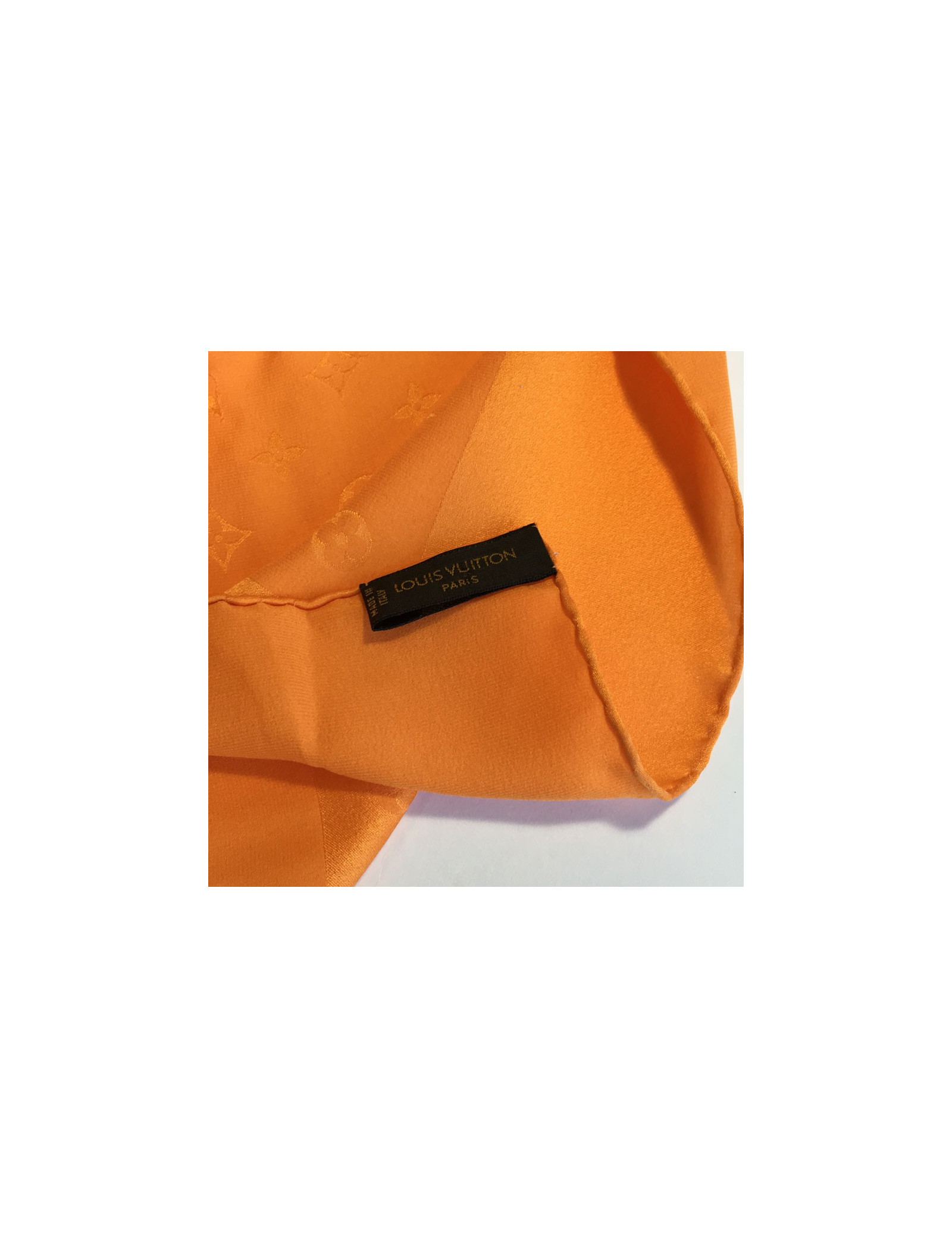 Foulard LOUIS VUITTON en soie orange. Initiales de la marque sur le fond du carré.
