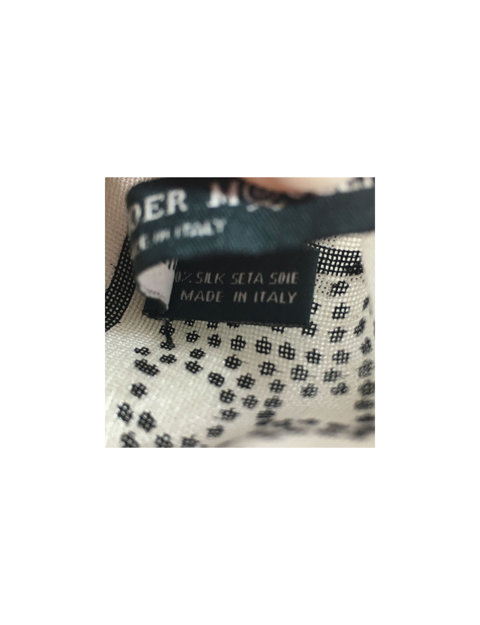 En bon état. Quelques tirettes et tâches (voir photo). Etiquette de marque et matière présente. La marque Alexander McQueen se trouve inscrite en noir en bas de l'étole sur le devant.