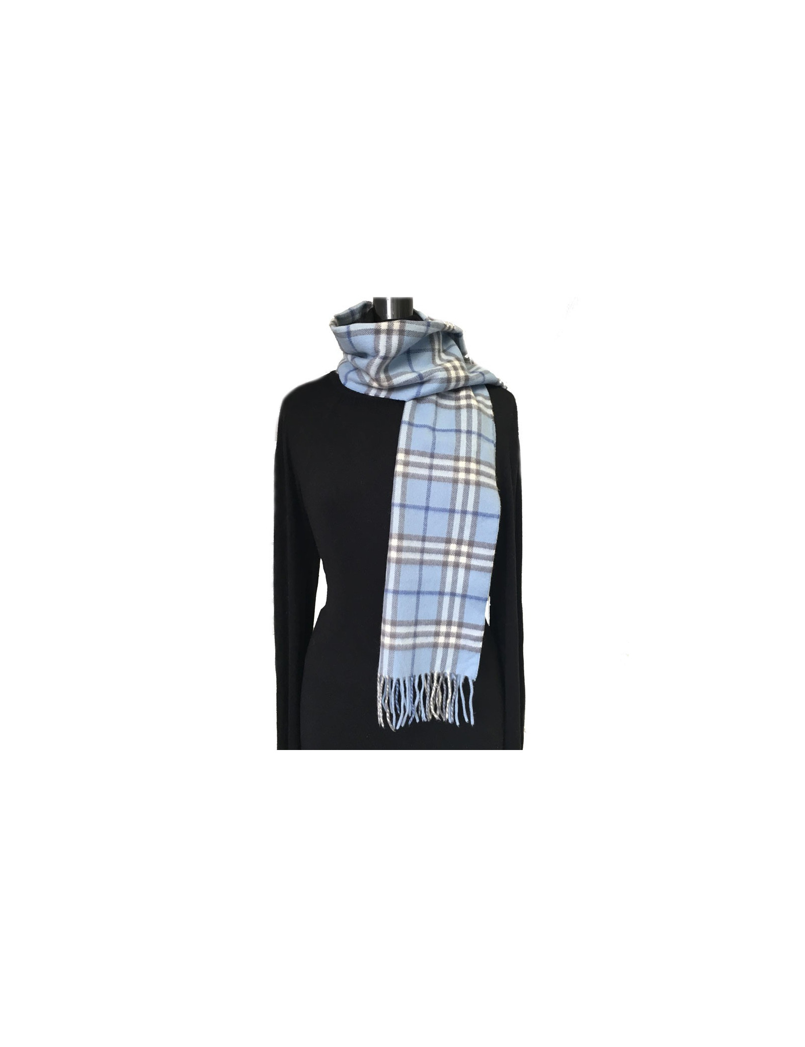 Echarpe Burberry à franges, motif tartan bleu en cachemire.