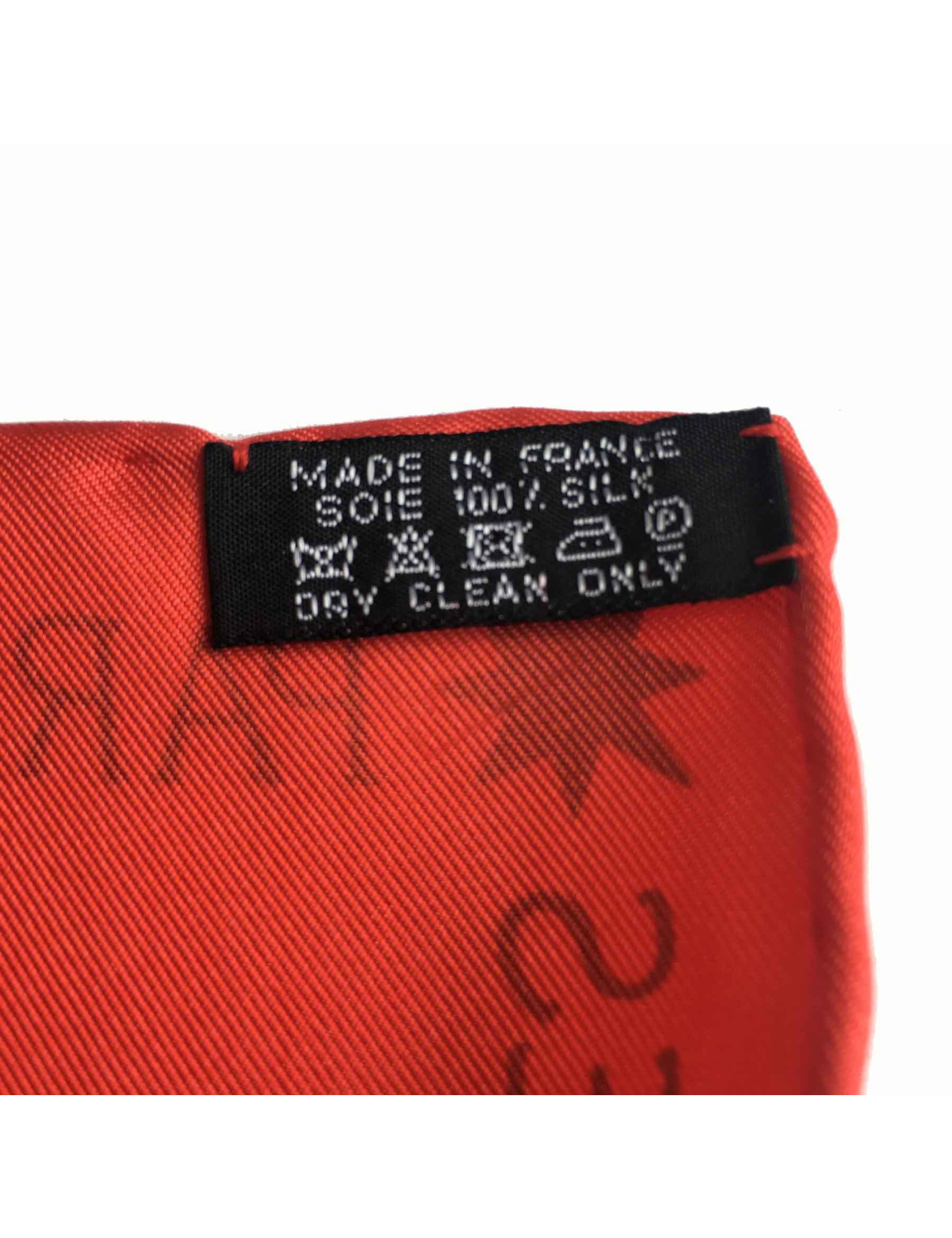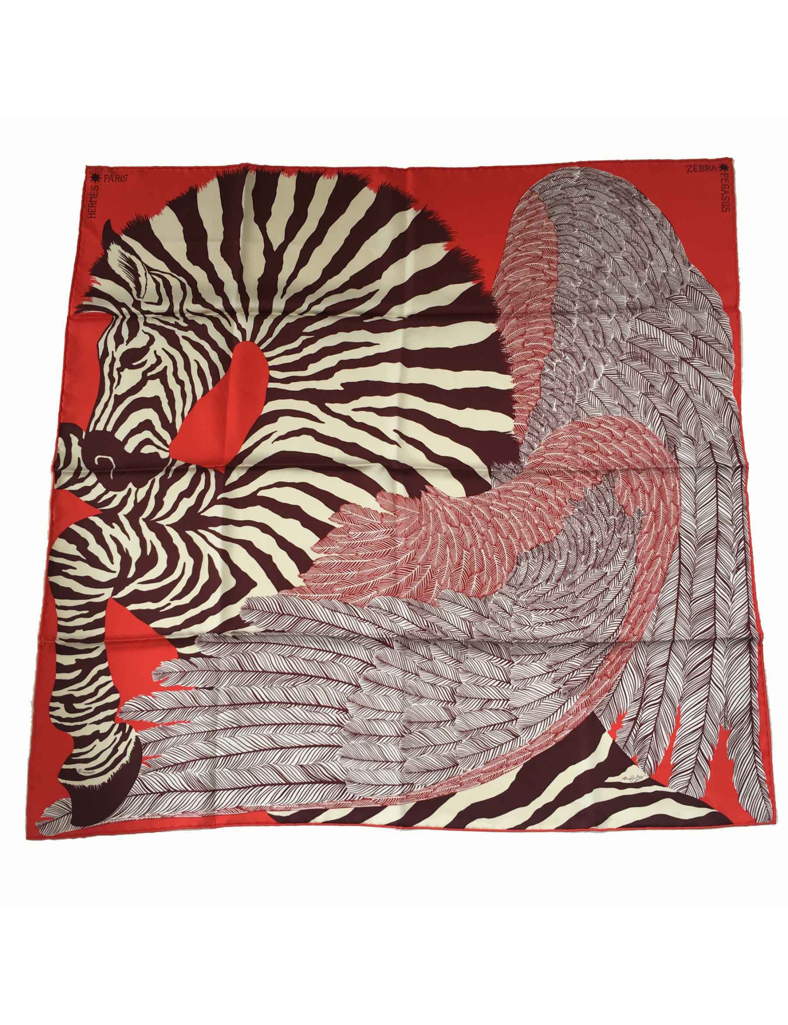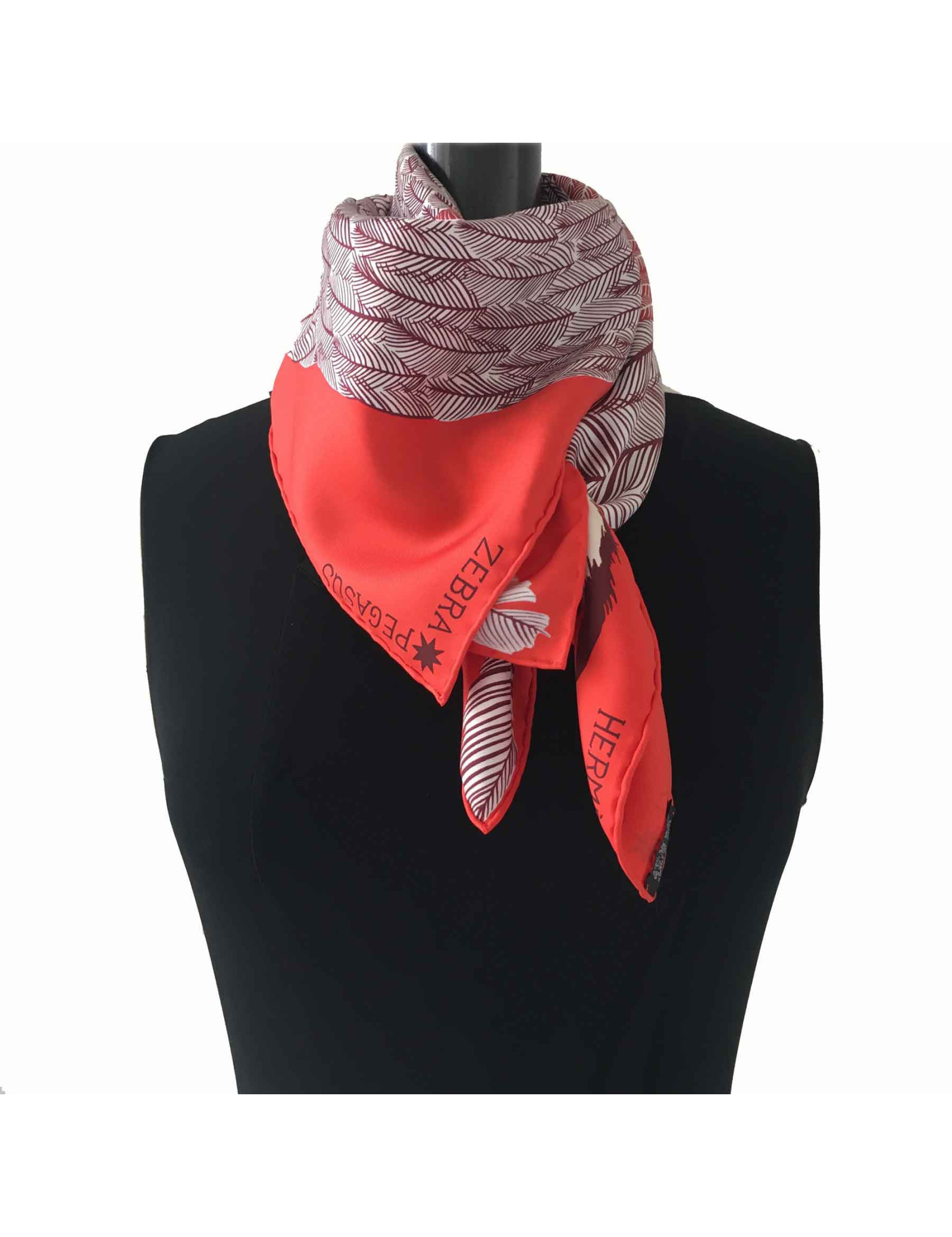 Très beau carré Hermès 'ZEBRA PEGASUS' en soie rouge, violet et beige.