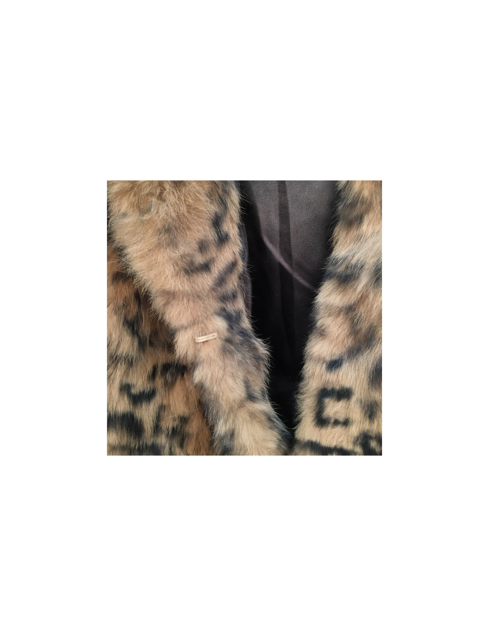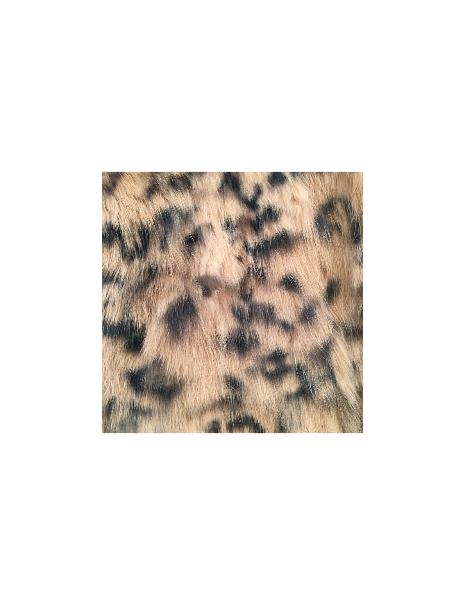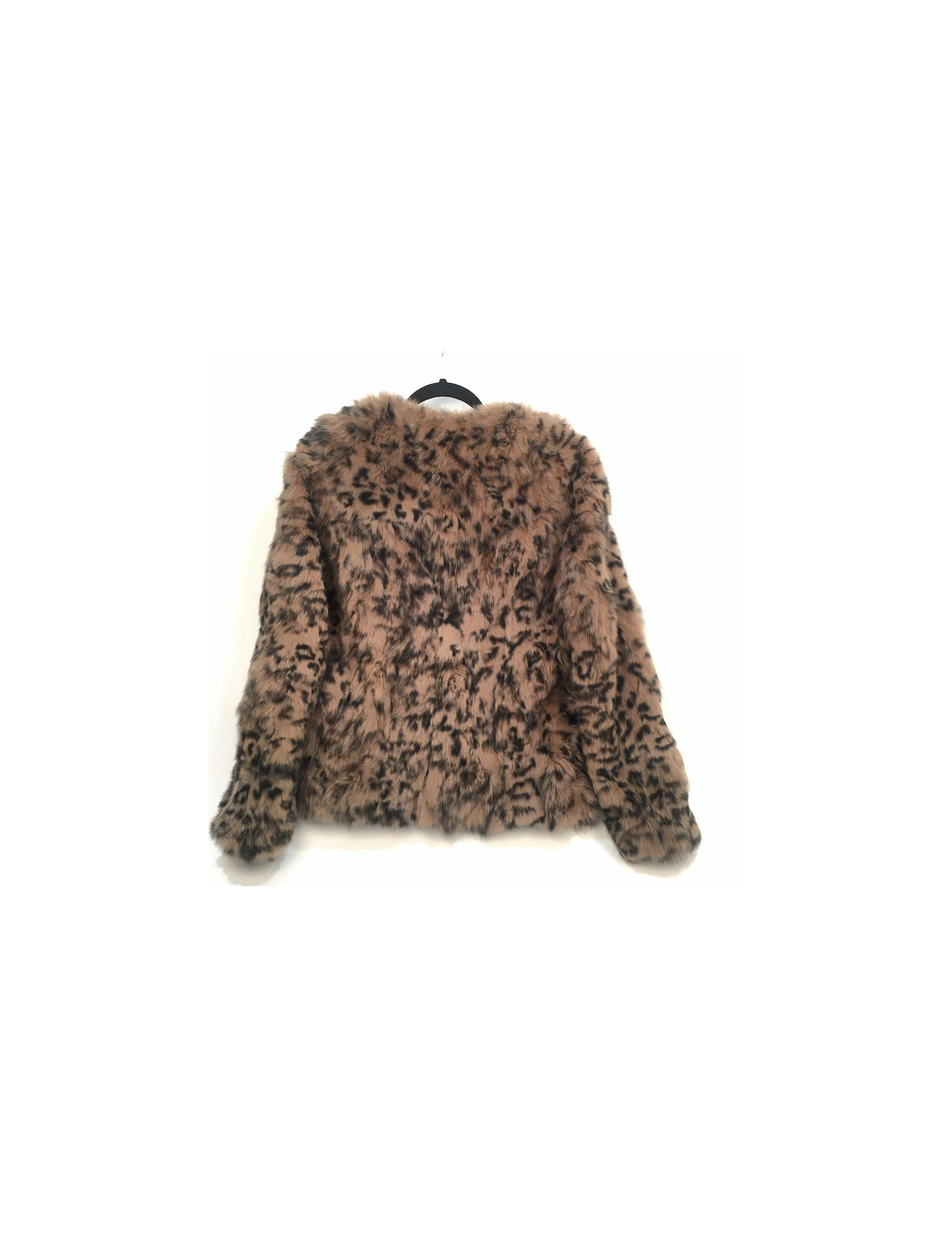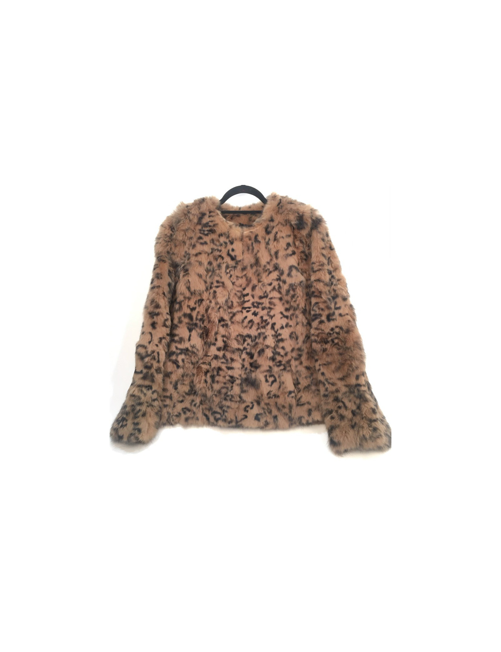 Jolie petite veste de fourrure en lapin, imprimée façon léopard. Taille Médium, équivaut à un 38 FR. Veste sans col avec une doublure noire en polyester. Se ferme à l'aide de 4 crochets. Deux poches passepoil de chaque côté.