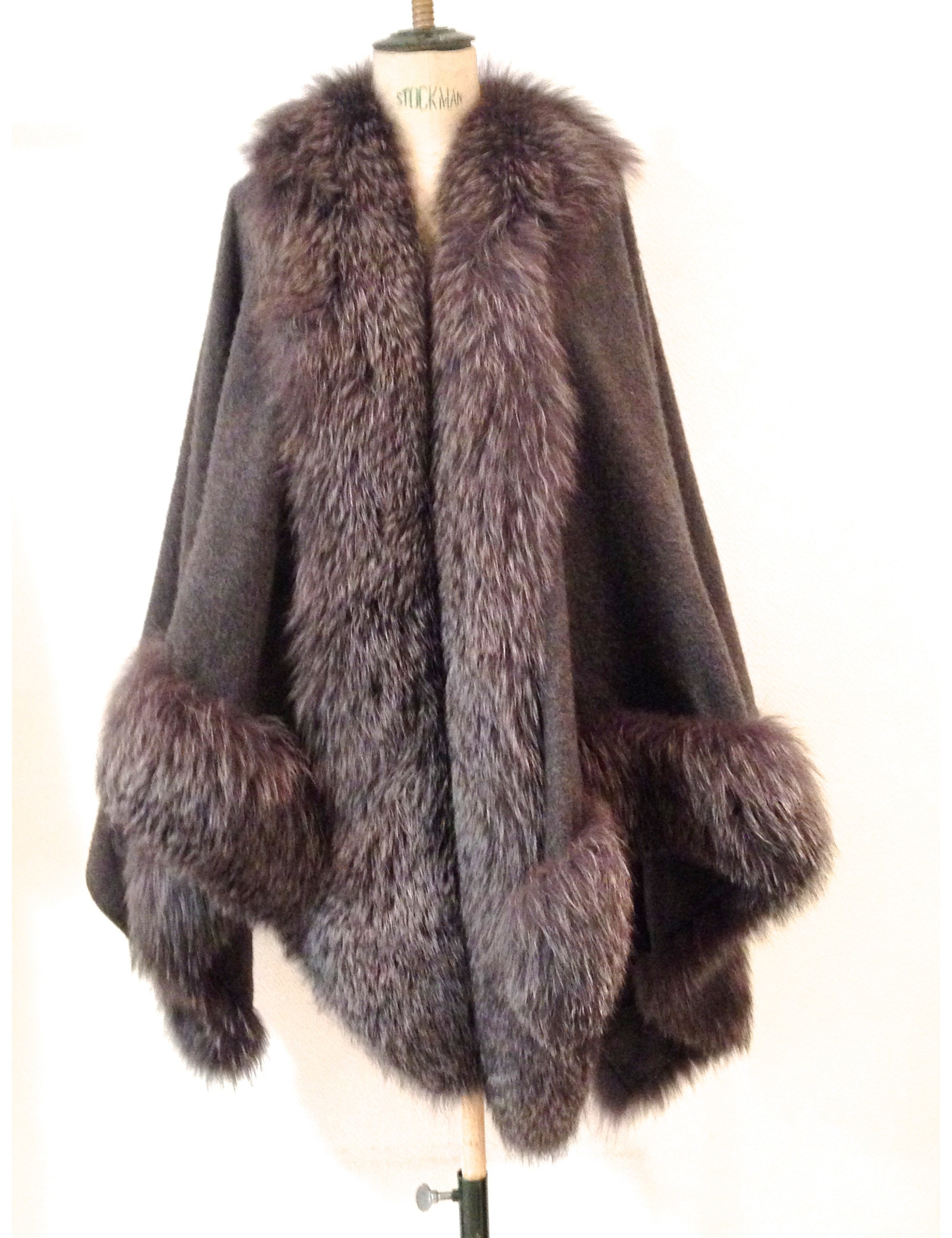 Belle cape Couture CHRISITAN DIOR en cachemire gris soutenu et bordée d'une large fourrure (RENARD argenté). on peut la porter de jour, de façon décontractée et le soir sur de jolies tenues.