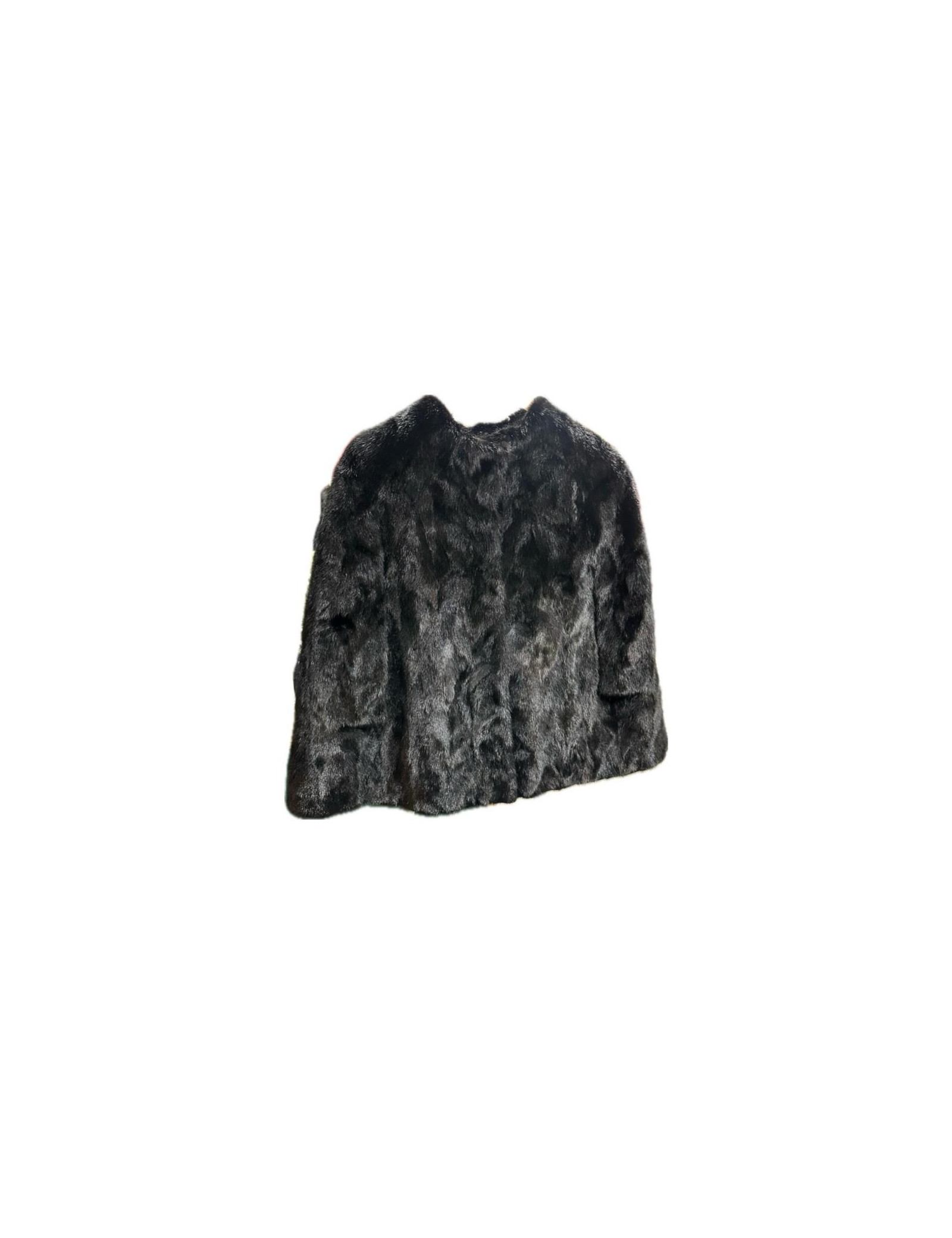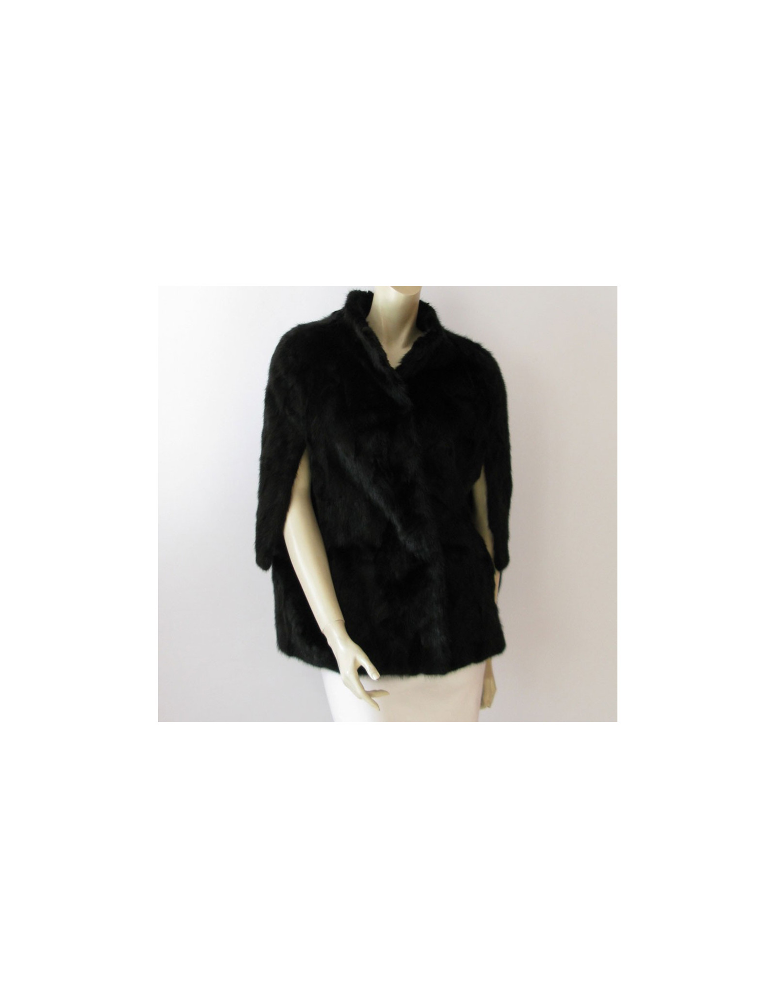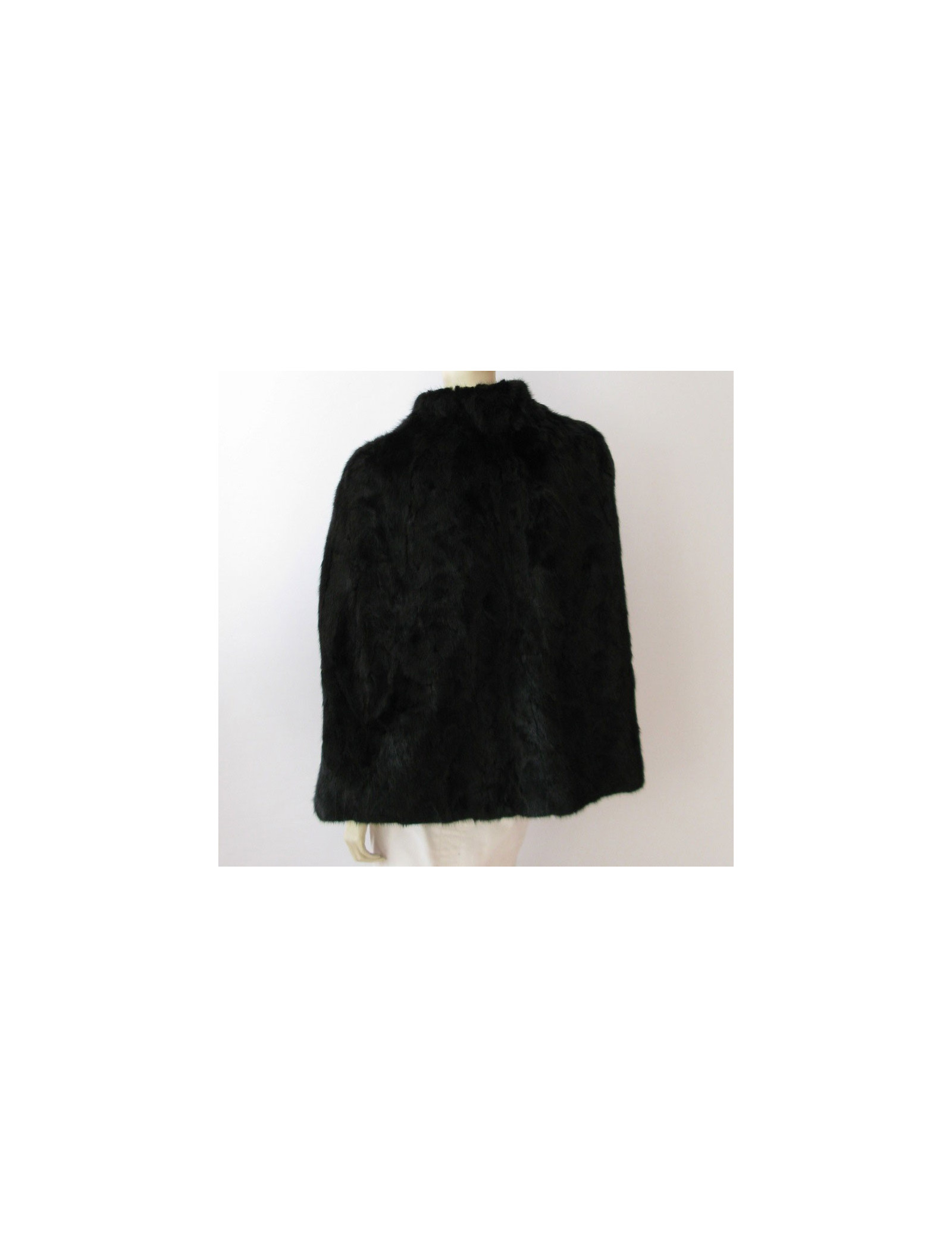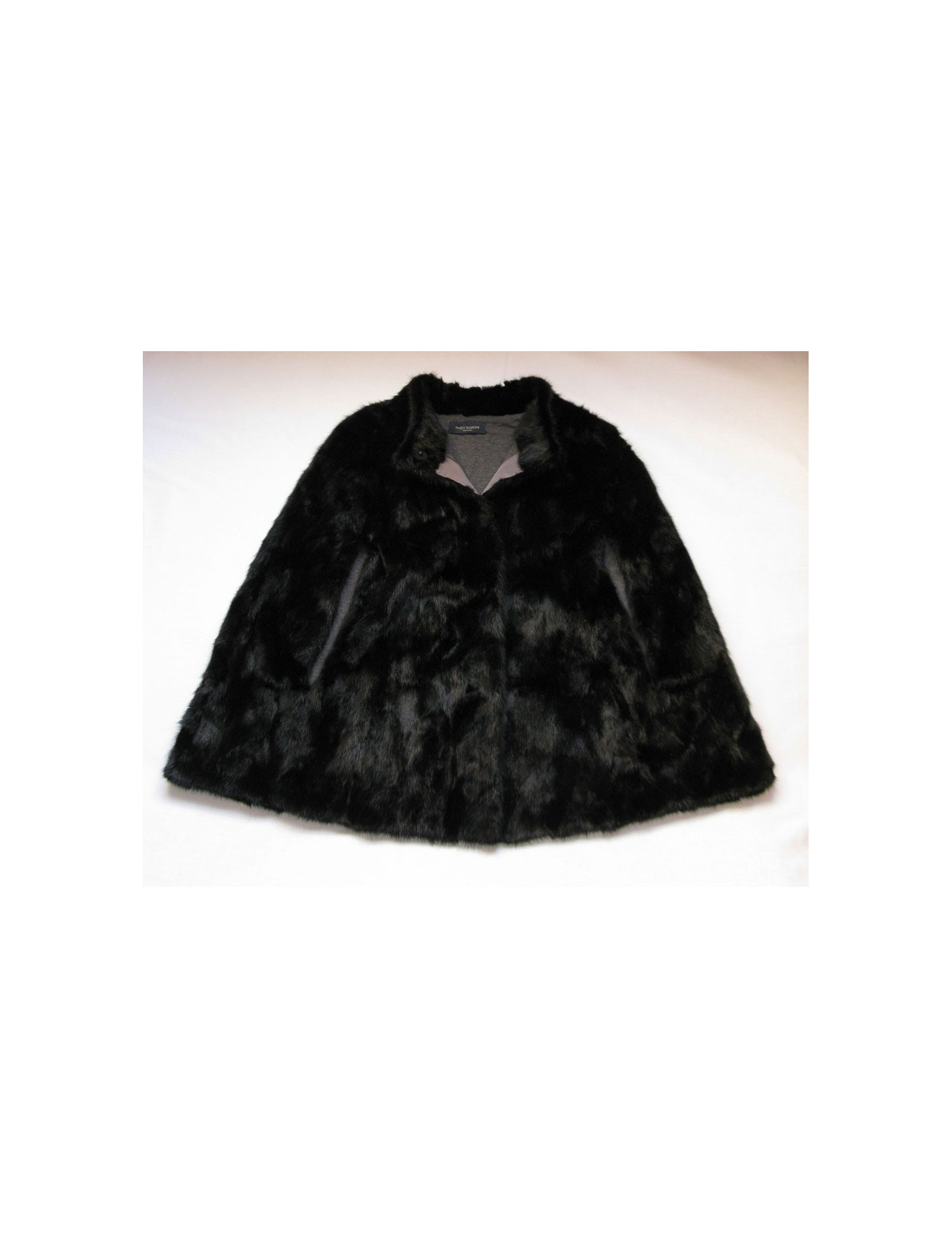 Cape PIAZZA SEMPIONE en vison noir, sans manches, fente d'aisance pour y passer les bras, encolure ras du cou, poches invisibles en biais sur les côtés.