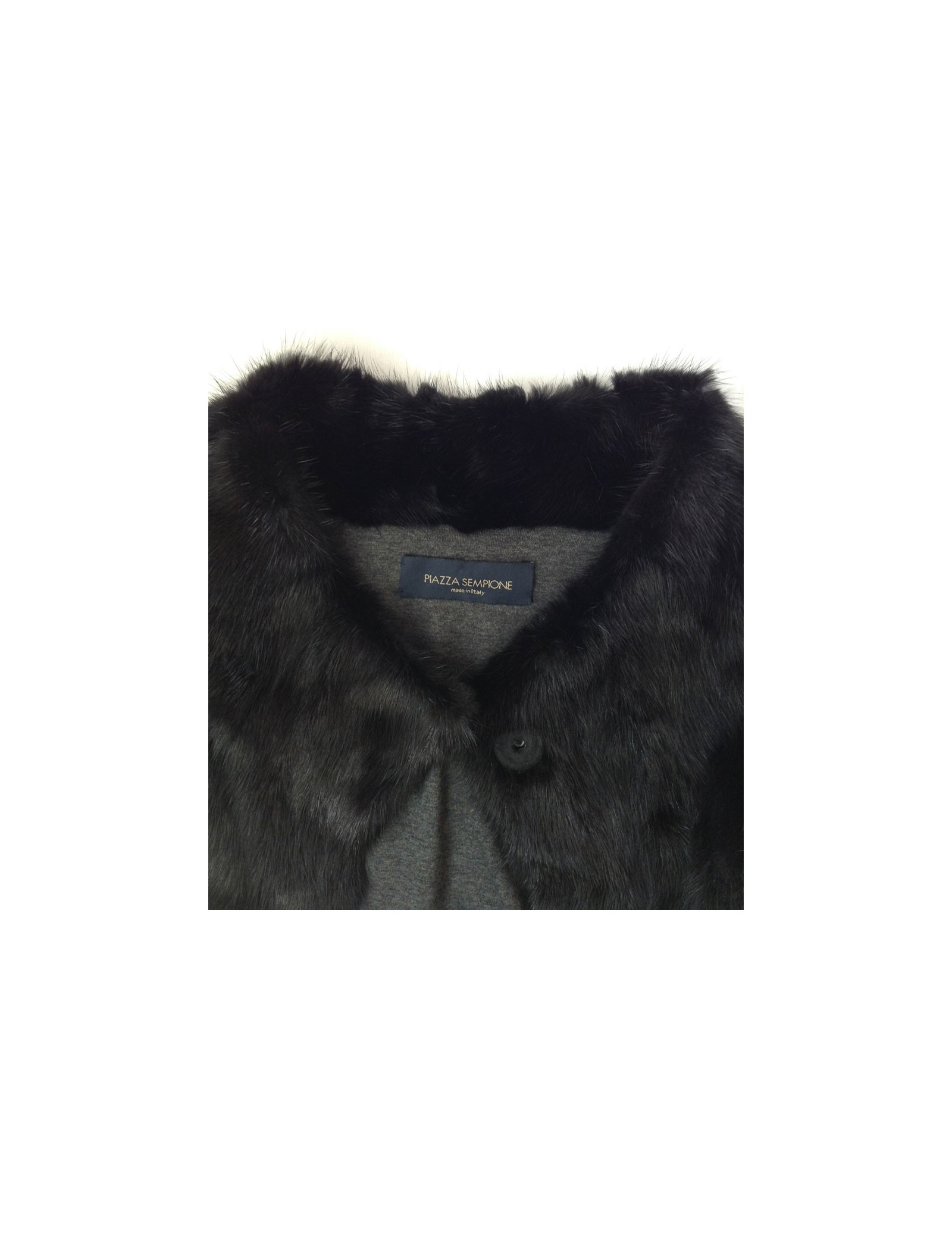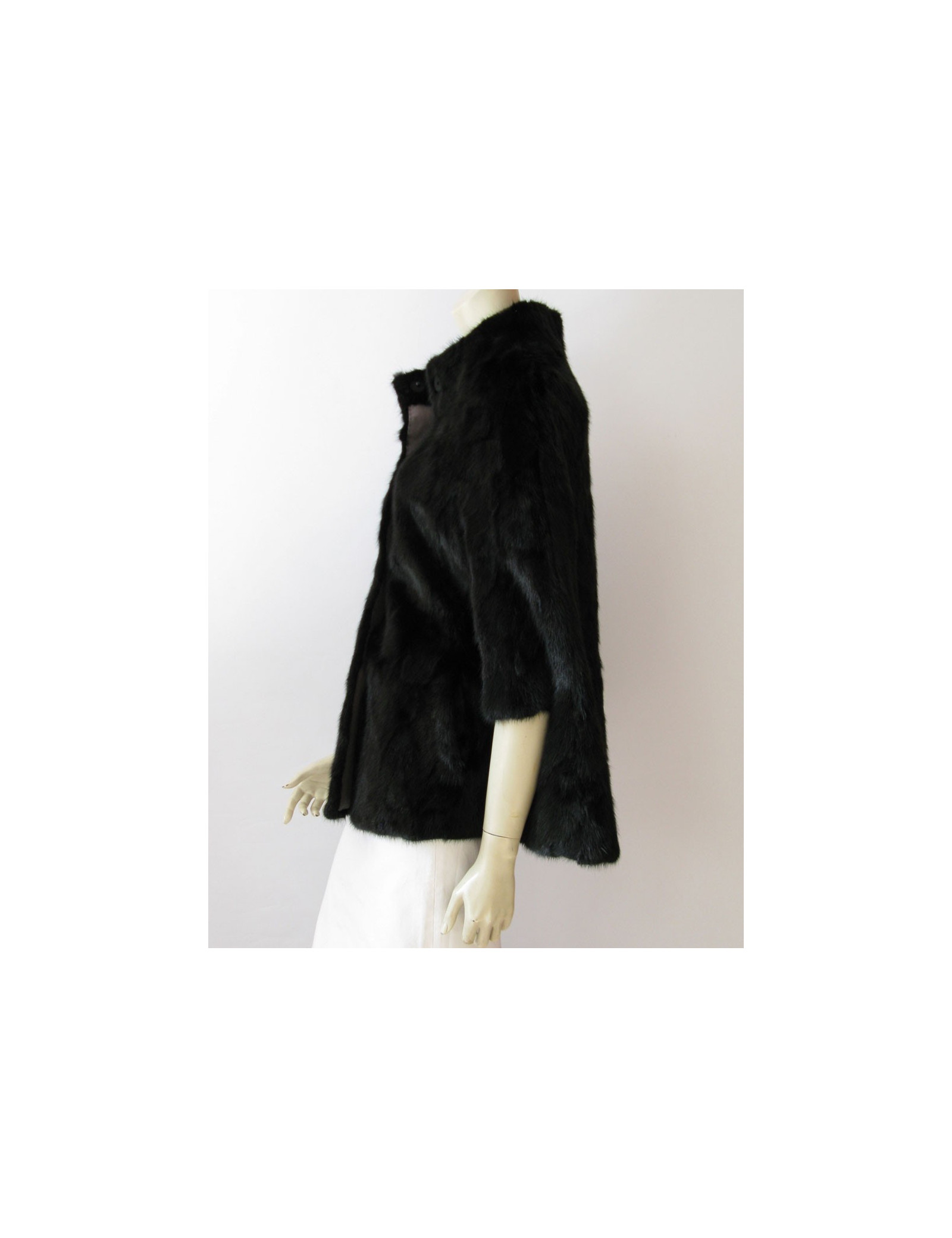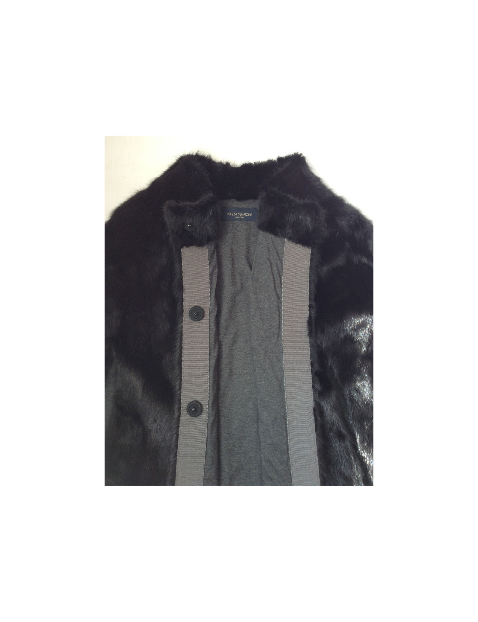Fermeture frontale par 4 boutons gris anthracite à pressions doublés à l'intérieur d'une jolie bande en gros grain gris clair assortie à la doublure et aux boutons. Taille 38fr voir même 40fr. 100% vison.