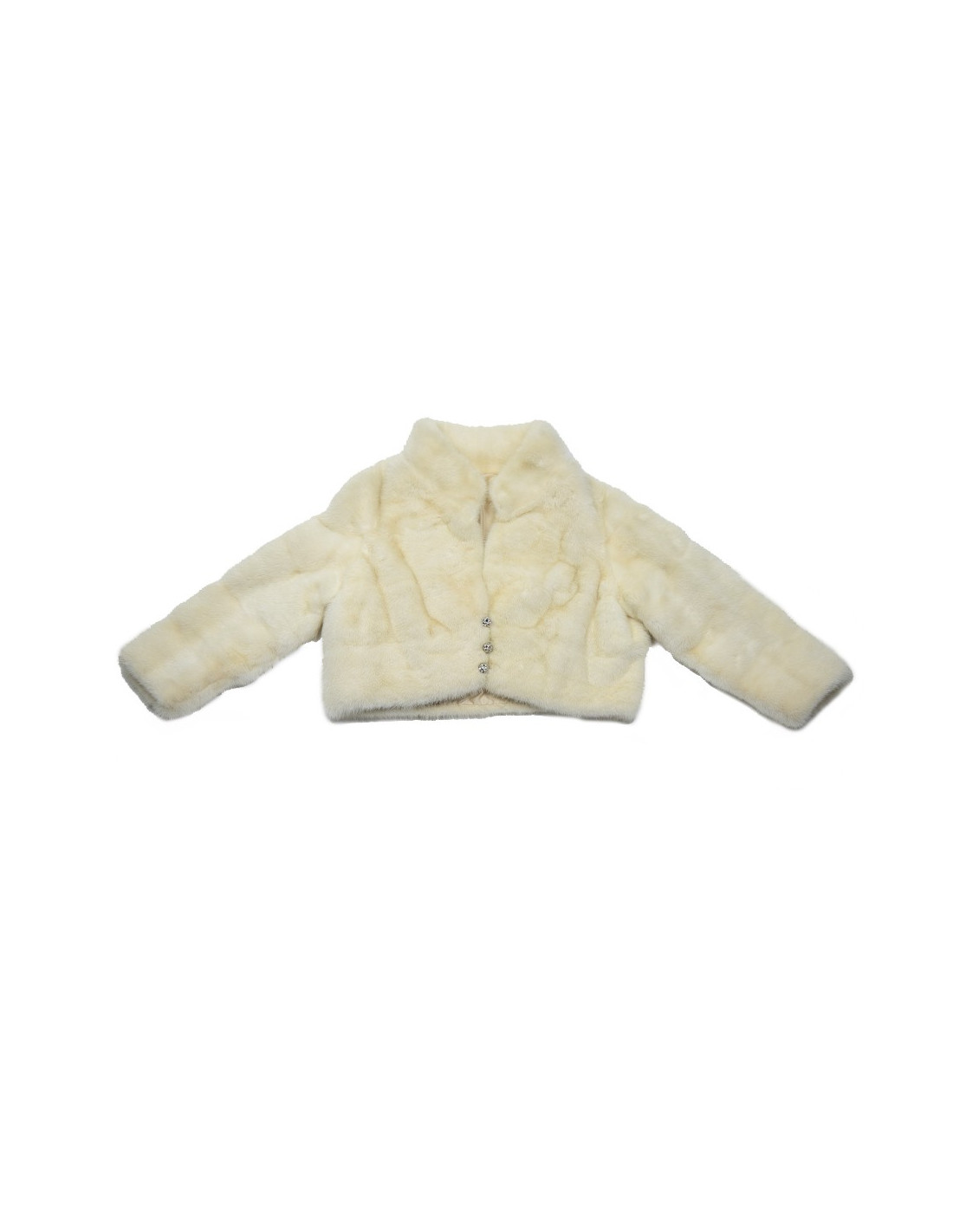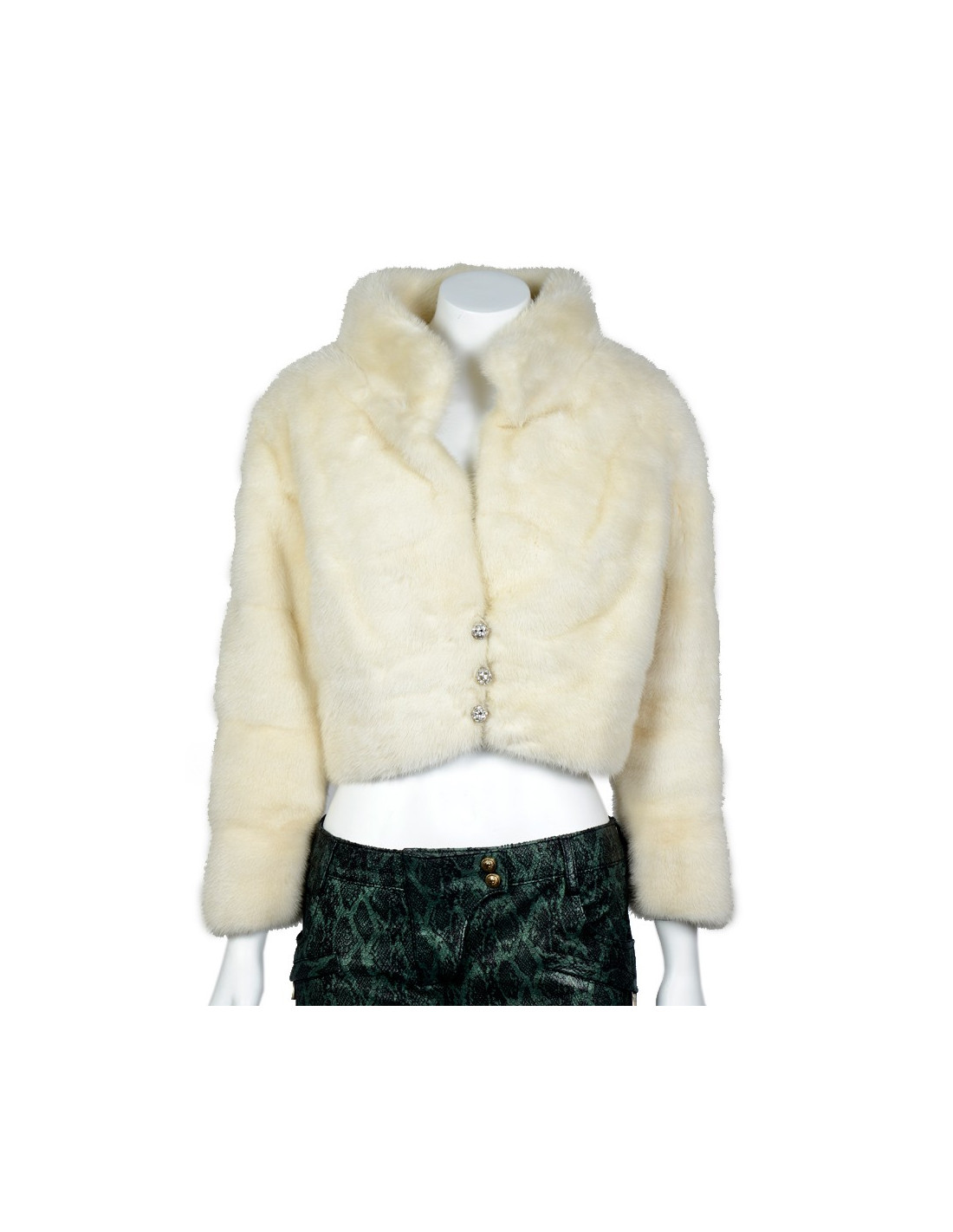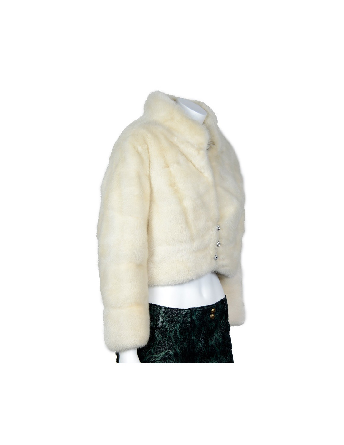 Très élégante veste courte de la Maison Pary fourrure en vison blanc cassé. Pas d'étiquette de taille, équivaut à un 40. Elle se ferme à l'aide de 3 boutons couture en strass. L'intérieur est en soie avec une poche en biais sur le côté. En très bon état.