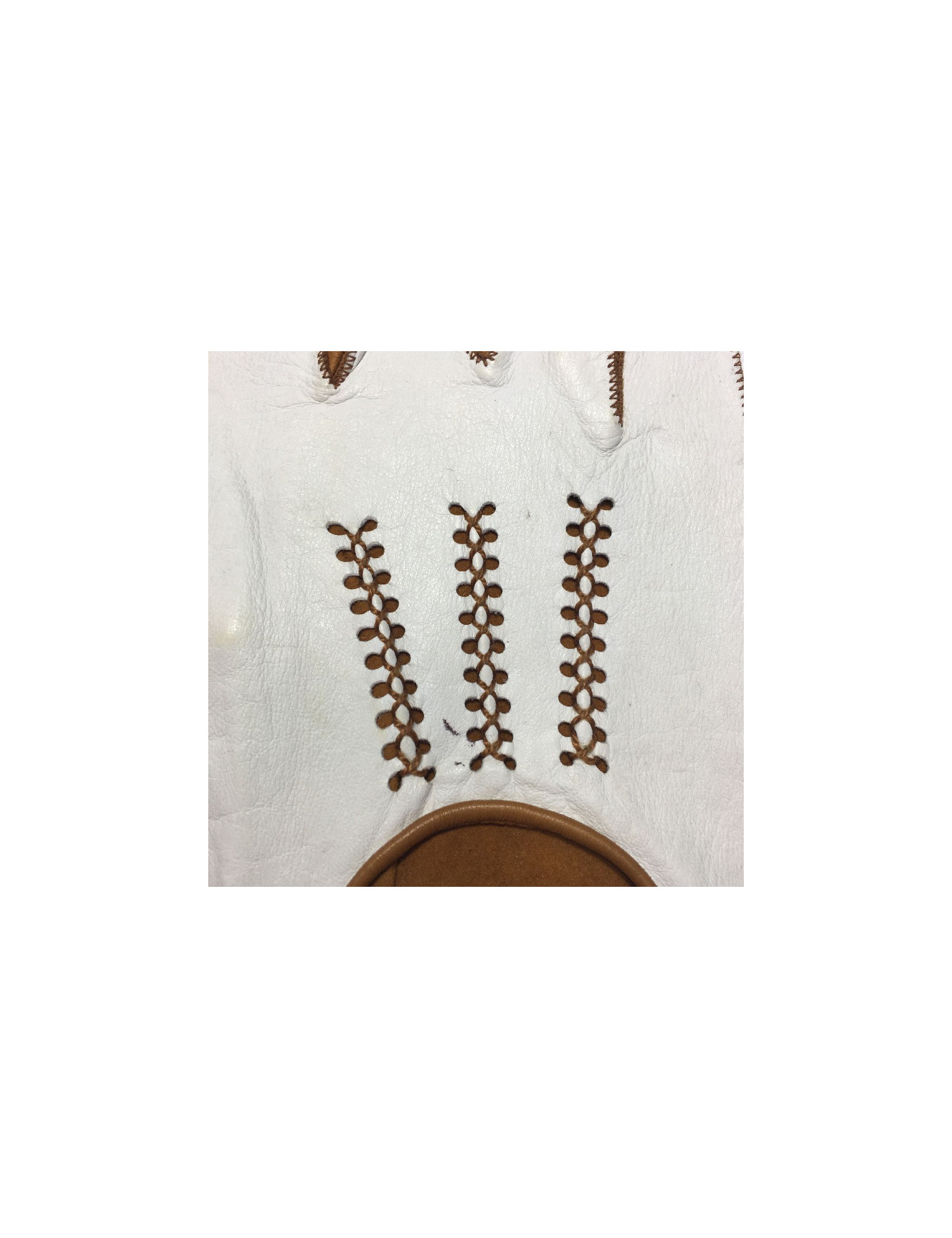 Belles surpiqûres de couleur caramel sur le cuir blanc.