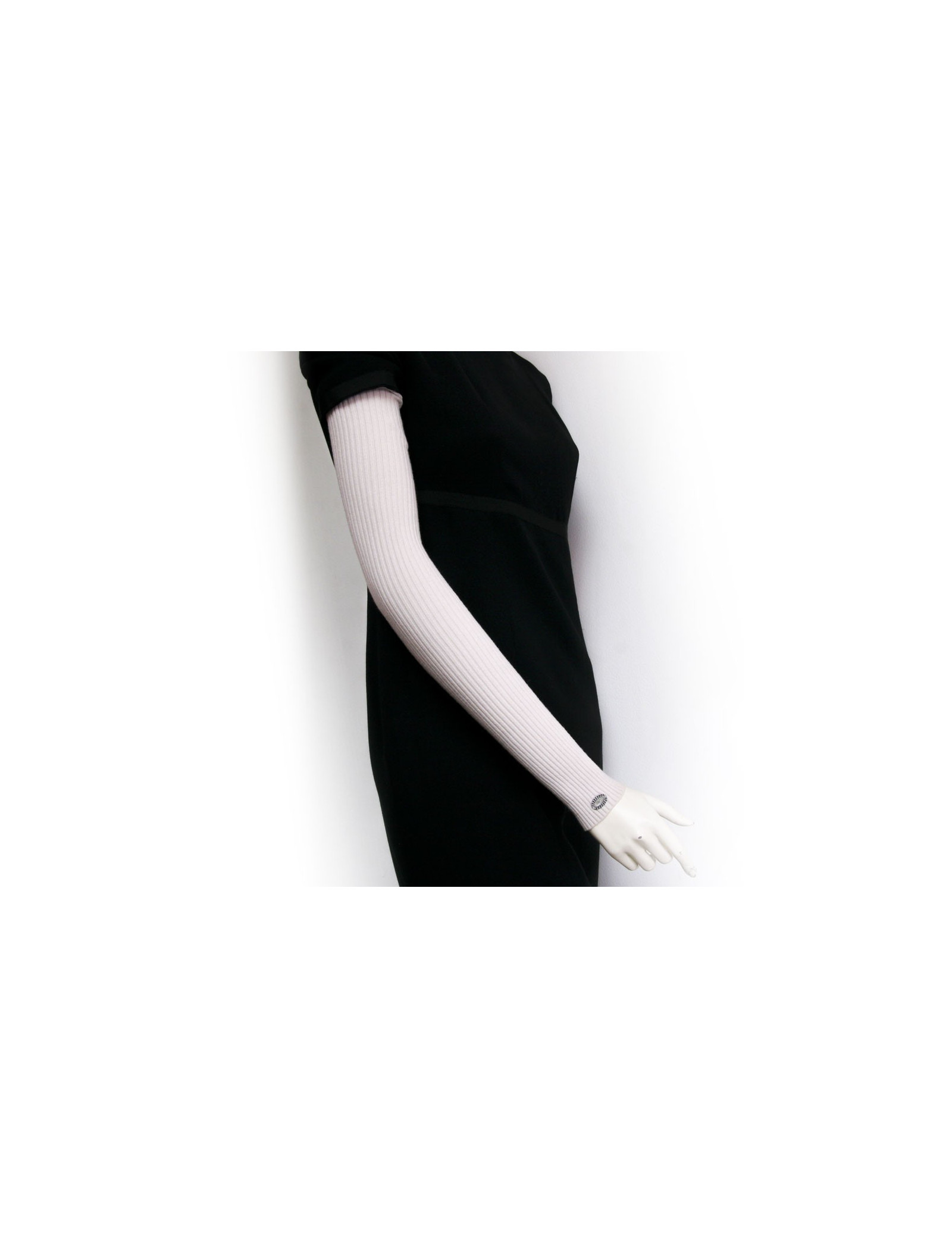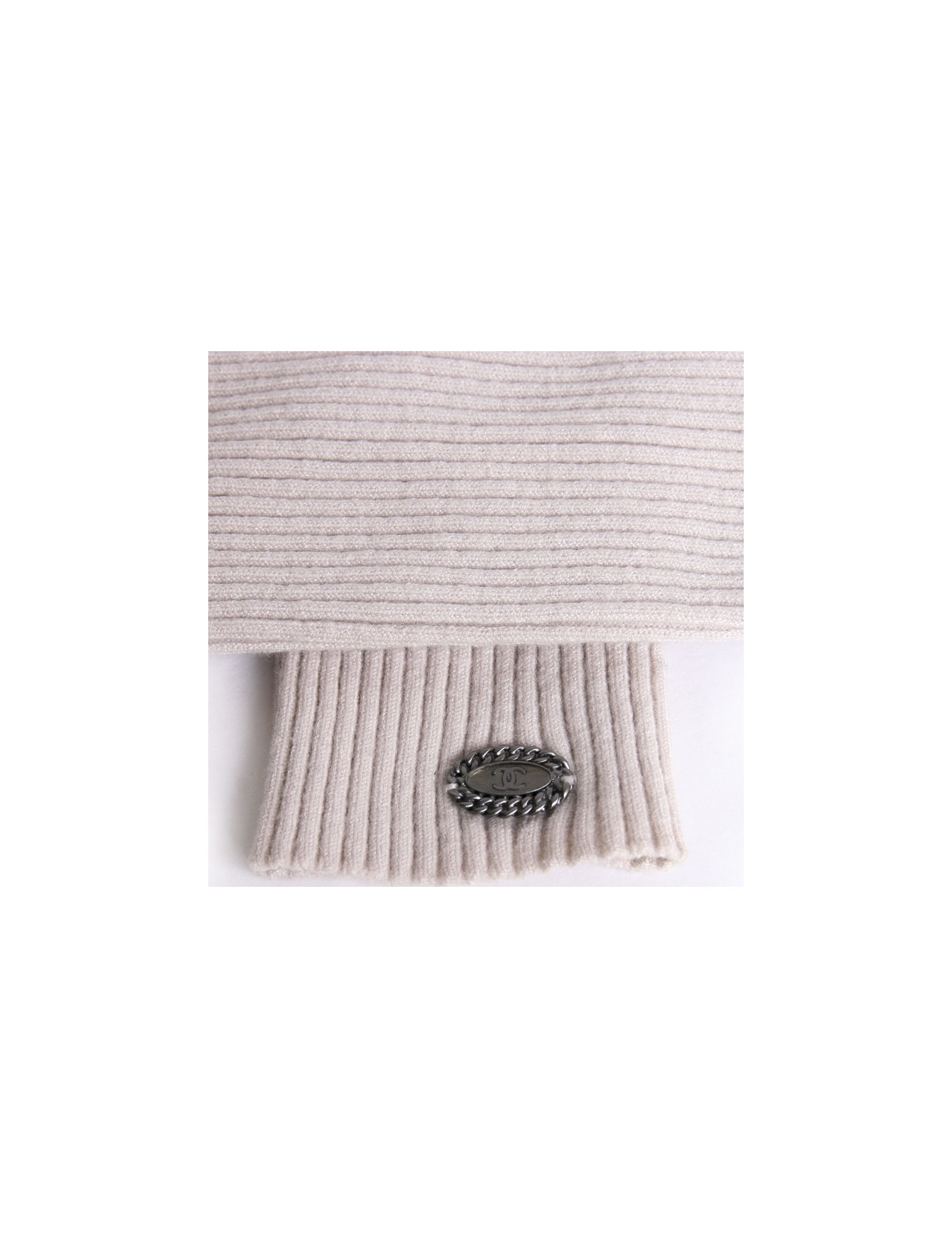 Manchons Chanel, taille 1 en laine et viscose beige. Idéal pour garder vos bras bien au chaud, ils pourront vous servir en toutes saisons. Petit sigle en métal argent signée Chanel à l'extrémité des 2 manchons. Très bon état
