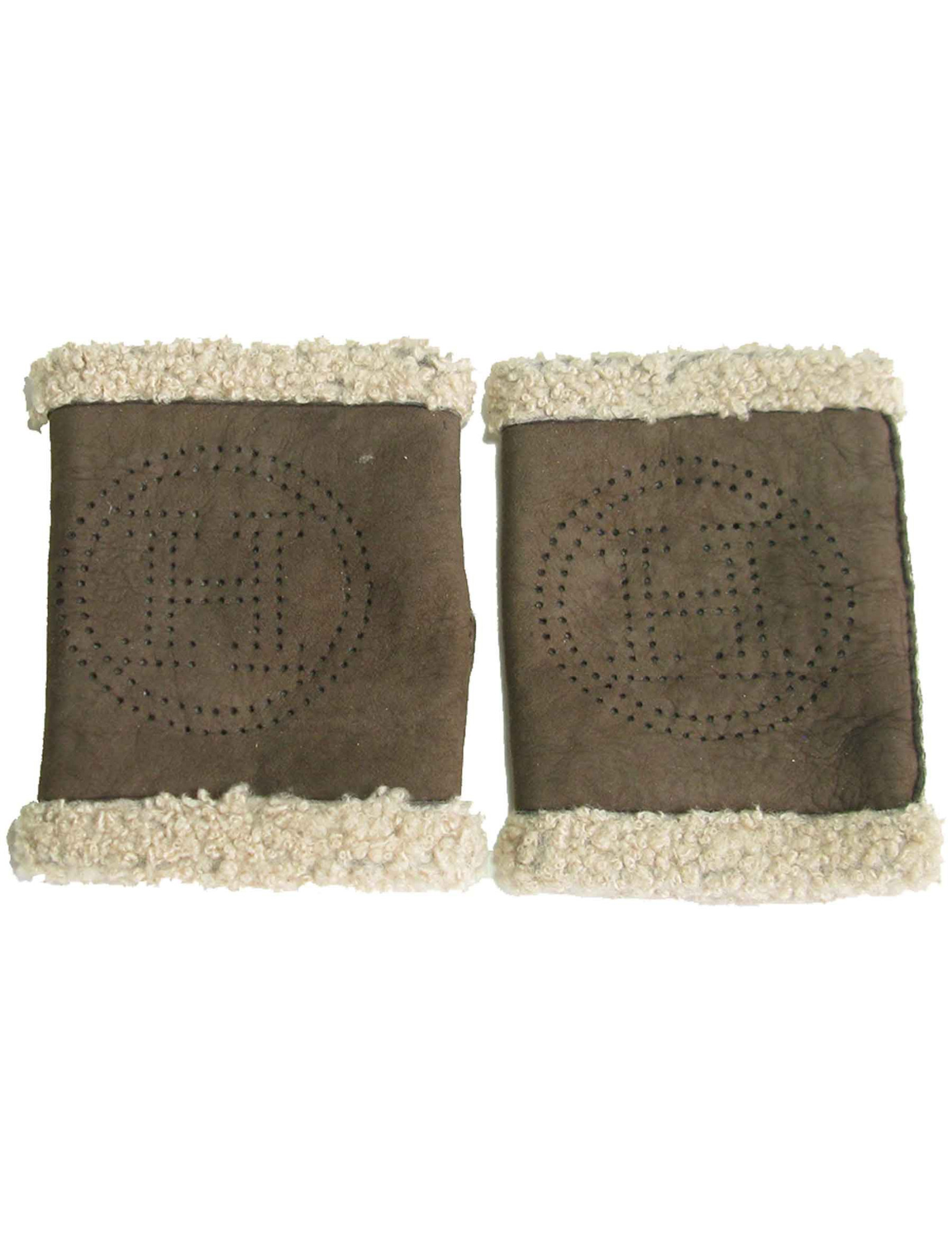 Belle paire de mitaines Hermès en peau retournée marron foncé et marron clair. Taille 7,5. Un H est perforé sur le dos de chaque mitaine. En très bon état.