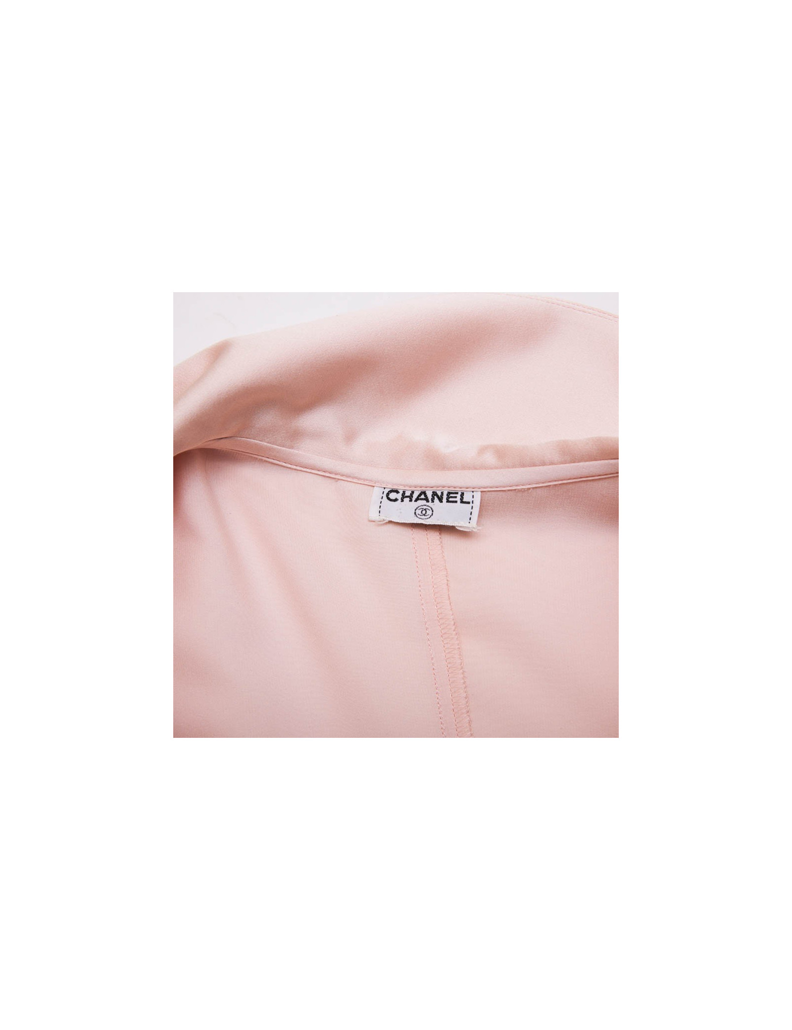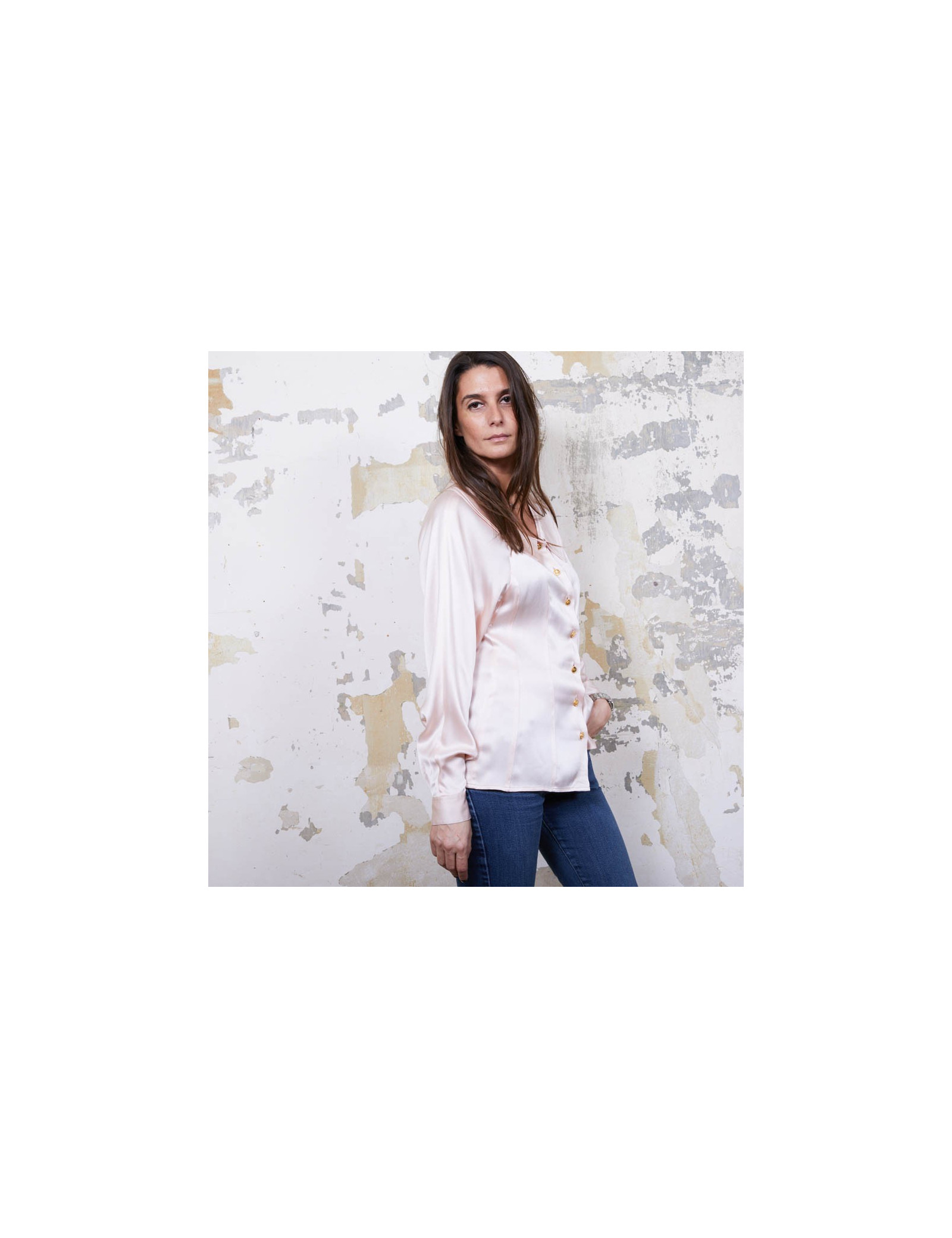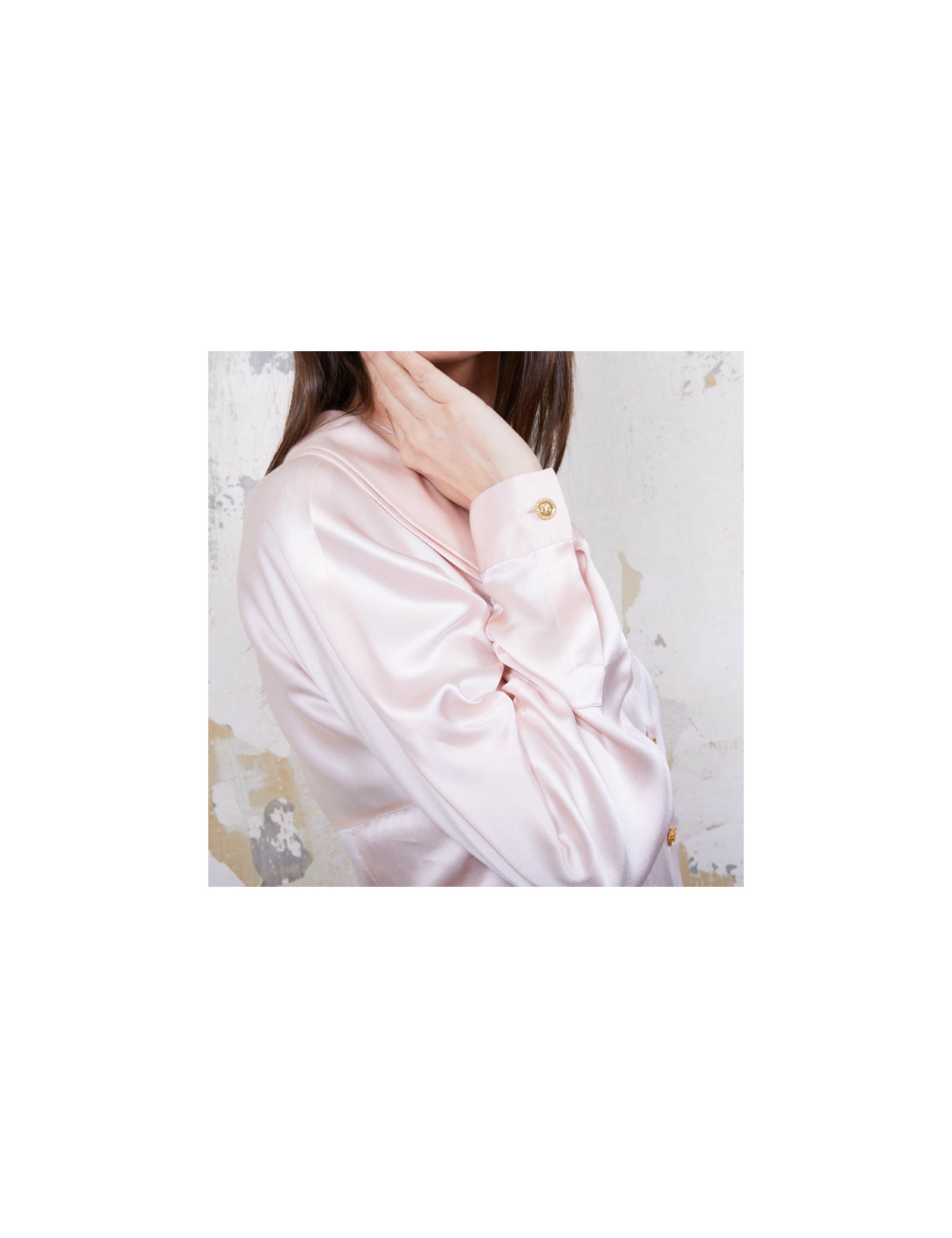 Blouse t 36 (absence d'étiquette de taille et de matière), Chanel en soie 100% rose ornée de boutons dorés.