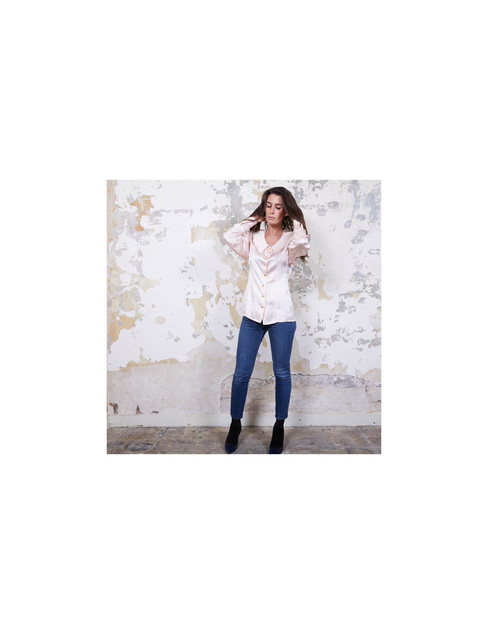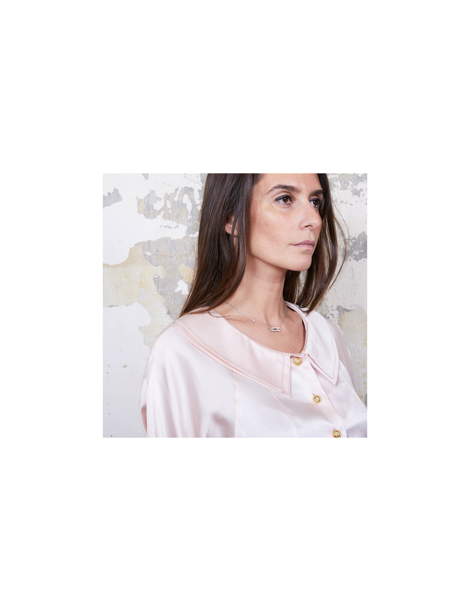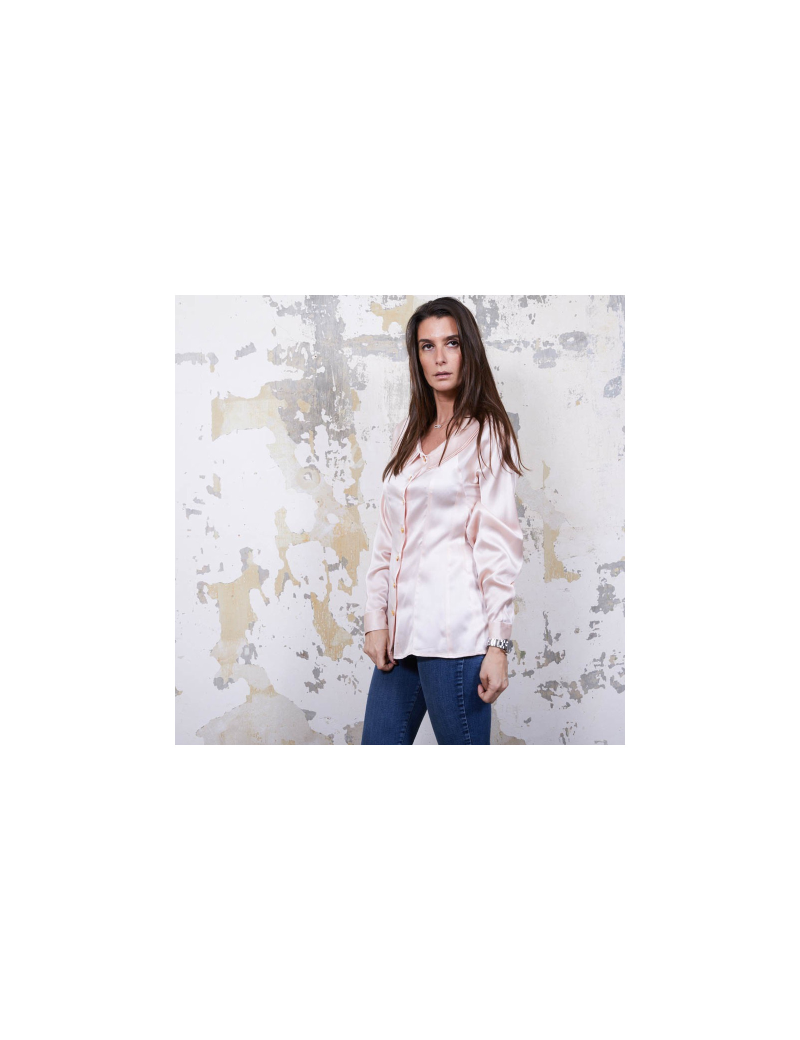 Blouse t 36 (absence d'étiquette de taille et de matière), Chanel en soie 100% rose ornée de boutons dorés.