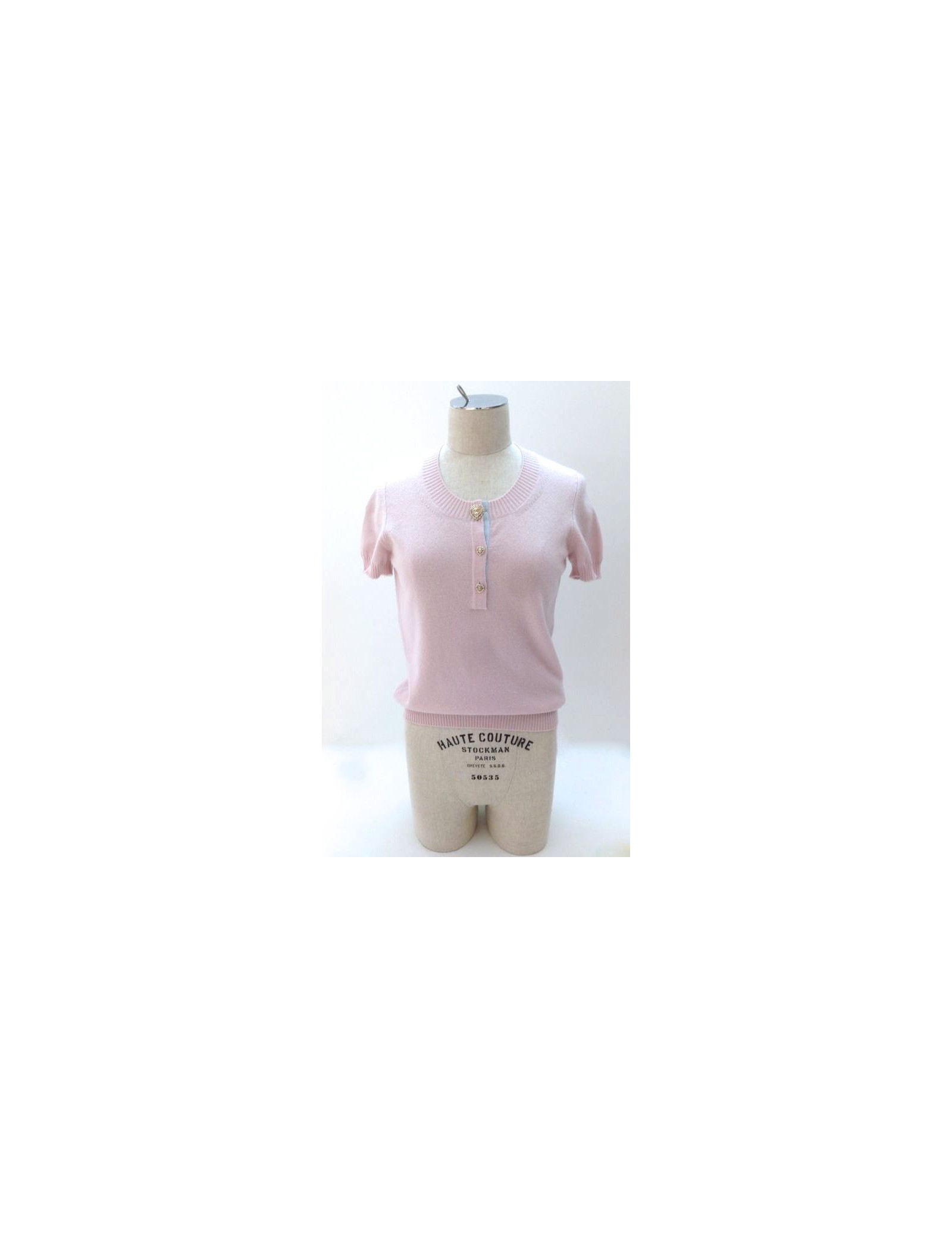 Top CHANEL, taille 36, collection Croisière 2009. Cette pièce féminine, peut se porter de façon très casual. A l'avant, le col est orné de trois superbes boutons or, en forme de coeur, siglés CC, et entourés de strass argent et rose pâle. Le dos est brodé d'un dessin en forme de miroir baroque, de couleur bleu ciel, jaune pastel. Y sont inscrits "MIAMI", "CHANEL CRUISE", "2008-2009".