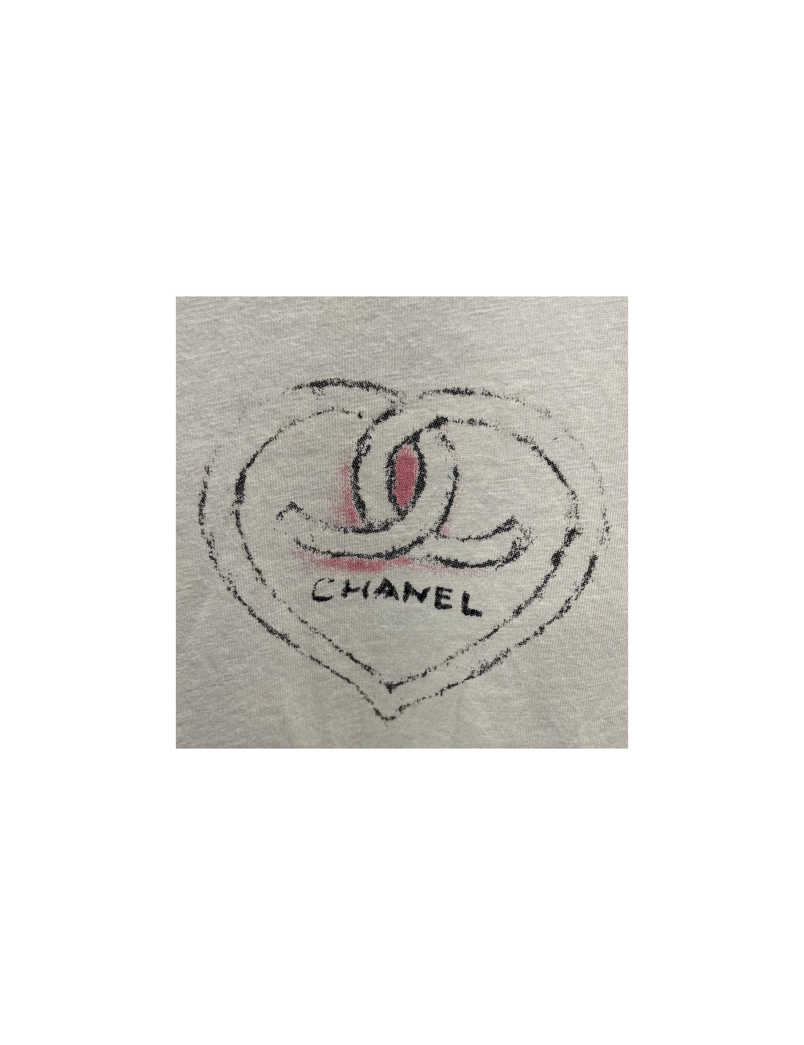 CC au centre du coeur à l'avant et écusson Chanel dans le dos, le tee-shirt est blanc orné d'un dessin couleur pastel pâle bleu et rose.
