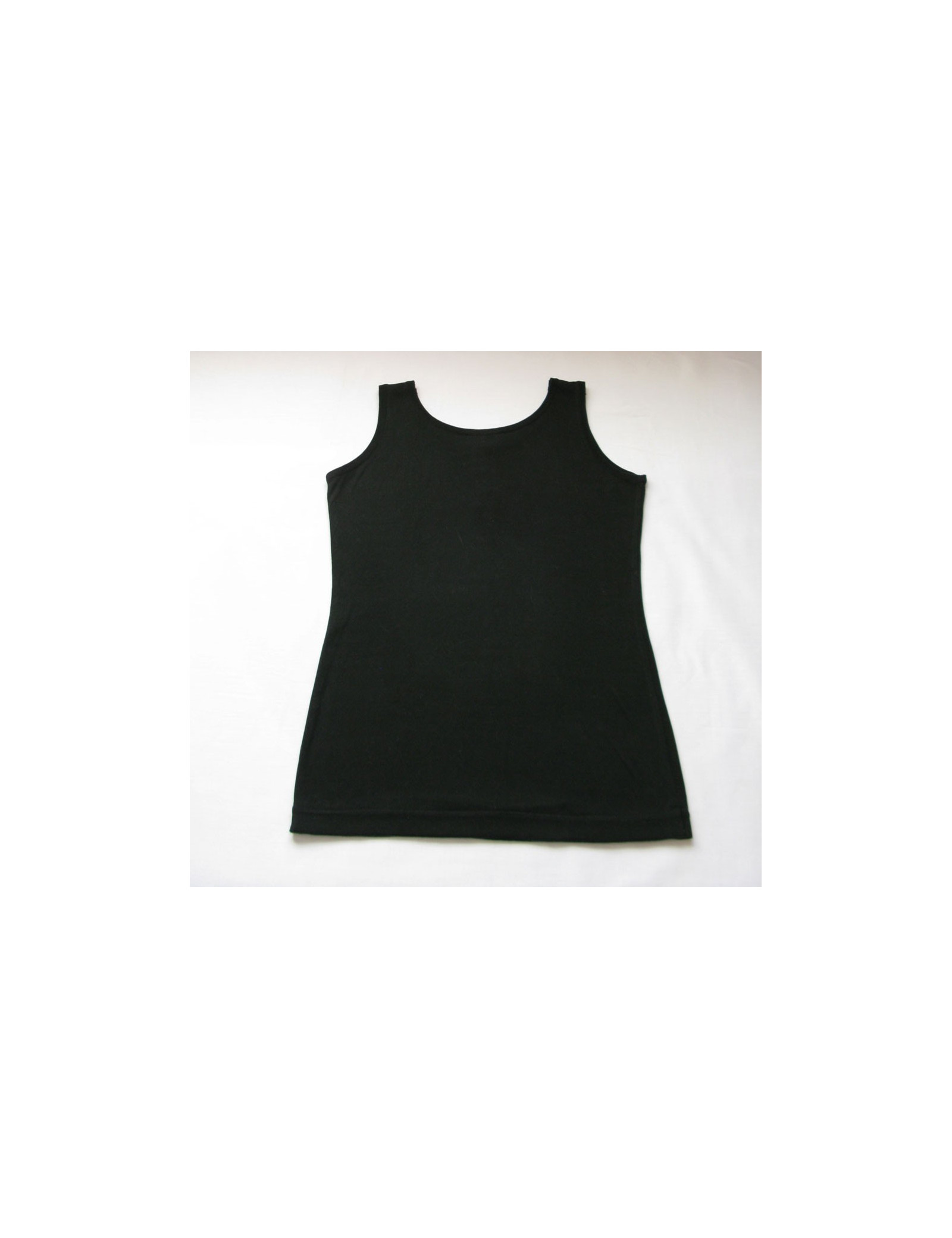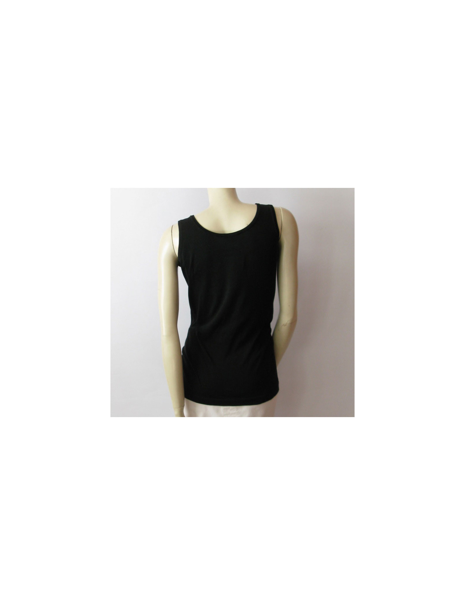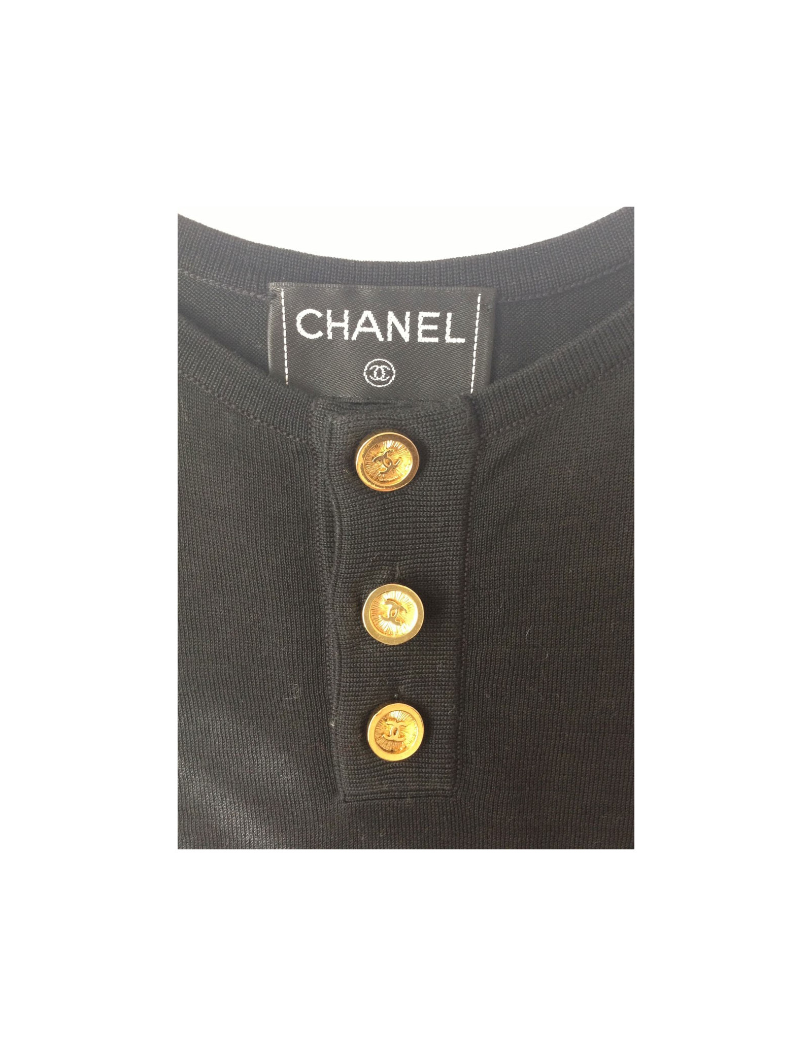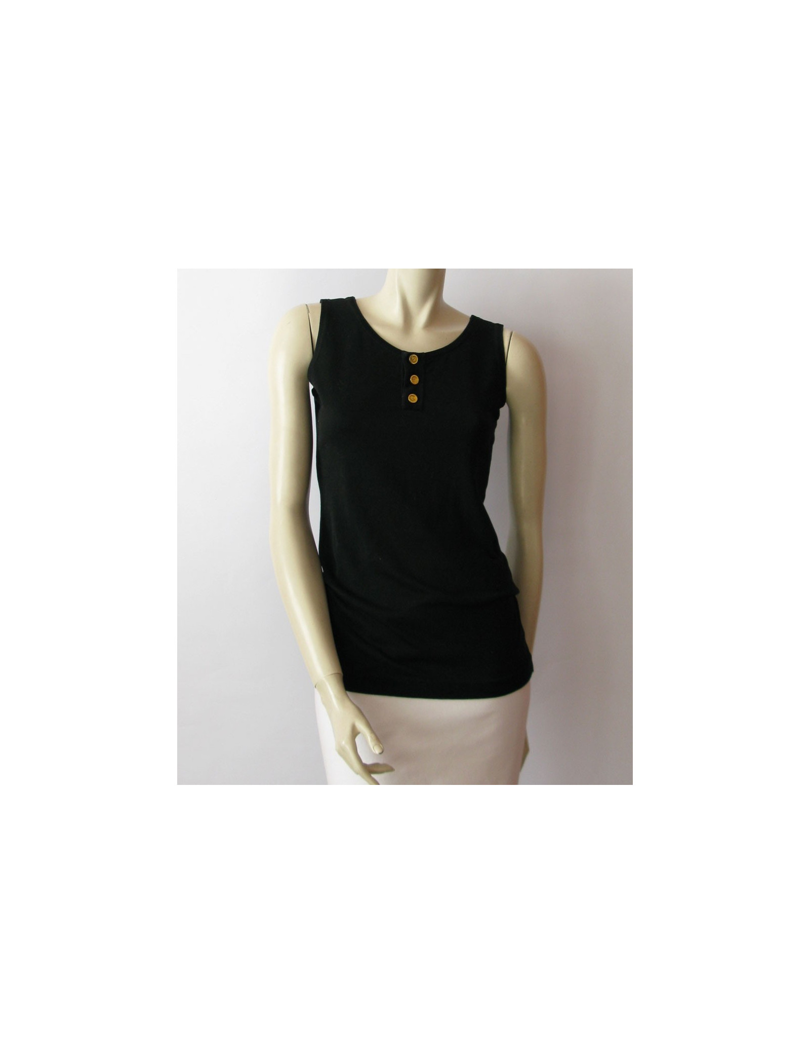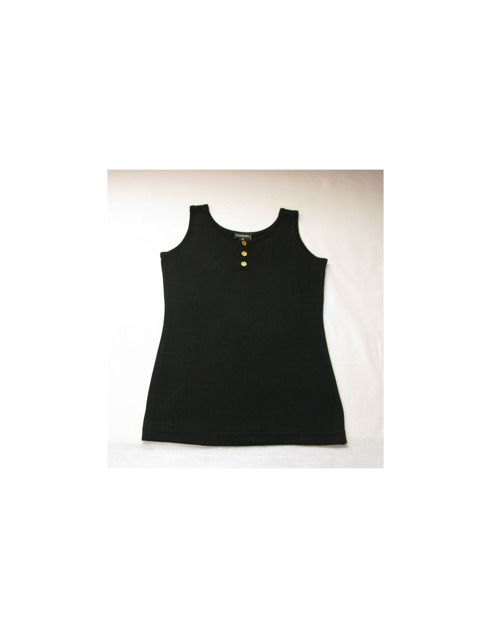 Un basic à avoir dans sa garde robe! T-Shirt débardeur CHANEL uni noir, sans manches, col rond, coupe près du corps. Fermeture par 3 jolis boutons dorés gravés CC. Taille 38Fr