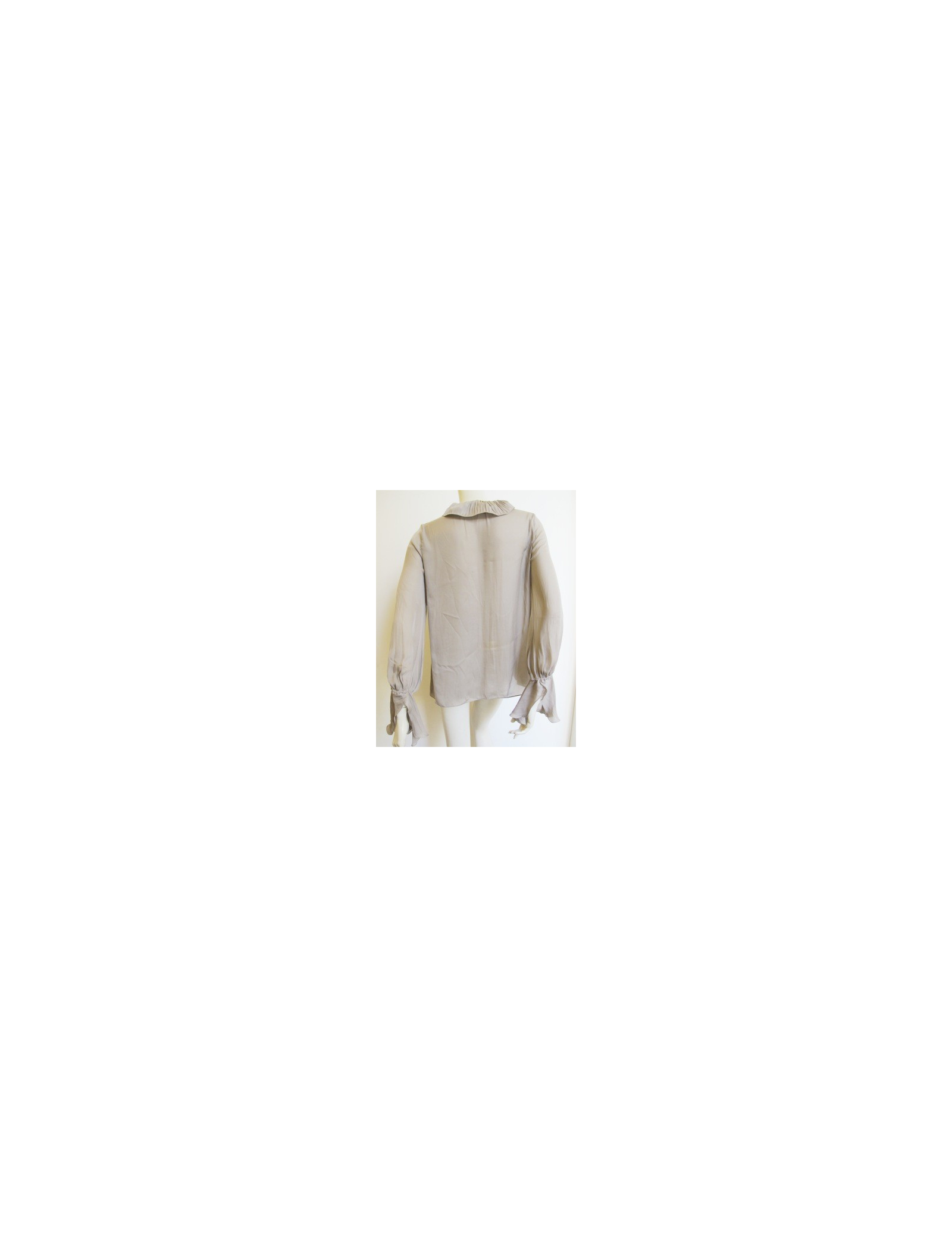 So Romantic! Chemisier Givenchy T38Fr en soie de couleur taupe, décolleté arrondi orné de volant sur un côté, lien de serrage au col, manches longues avec volant aux poignets.