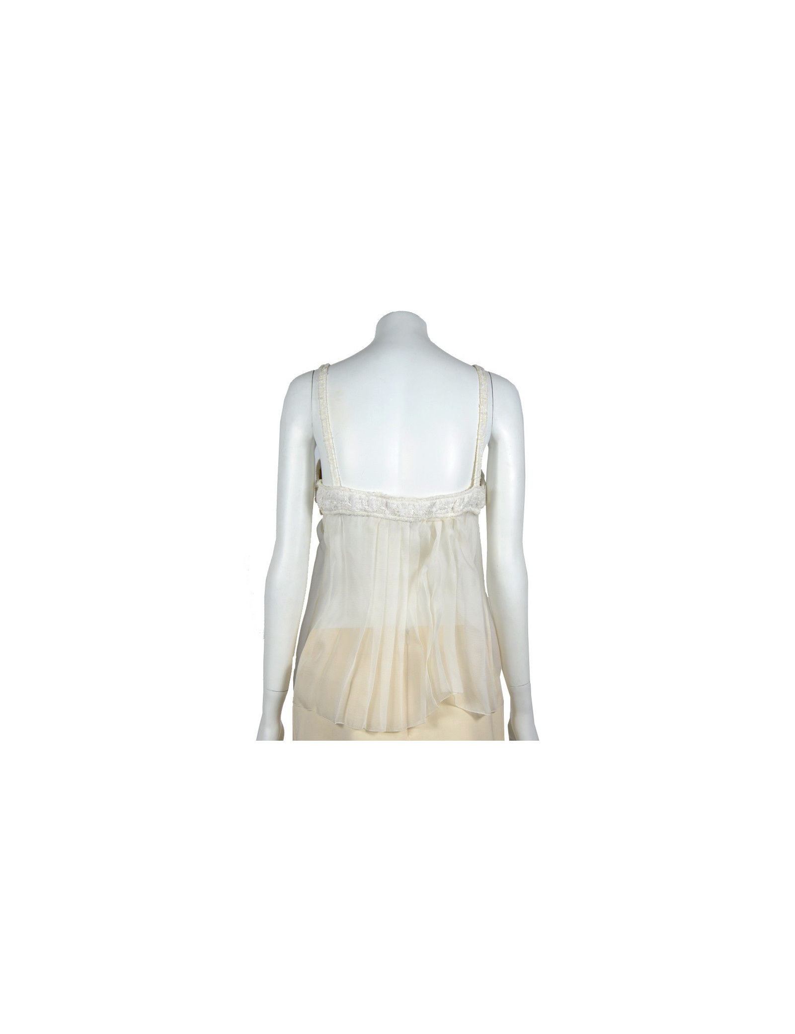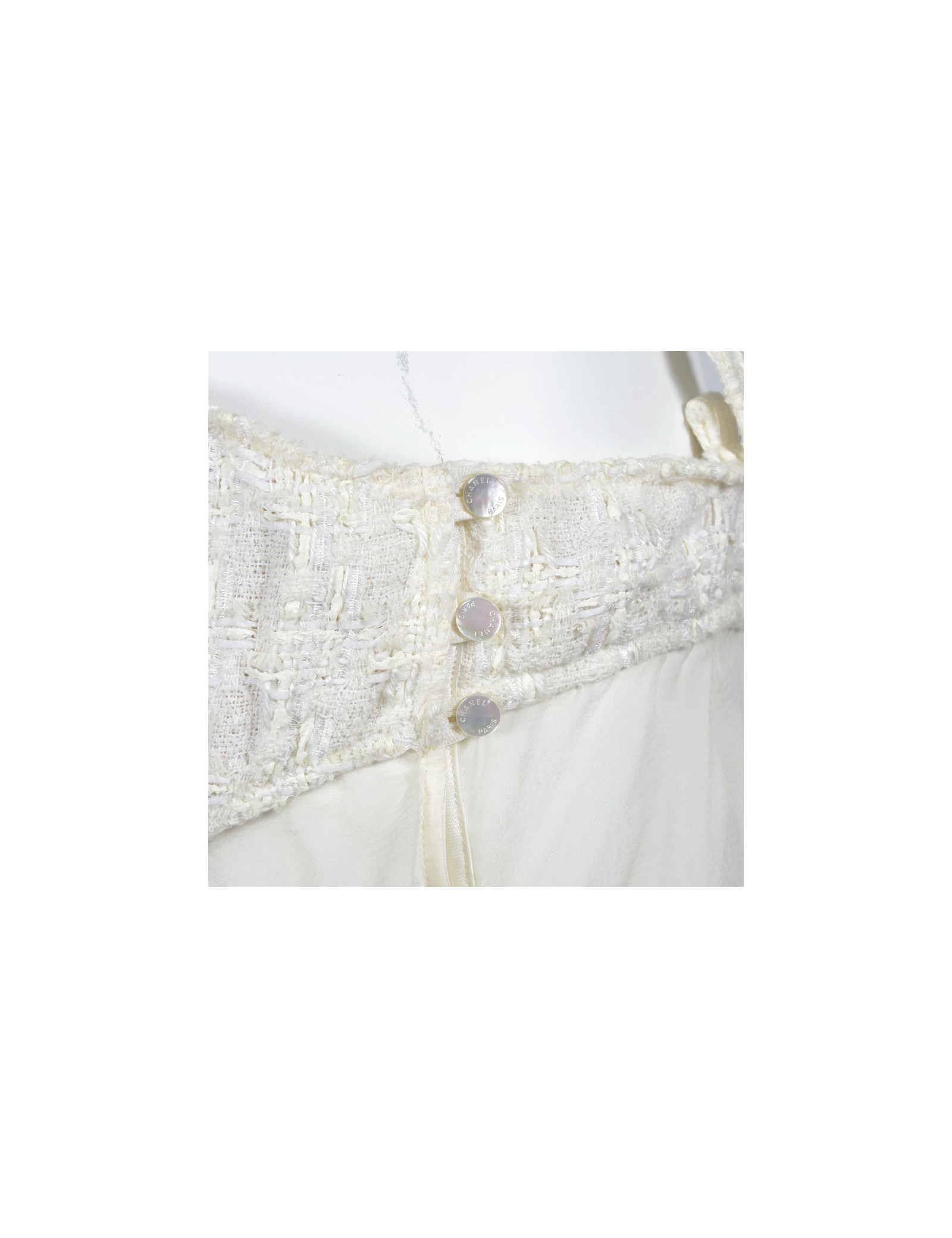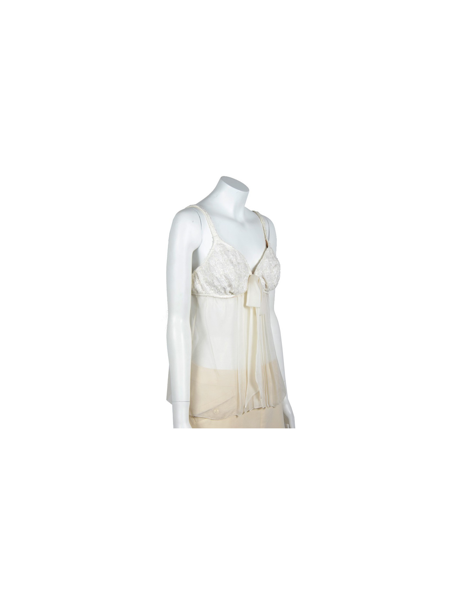 Top à fines bretelles Chanel taille 42, issu de la collection croisière 2005. Il est en soie et coton de couleur ivoire. La partie du haut couvrant la poitrine est en tweed, une armature de soutien gorge y est incorporée pour plus de confort. Le tombé est en mousseline de soie couleur crème ainsi que le joli noeud qui s'y trouve. Fermeture sur le côté par trois boutons nacrés CC. Il est en très bon état