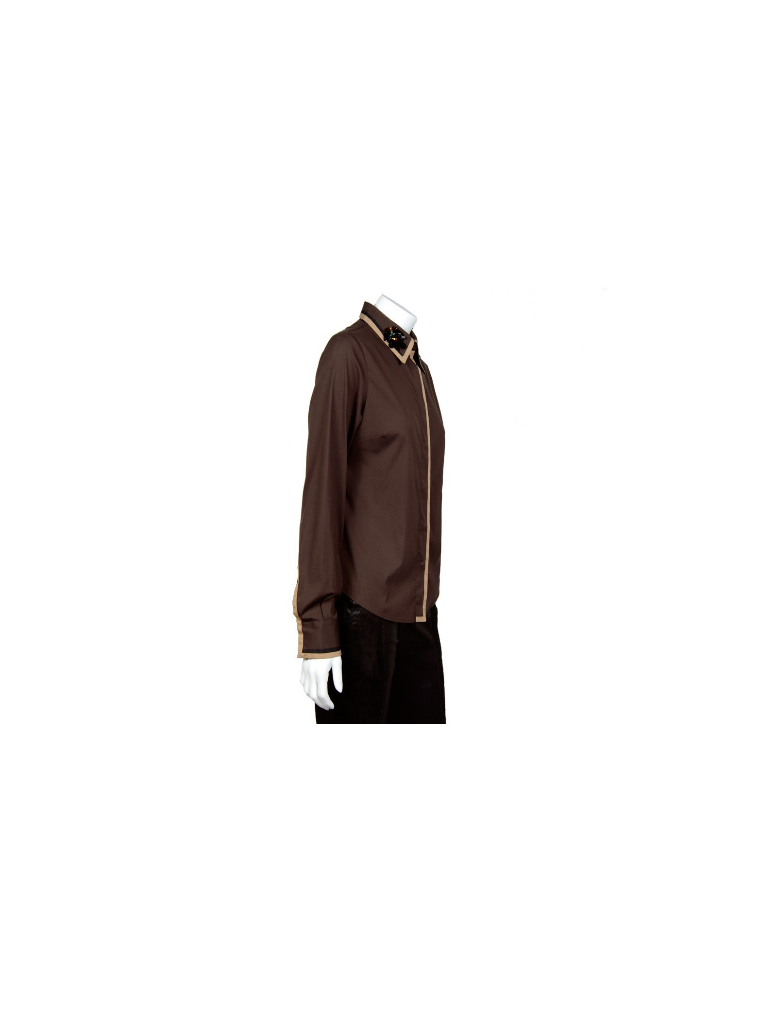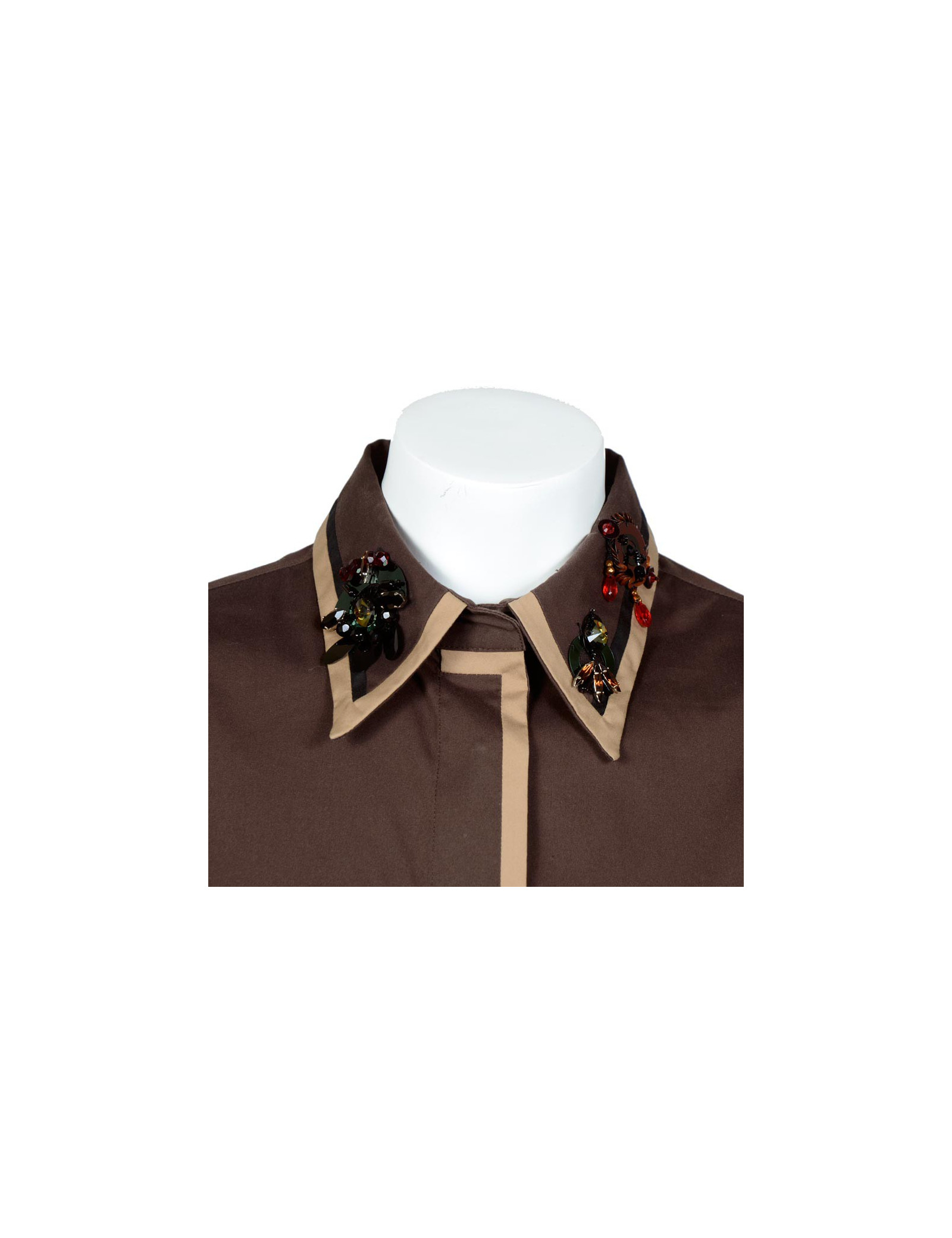 Chemise Prada en coton marron. Taille 42 italien équivaut à un 38 français. Fermeture par boutons pression. Sur le col, des sequins et des strass ont été brodés. Voir photo. En très bon état.