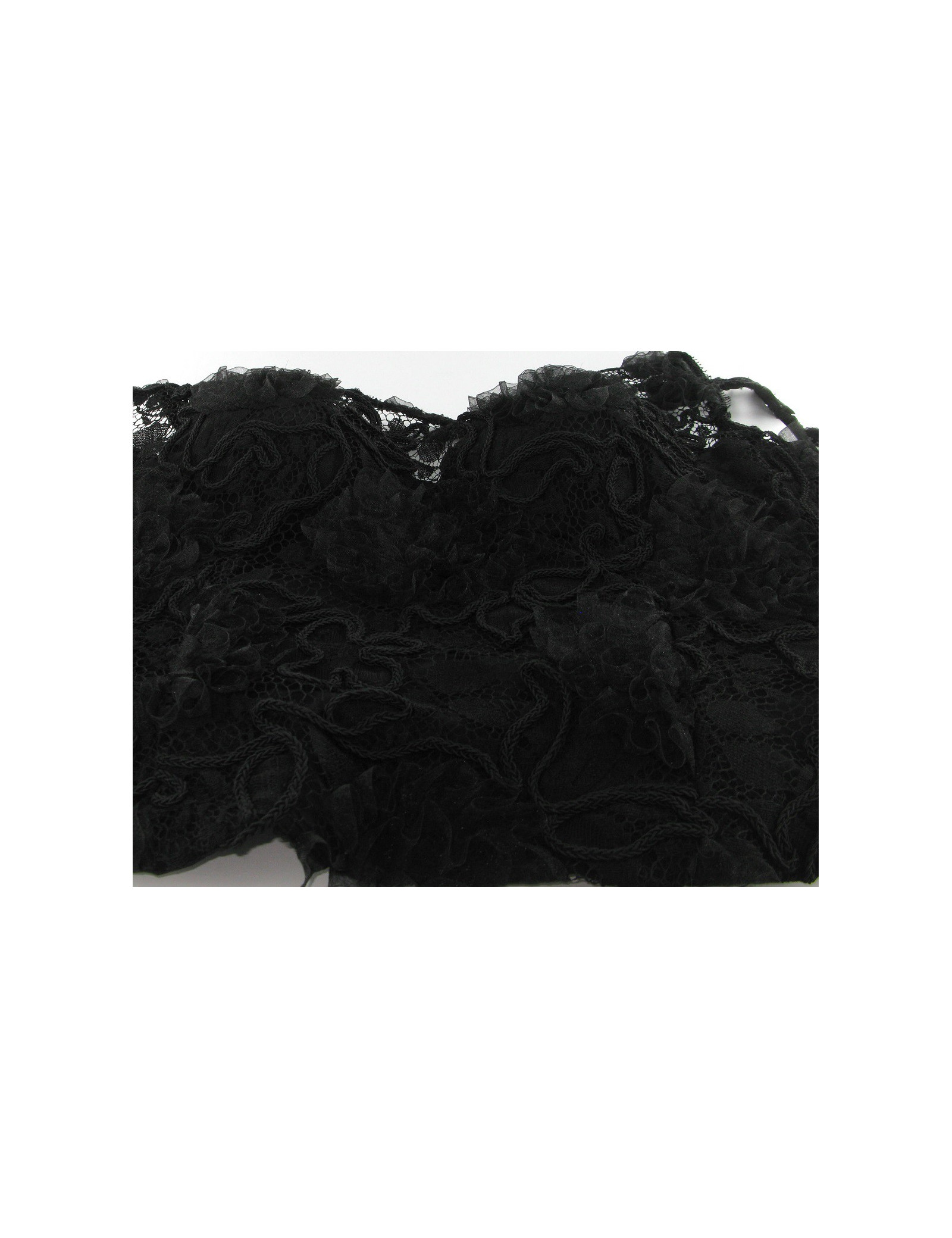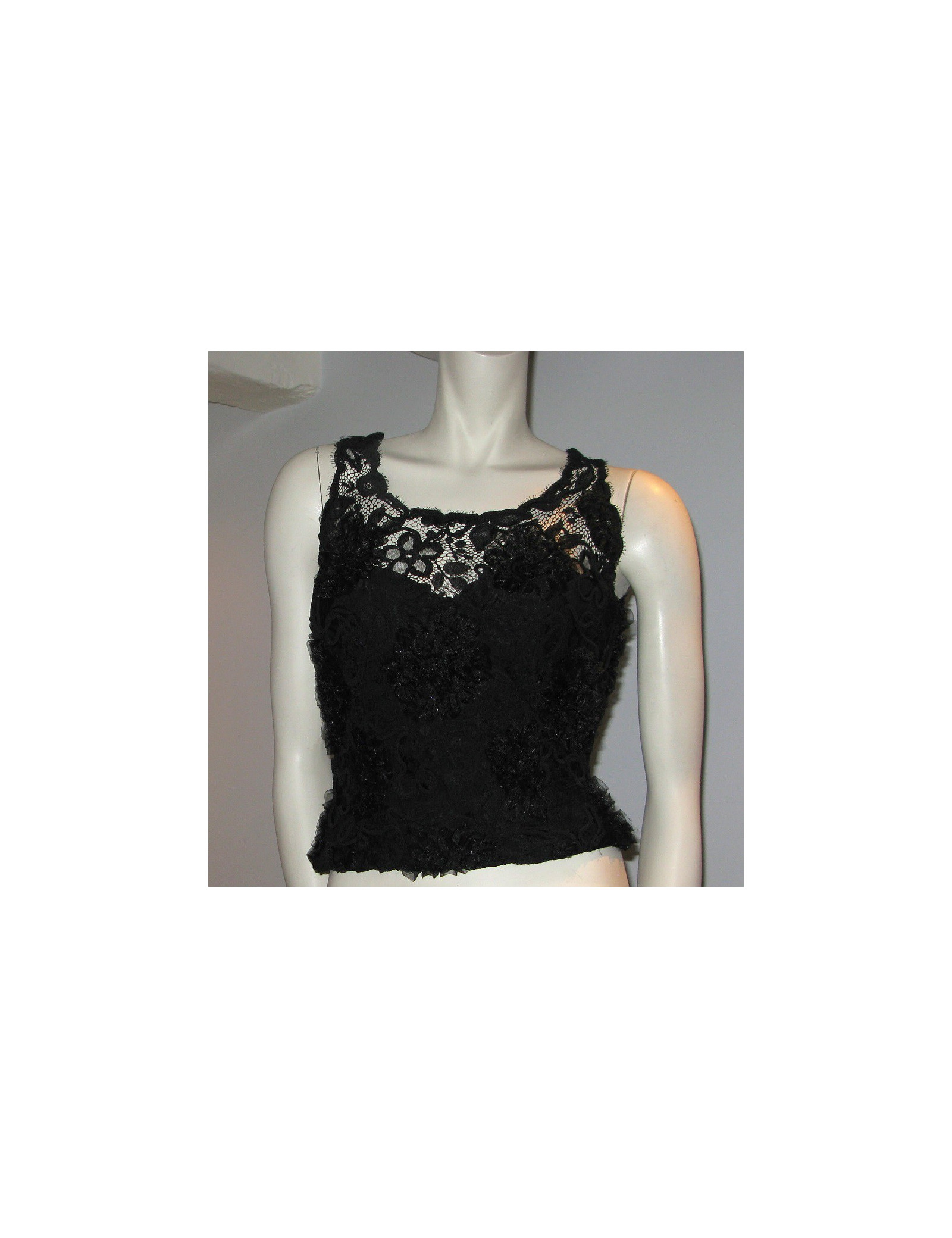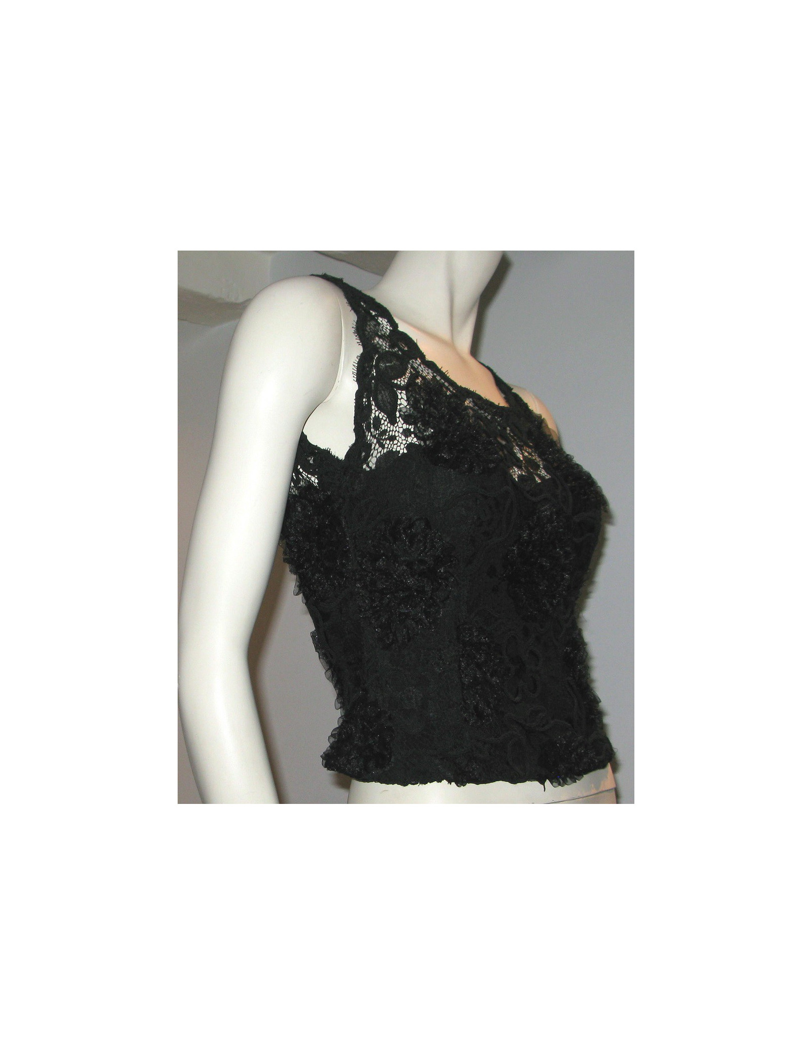 Ravissant chemisier sans manches, en broderie de dentelle noire de Lesage, taille 38 de la Maison Chanel.Collection 2002. il est doublé par un bustier comprenant un soutien gorge doublé de mousse, baleines, coque. Sur la dentelle, il y a en relief des camélia en tulle. à l'arrière une fermeture éclair longue de 25 cm. Les boutons sont siglés double C dorés.