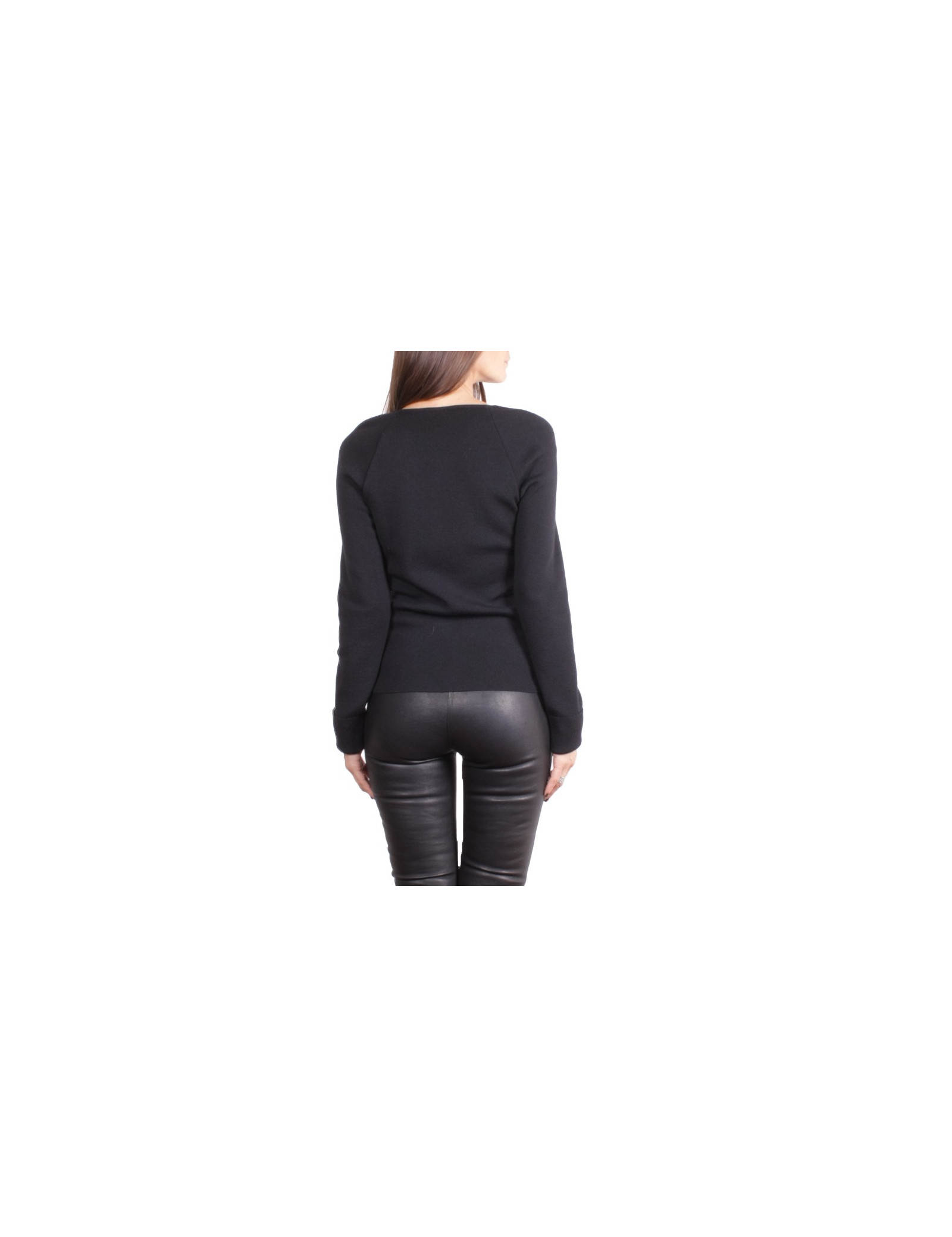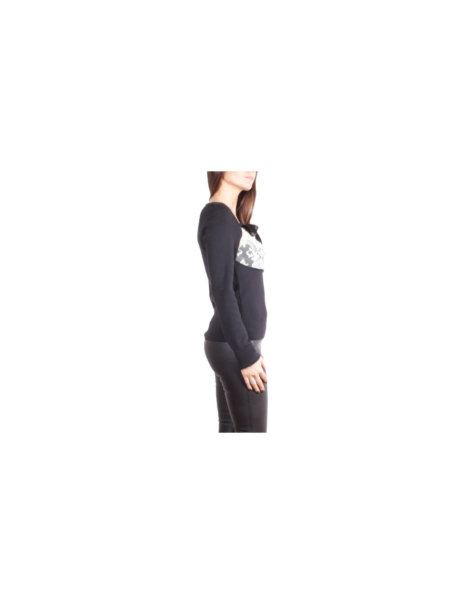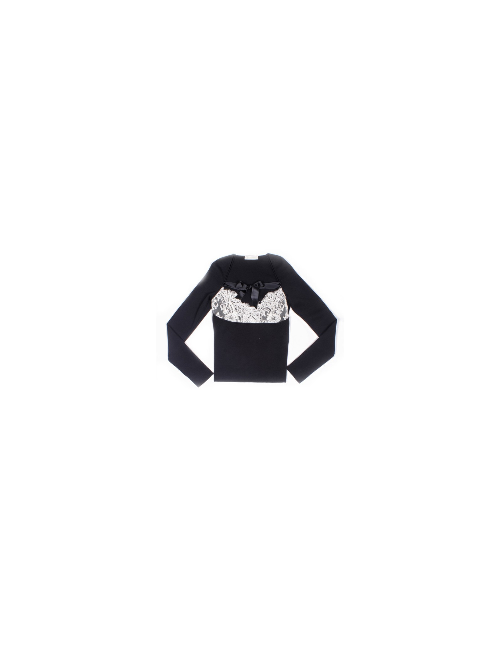 Top VALENTINO en laine noire, une découpe en dentelle blanche au niveau de la poitrine ainsi qu'un double ruban noir en satin. Taille L.