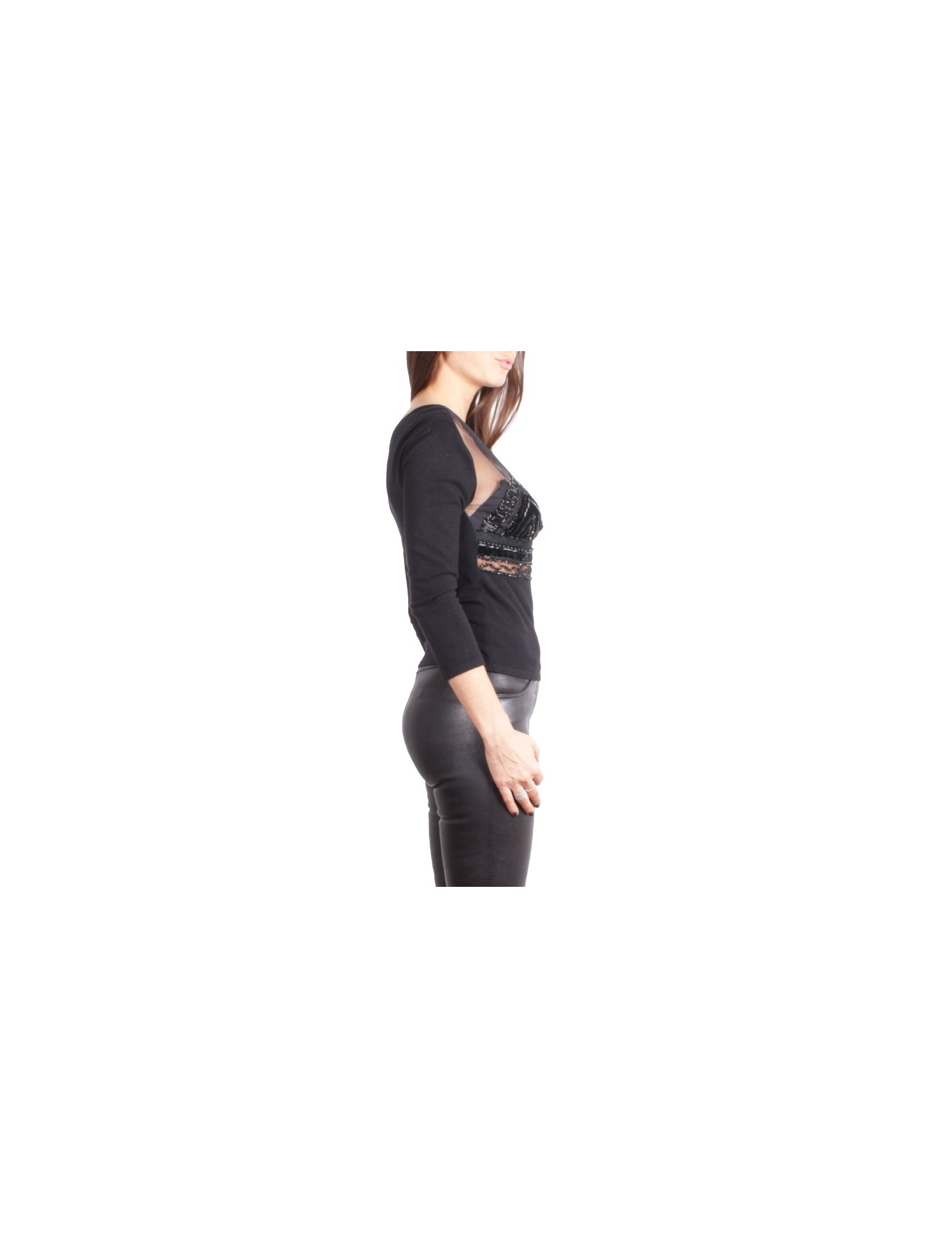 Top VALENTINO T 38 FR, en laine et cachemire, brodé de paillettes et de perles fines noires sur la poitrine en tulle noir.