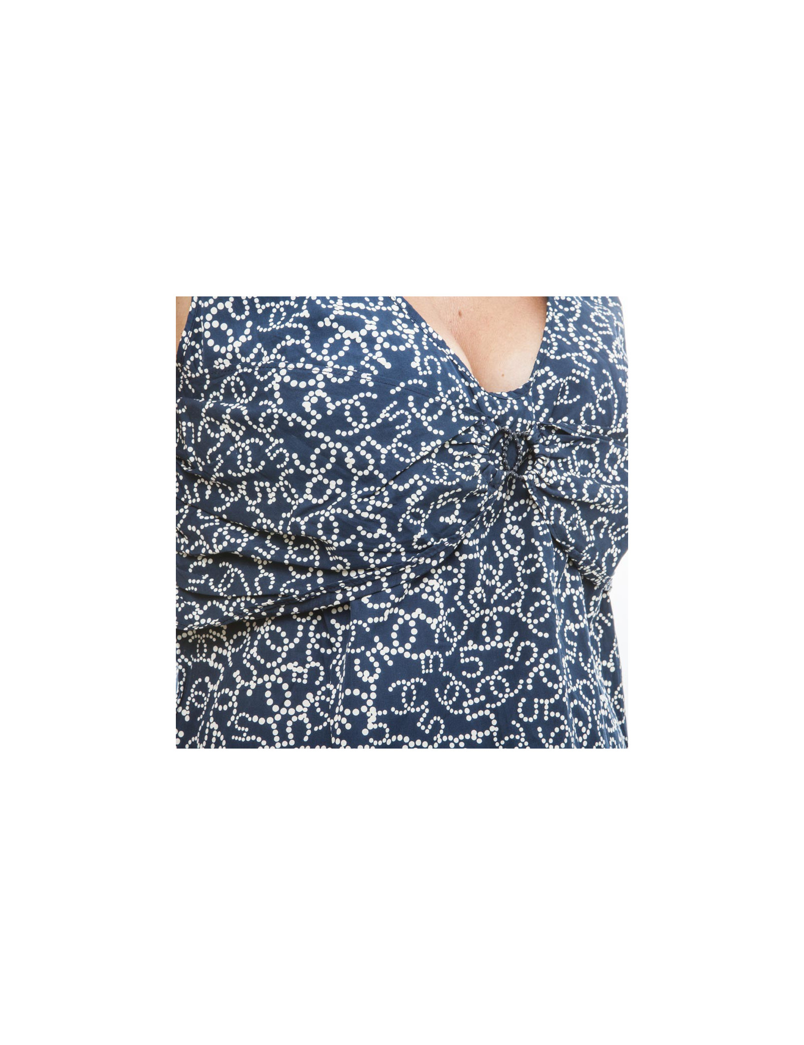 Elle est décolletée en V avec deux bandes formant un noeud retenu par un double "CC" perlé bleu marine.