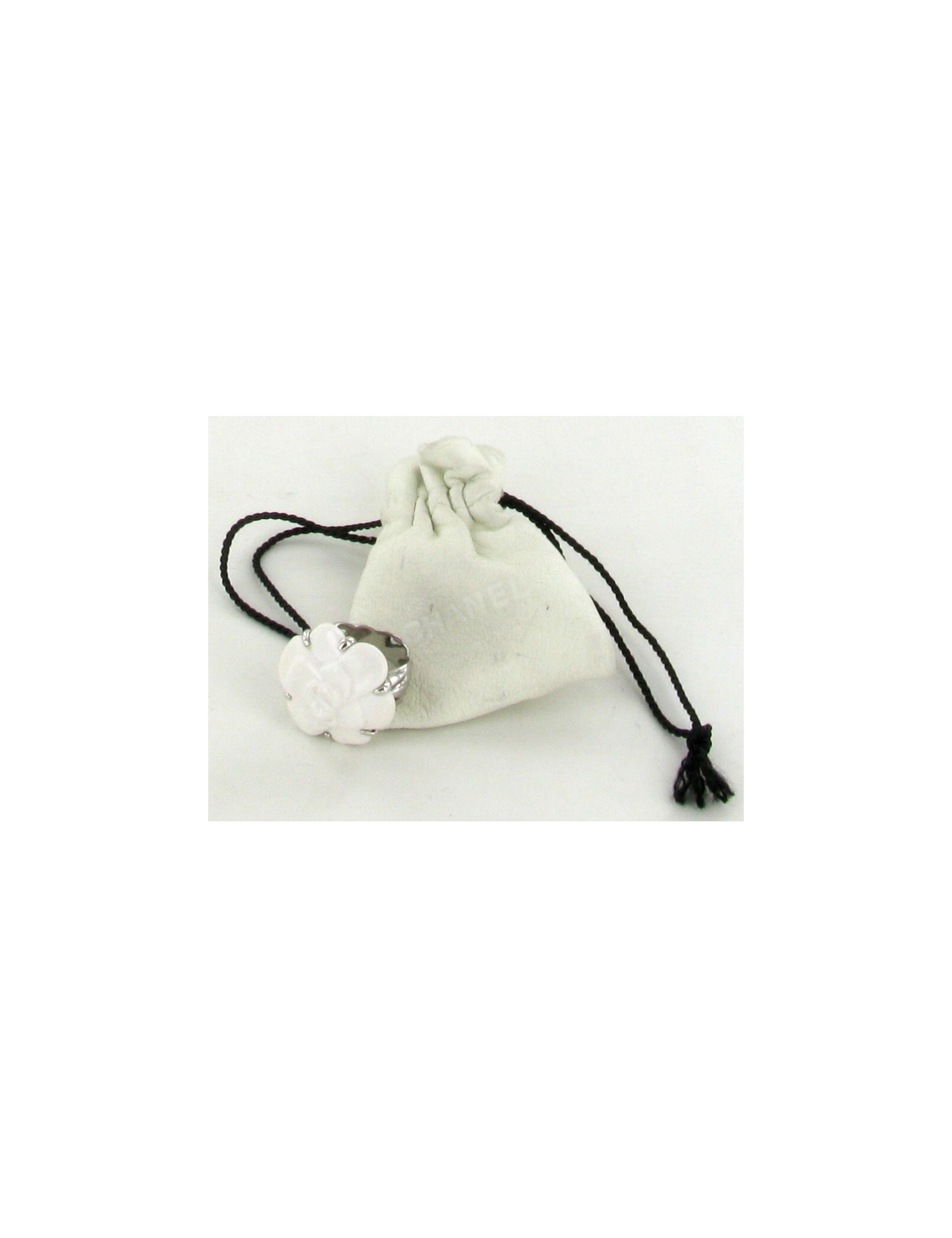 Bague CHANEL Camélia blanche T 58, grand modèle. Pièce inconique de la Maison de Couture. Cette pièce de joaillerie est en agate blanche (calcedoine) et or blanc 18 carats. Montée en or blanc, cette bague est sertie d'un cacholong sculpté. Déjà portée, l'agate est légèrement jaunie. Une petite trace grisatre sur l'un des pétales centraux. La monture en or blanc est très joliment tressée. Poinçon or 18K 750. Vendue dans sa pochette en cuir blanc siglé CHANEL.