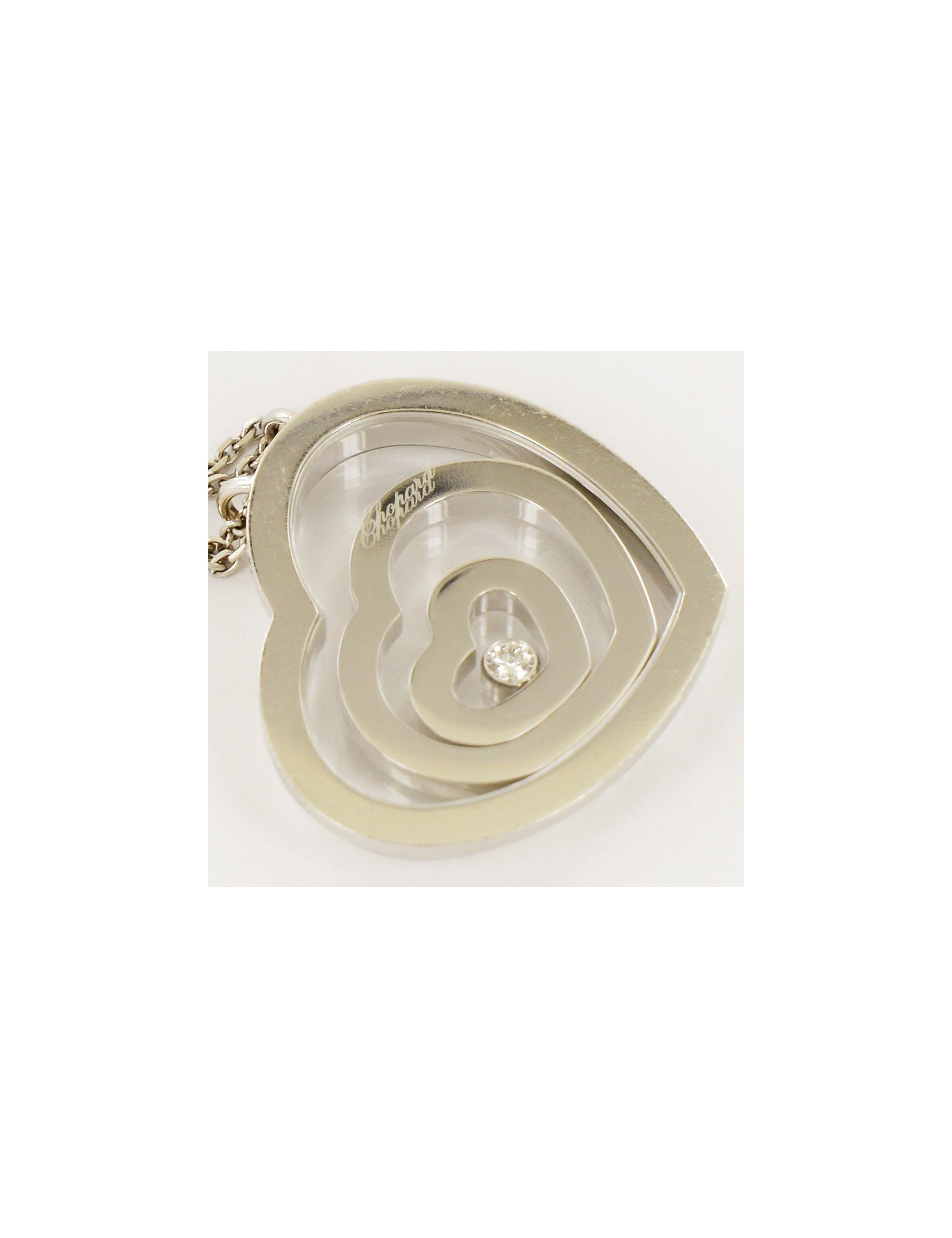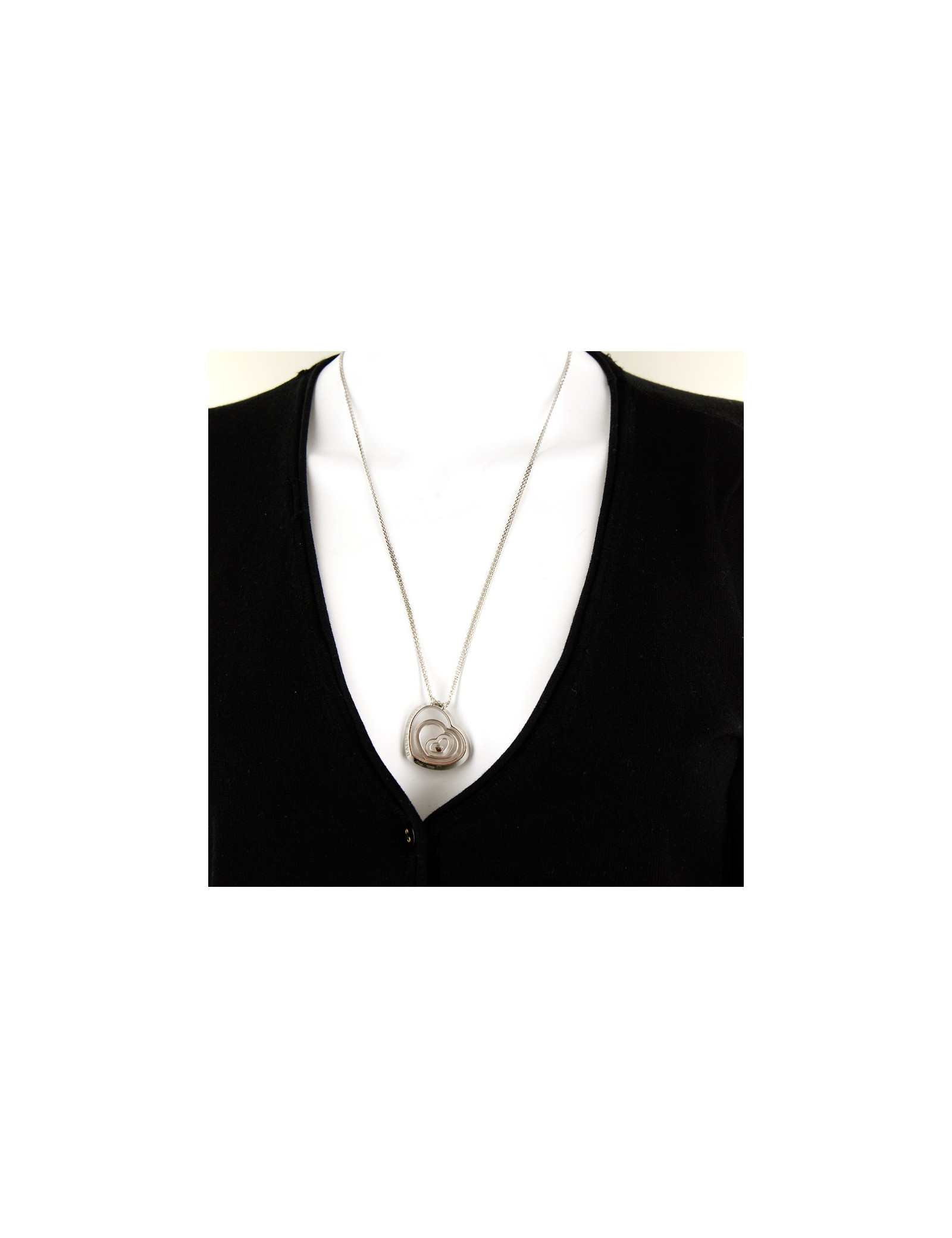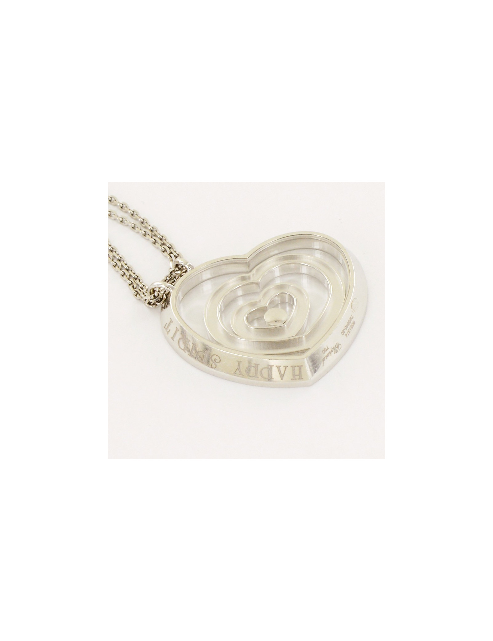 Superbe collier coeur "Happy Spirit" Chopard, en or blanc 18 carats et un diamant et un coeur flottants, d'un poids de 34.2 grammes. prix public : environ 4700 euros