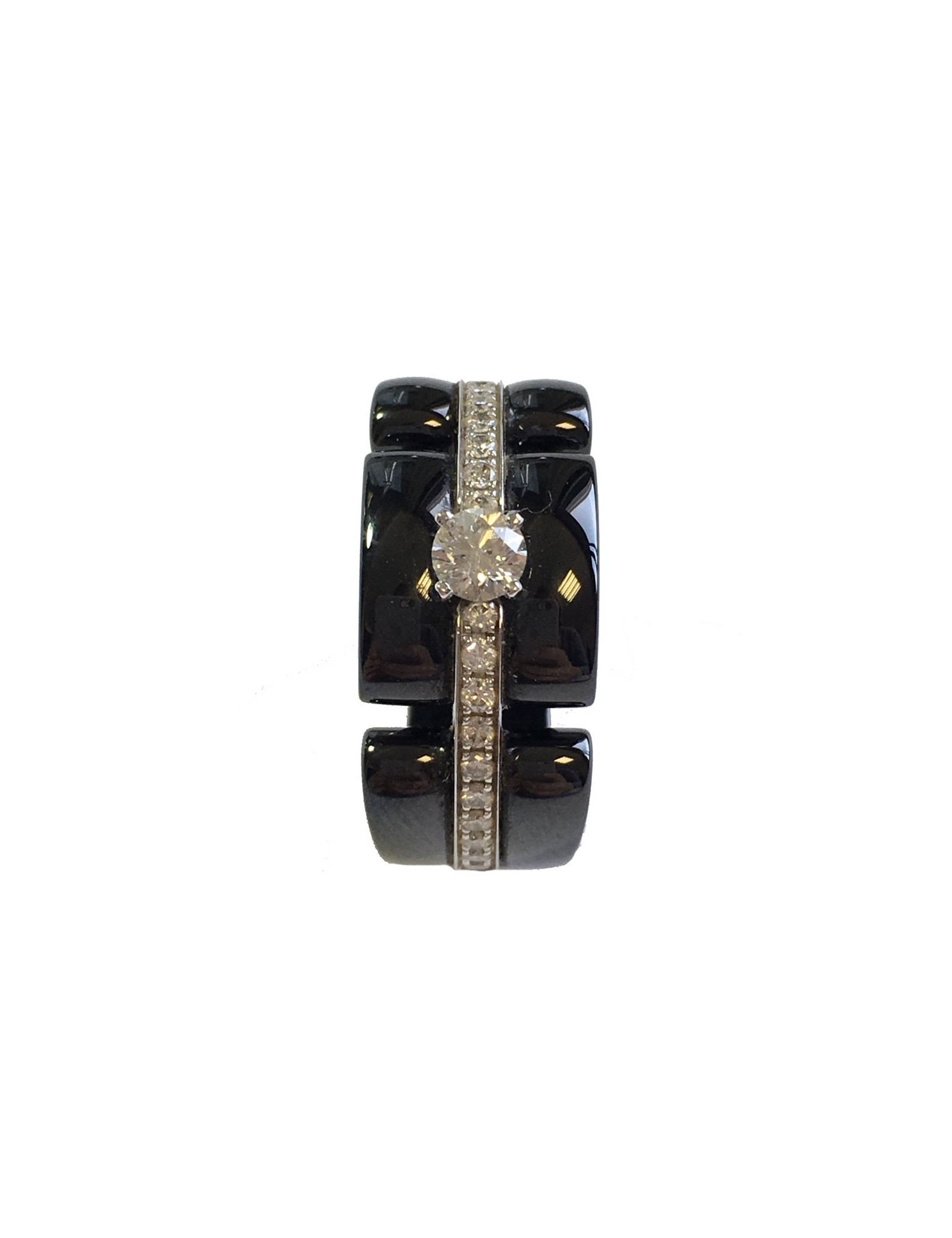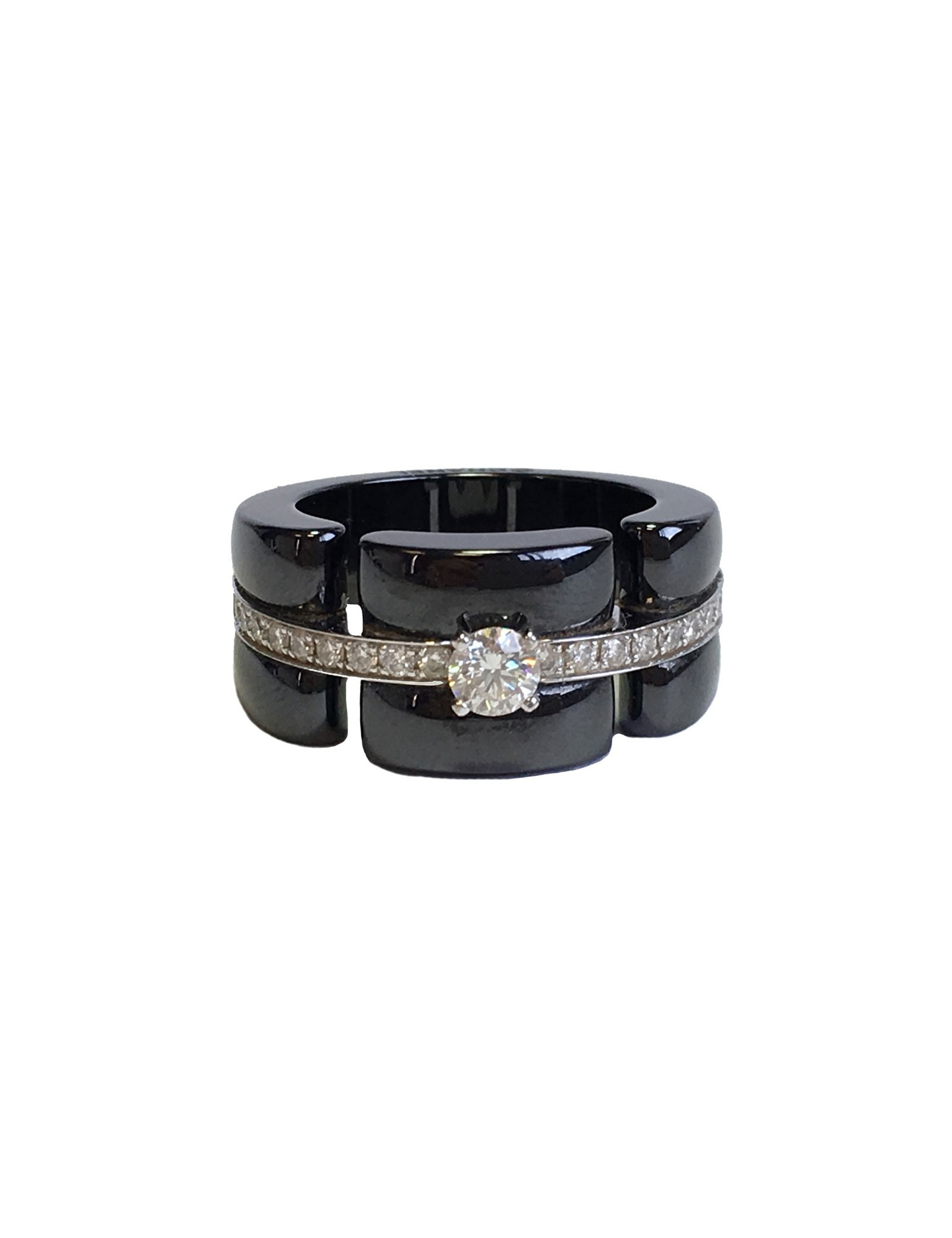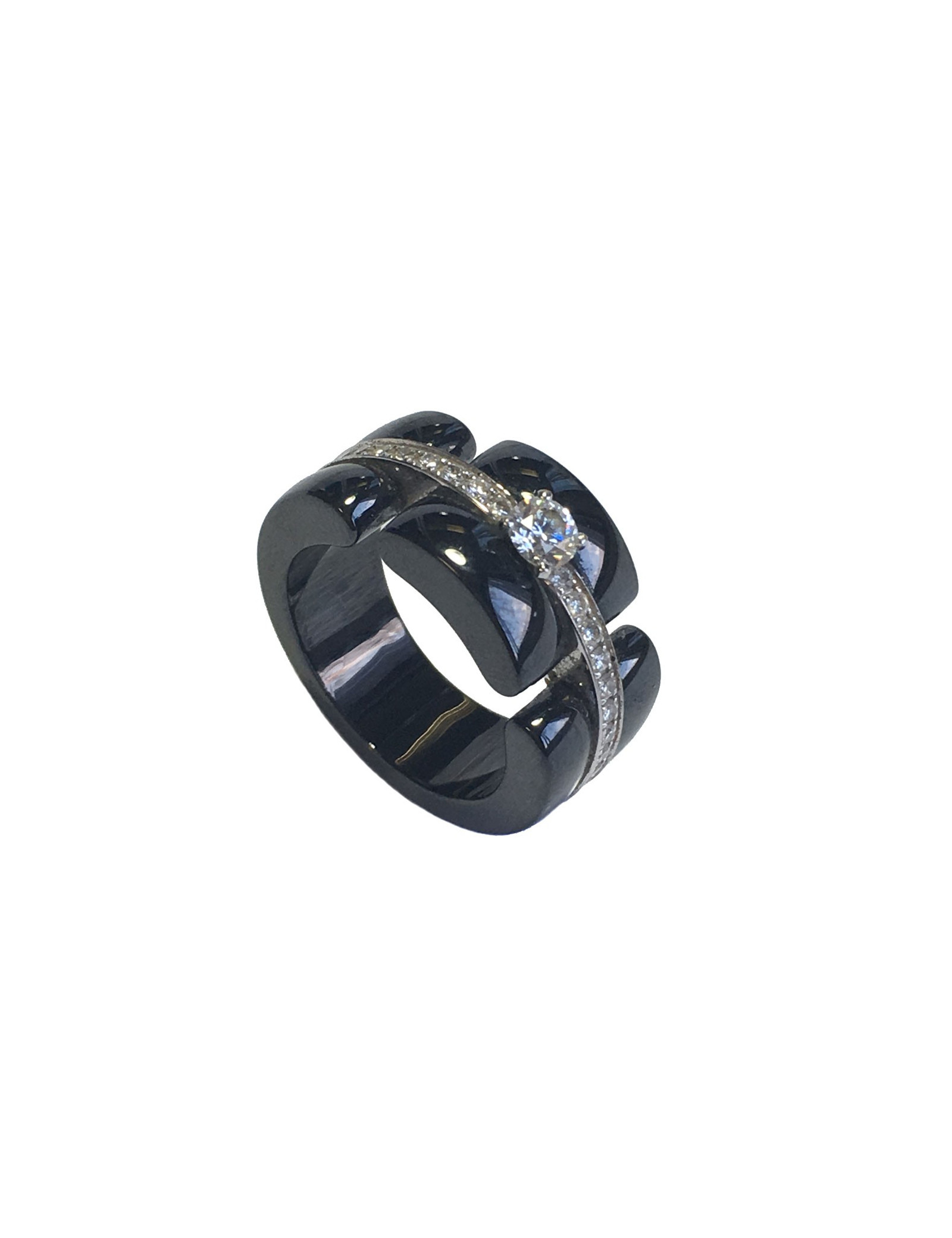 Très belle bague Chanel, modèle "Ultra" en or blanc 18 carats, céramique noire et diamants dont un plus gros au centre. Moyen modèle. Taille 51