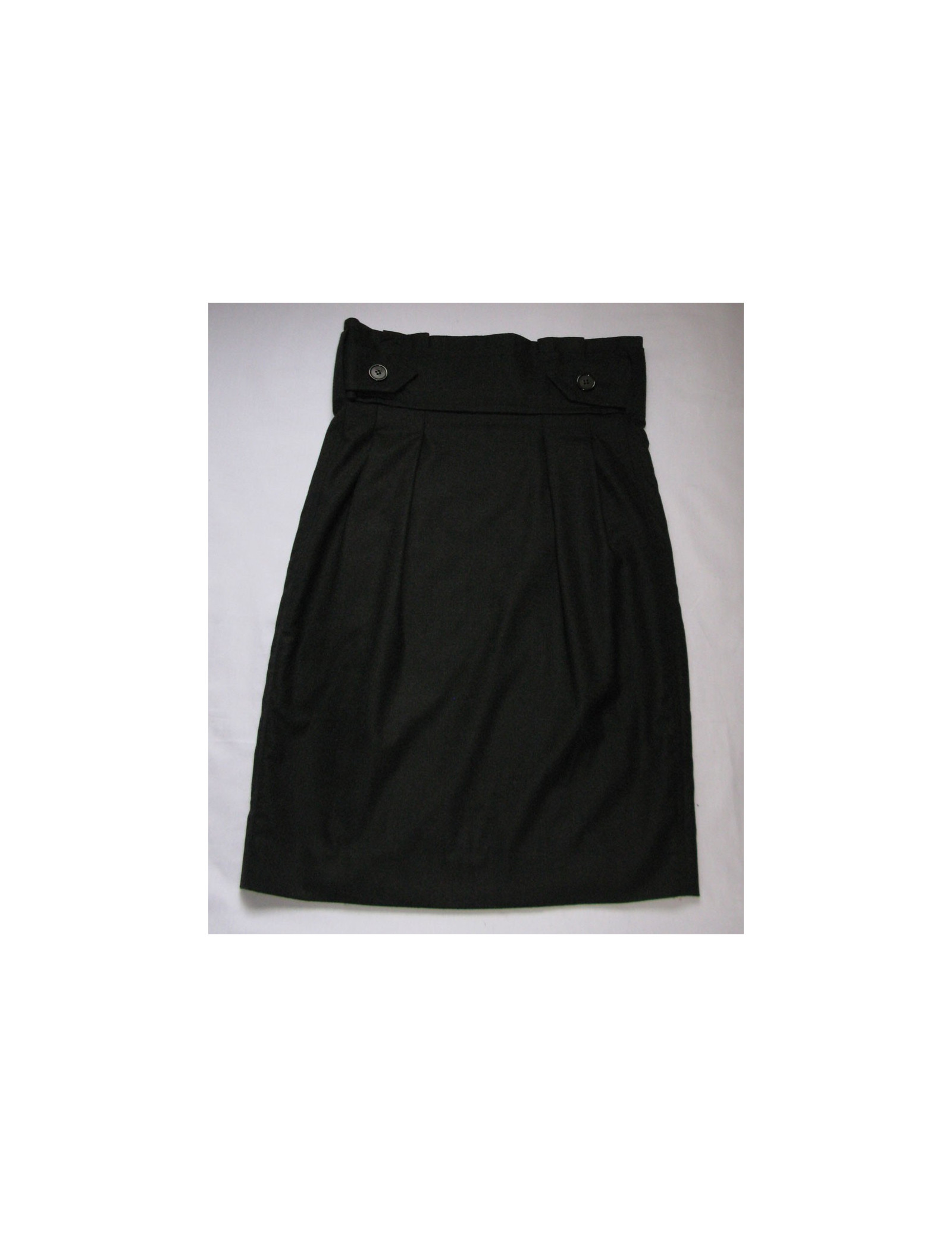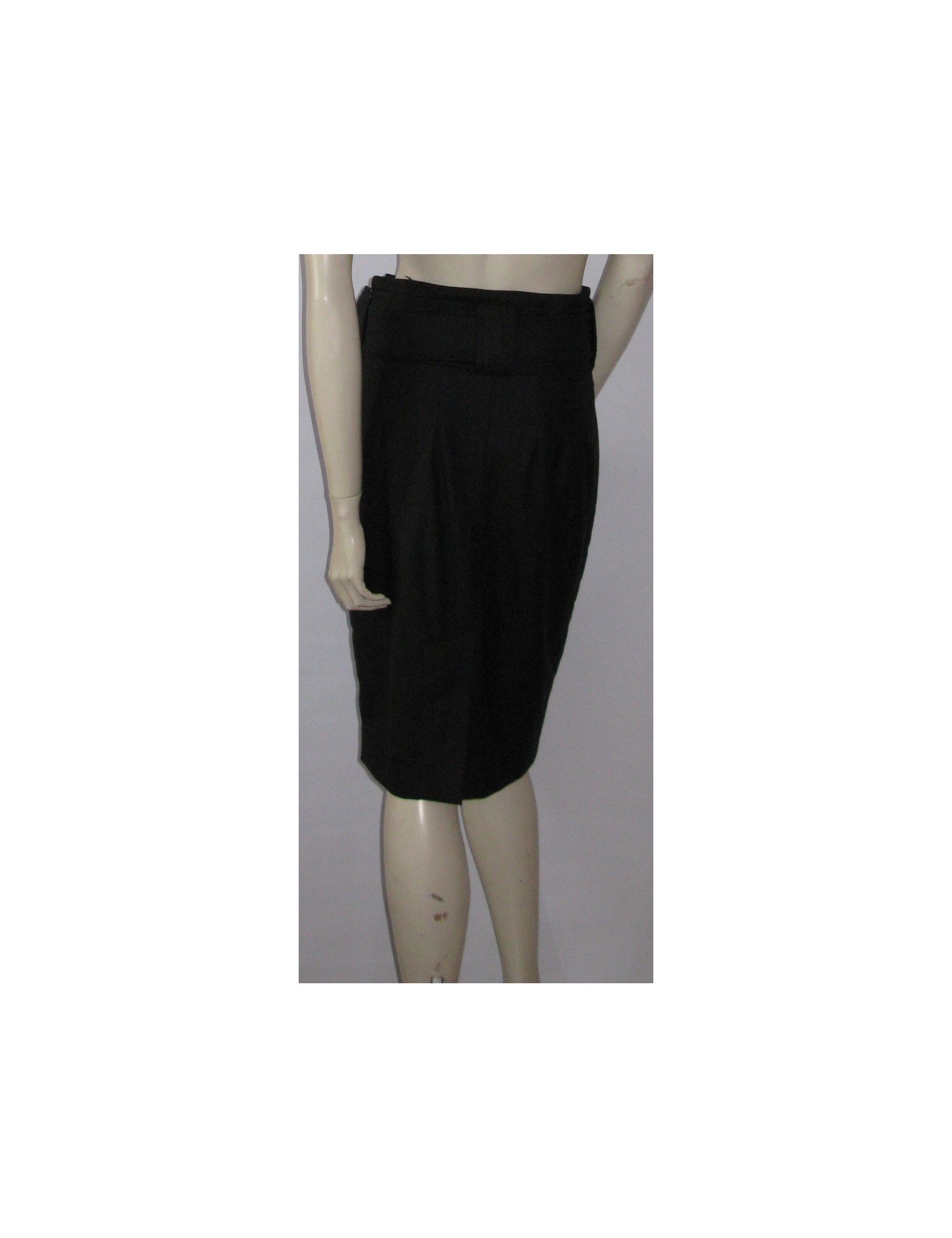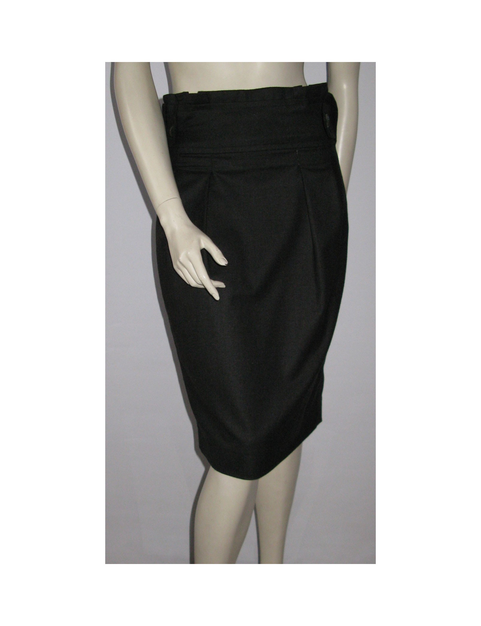 Gris anthracite, coupe crayon, taille haute, 3 larges passants contournent la taille, ceinture intégrée décorée de faux boutonnage à l'avant posé. Pince de cintrage sur le devant et dans le dos. Fermeture invisible fixée au niveau de la hanche gauche. Fente au milieu en bas de la jupe.