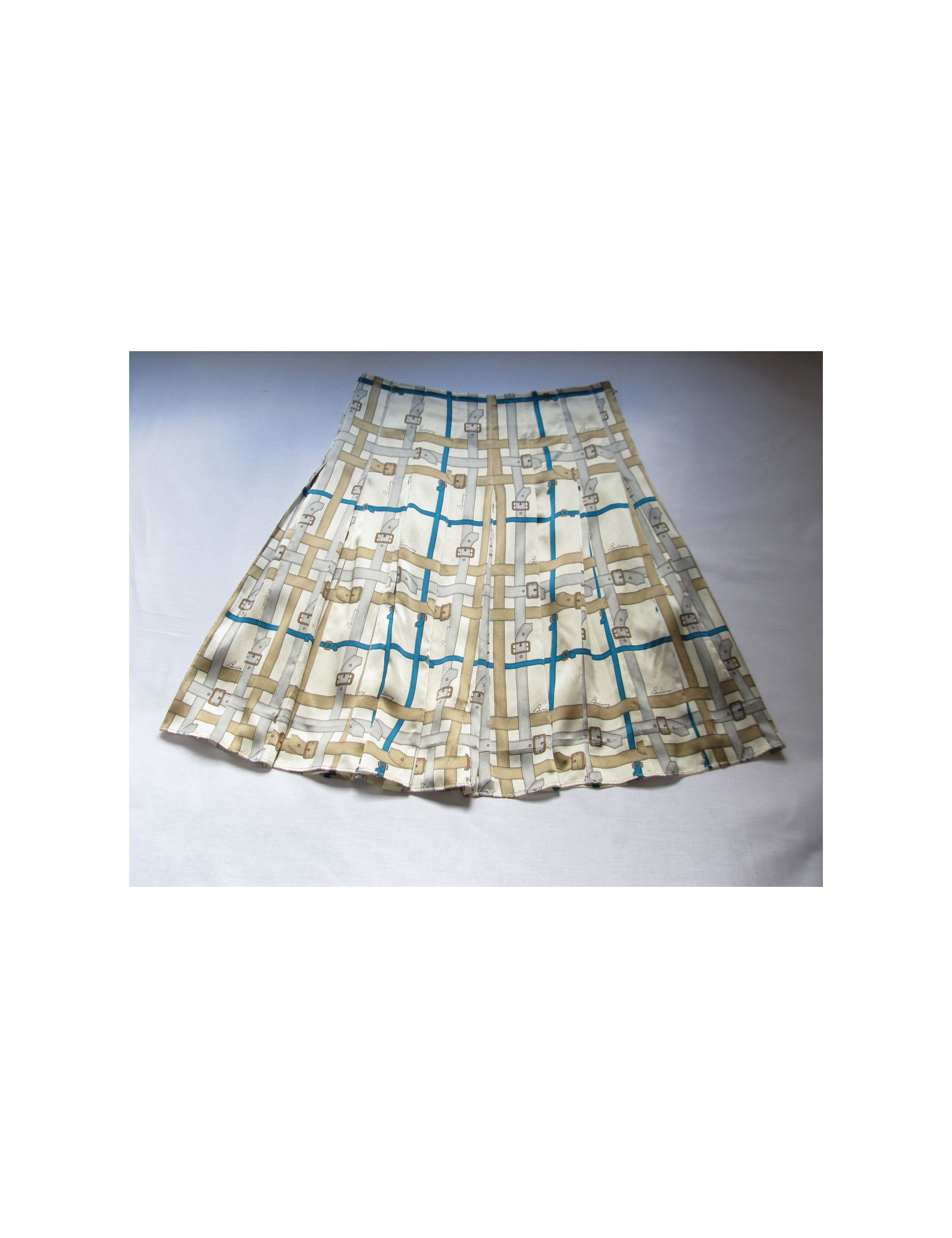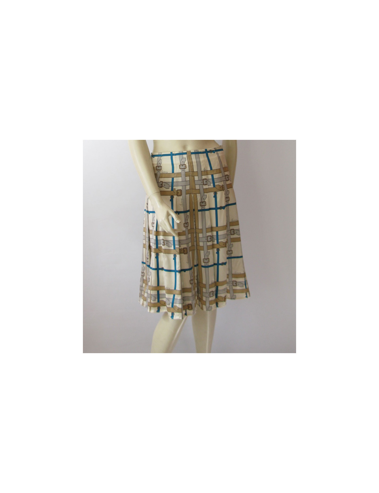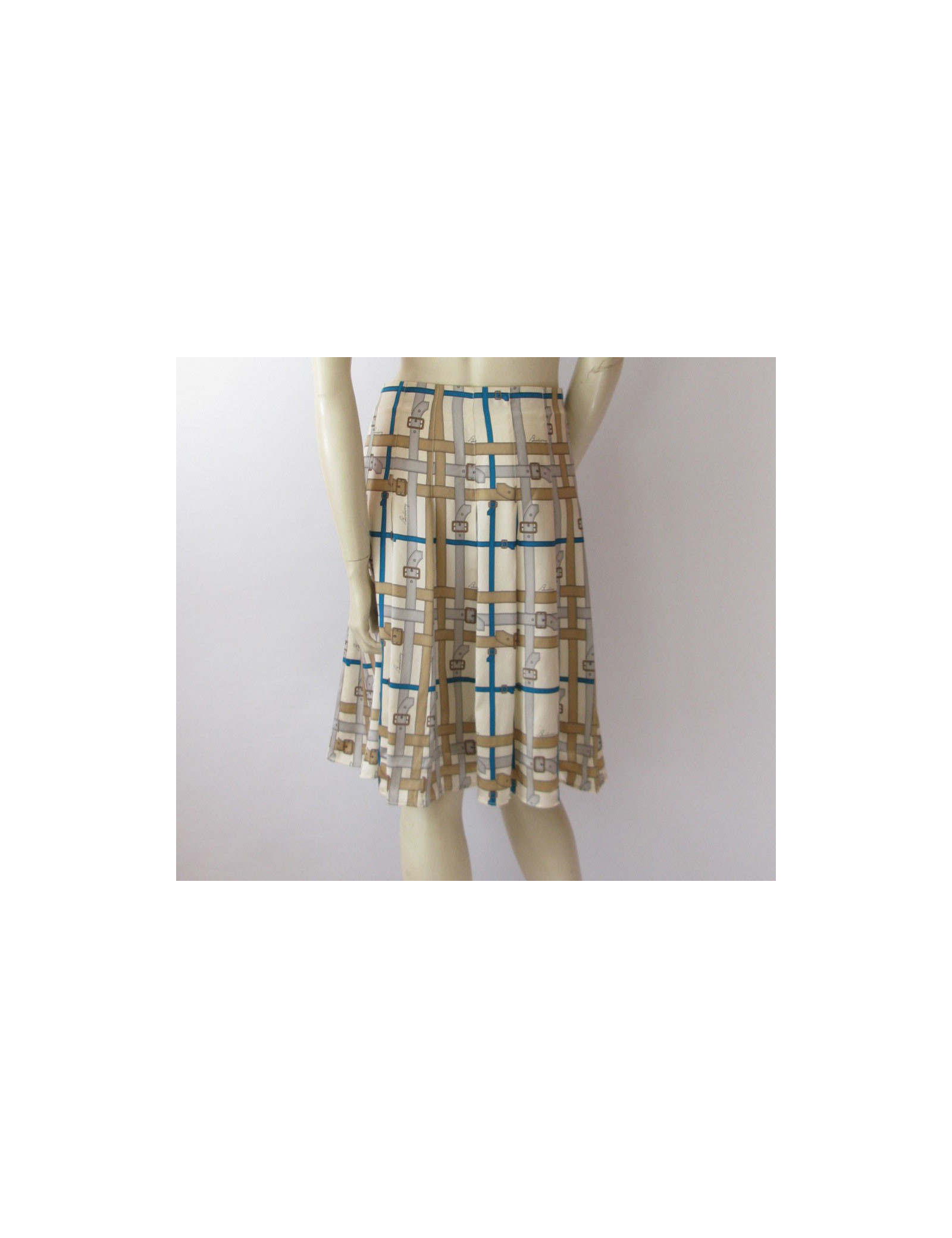 Aussi féminine que ravissante! Jupe BURBERRY London, taille haute, plissée en soie imprimée de motif sellier bleu, gris et camel sur fond beige.