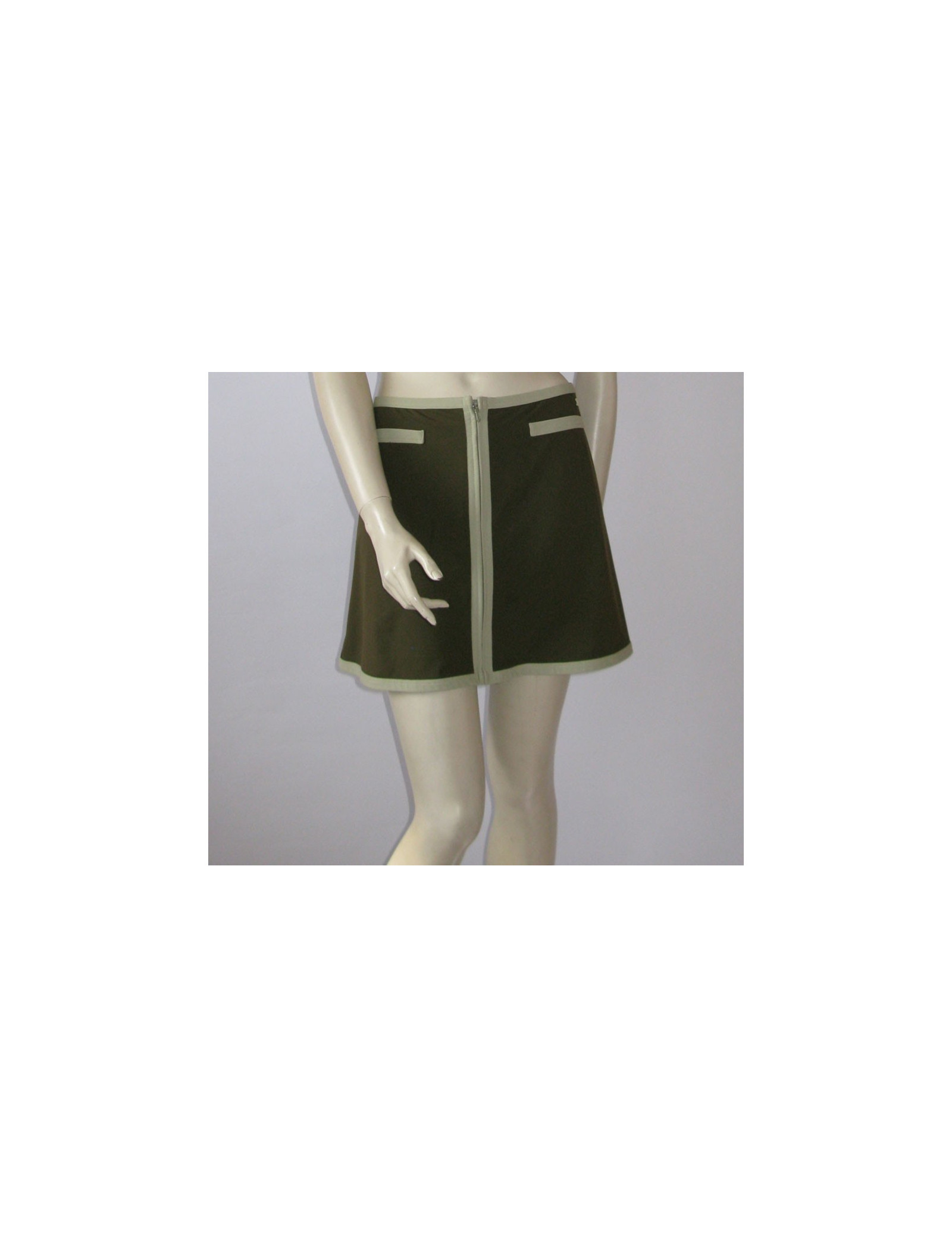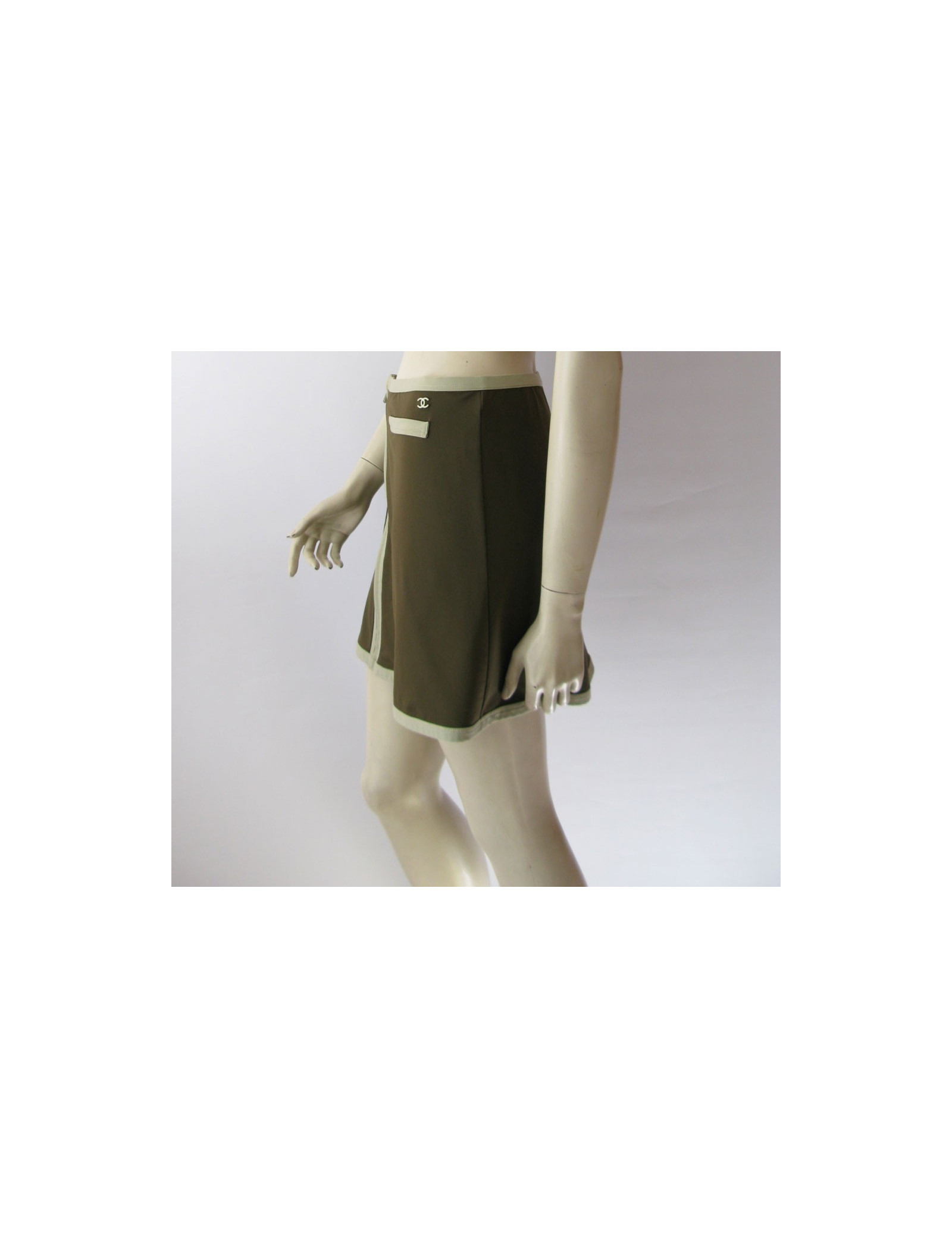 Séduisante! Jupe CHANEL kaki T40Fr, taille haute, ligne trapèze. 2 poches de décoration à l'avant. Jupe gansée d'une bande de couleur amande au tour de la taille, tout le long du zip de fermeture centrale jusqu'en bas, assortie au CC siglé sur la hanche gauche.